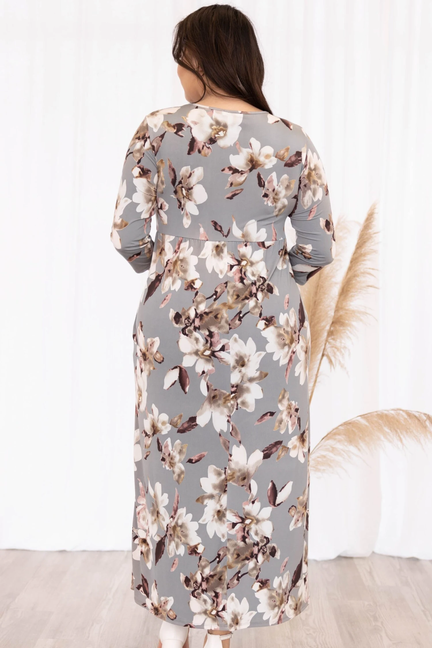 This maxi dress is amazing! This cutie has a stunning floral pattern and a trendy maxi length for max style! The gray color is so fun to pair with white accessories! Style it with some white heels and accessories for a super fab look!