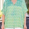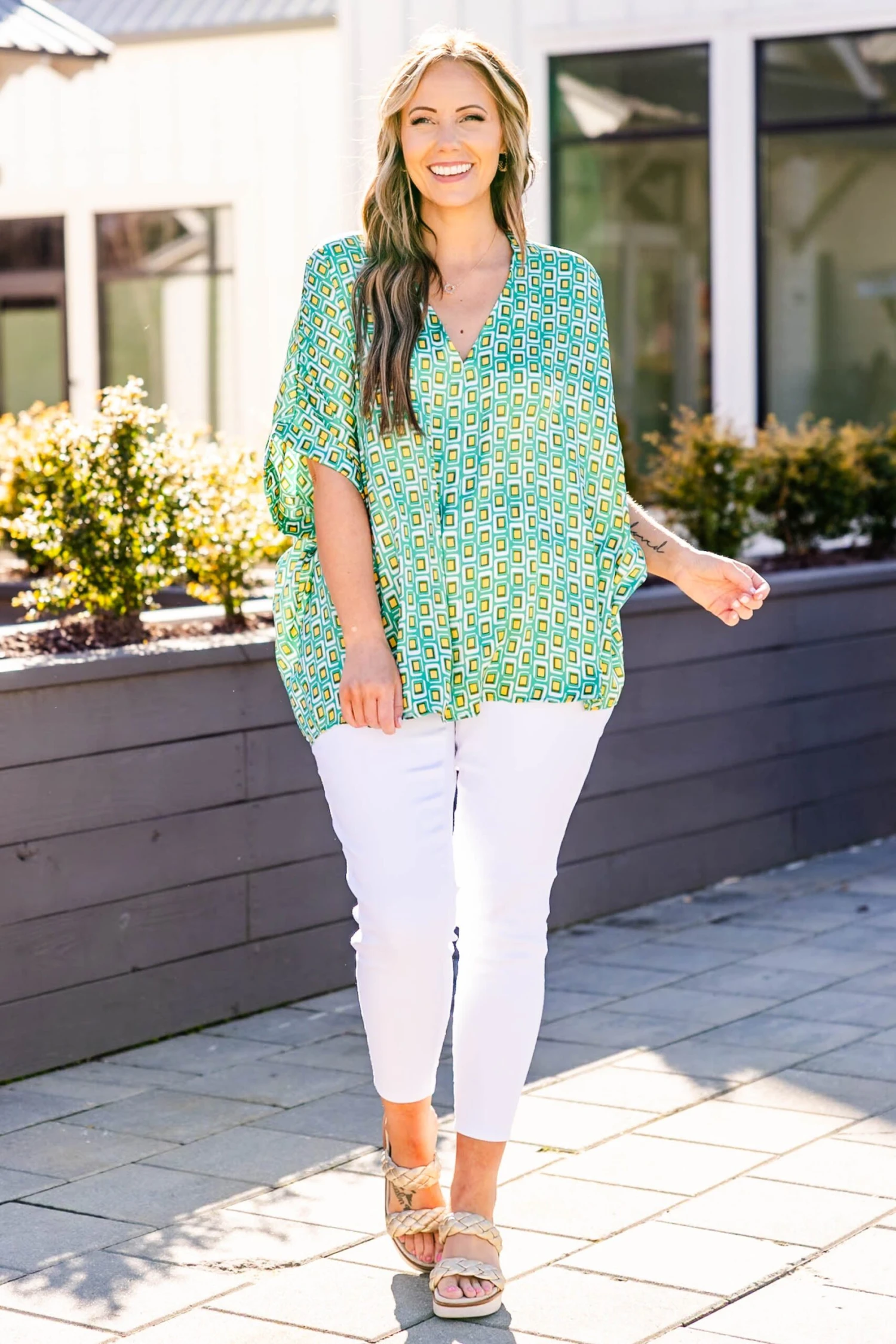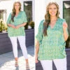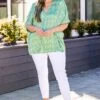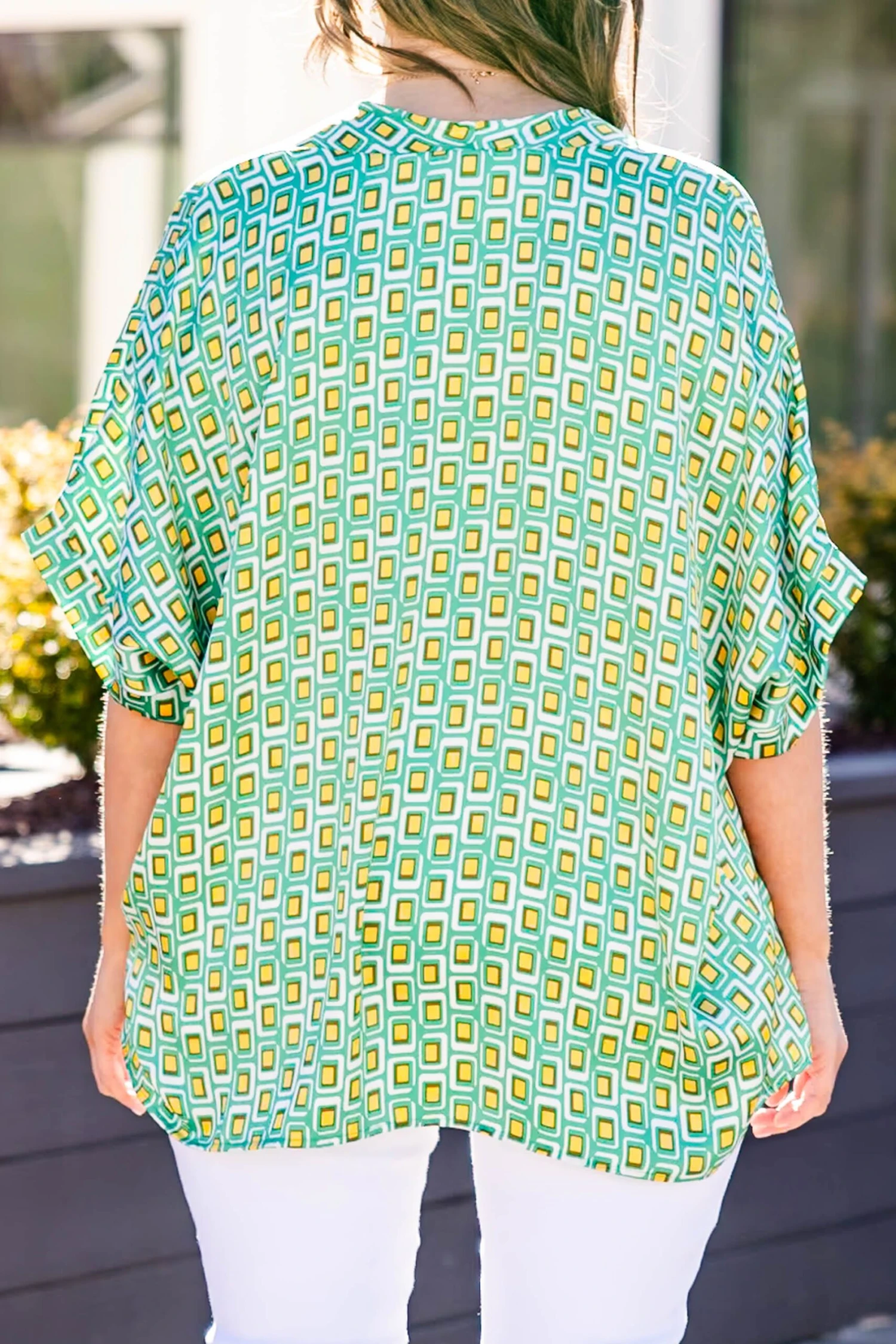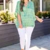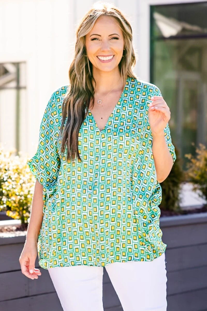 This top features a geometric design and a lovely green color that adds a touch of elegance to any outfit! Its flowy fit makes it perfect for both the office and a night out, providing both style and comfort!