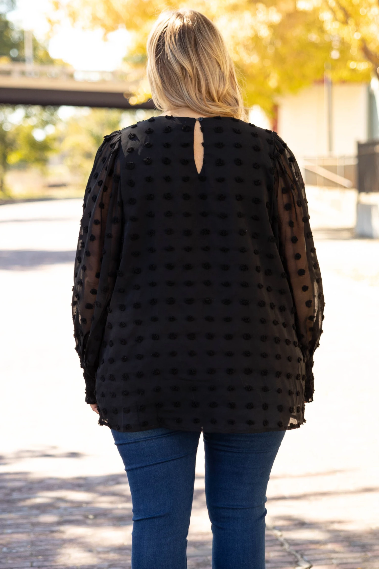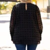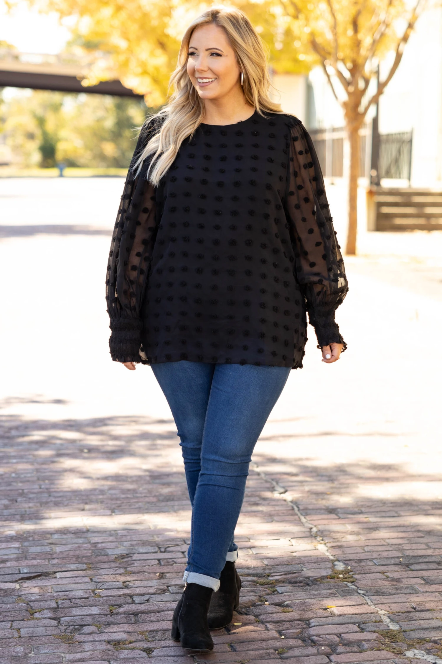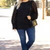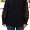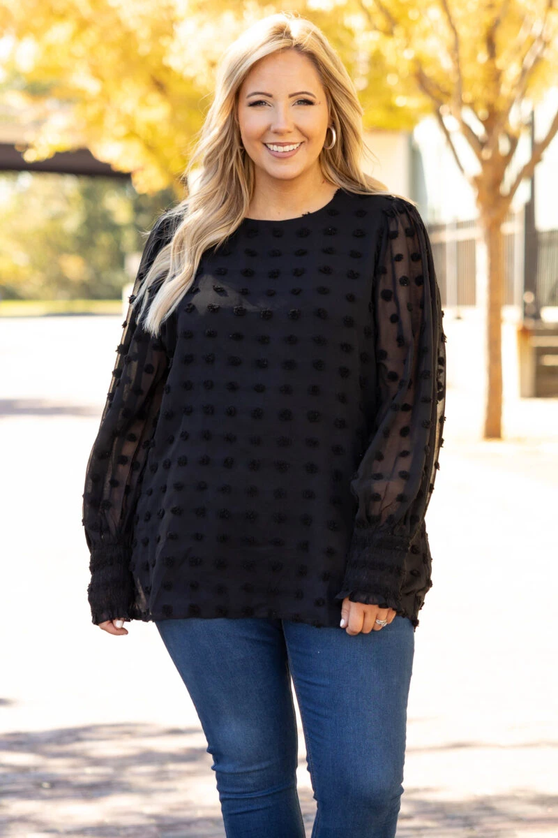 Our love for this top is never ending! This top has a beautiful black color with pretty swiss dots and smocking at the wrists that is easy to style for every occasion! Pair this top with skinnies and booties for an effortlessly chic look!