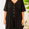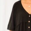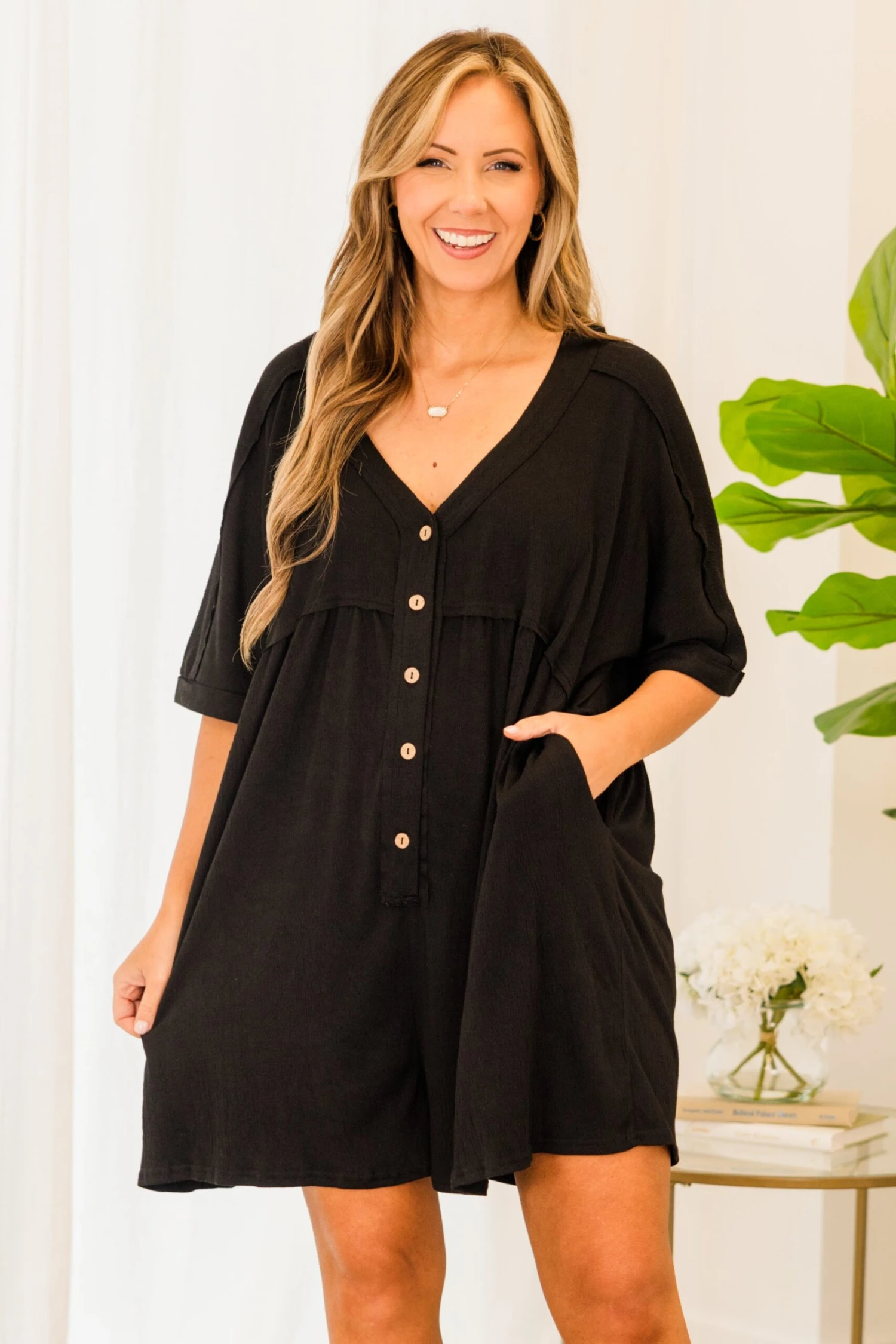 Throw on this beauty and head out for a day of fun! This romper in black is crafted from comfortable, stretchy material and features functional buttons and pockets! Perfect for day or night, this romper is a must-have addition to your wardrobe! Stay stylish and comfortable with this effortless piece!