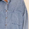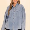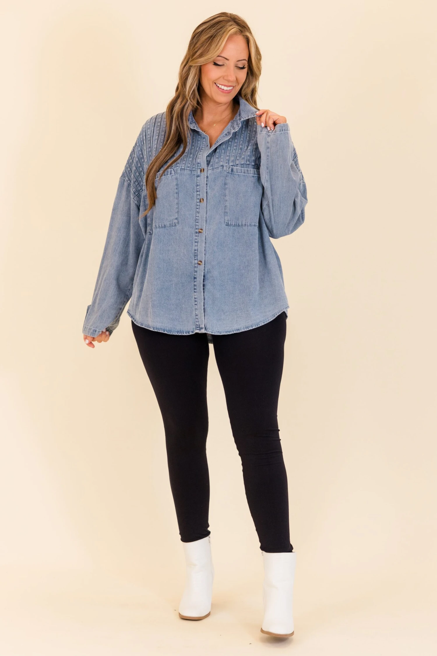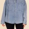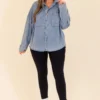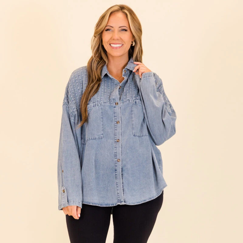 Get ready, because it’s Time To Go! This versatile light wash top offers pleated shoulder details for a touch of elegance, while its unique design allows it to be worn as a top or shacket! Perfectly paired with leggings and booties, it’s the perfect addition to your wardrobe for any occasion! Don’t miss out on this must-have piece!