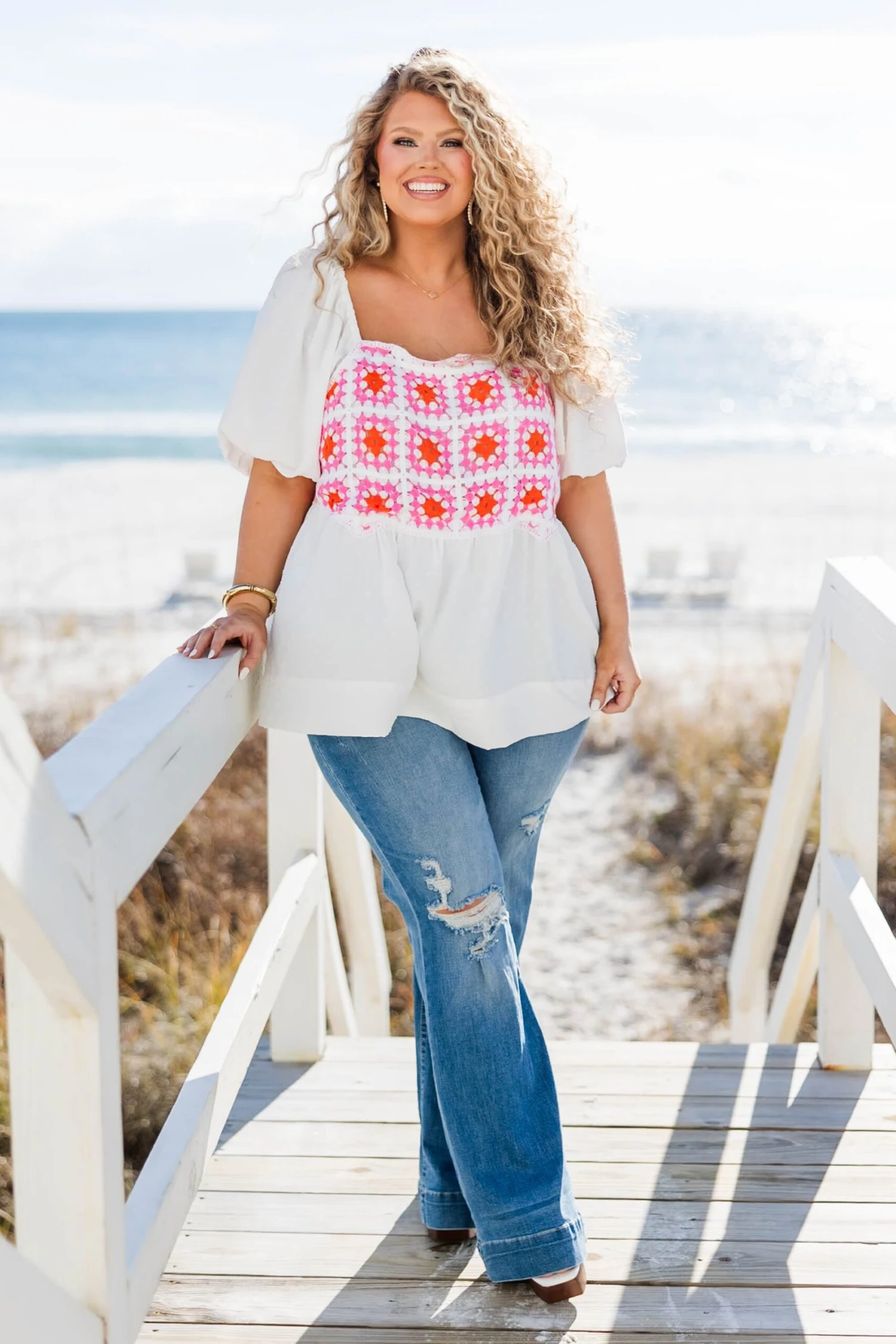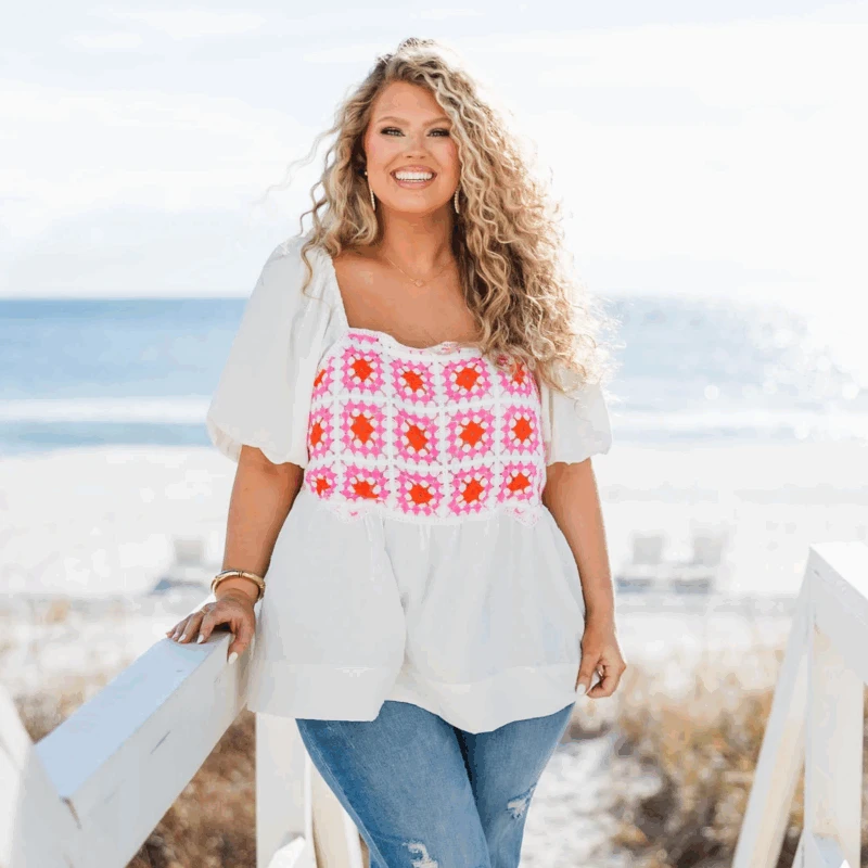 We are so in love with this top! Indulge in the flirty and feminine style of this beauty! The classic white color and delicate crochet design give a romantic touch, while the babydoll silhouette and bubble sleeves add a playful style! Perfect for any occasion, this top is a must-have in your wardrobe!