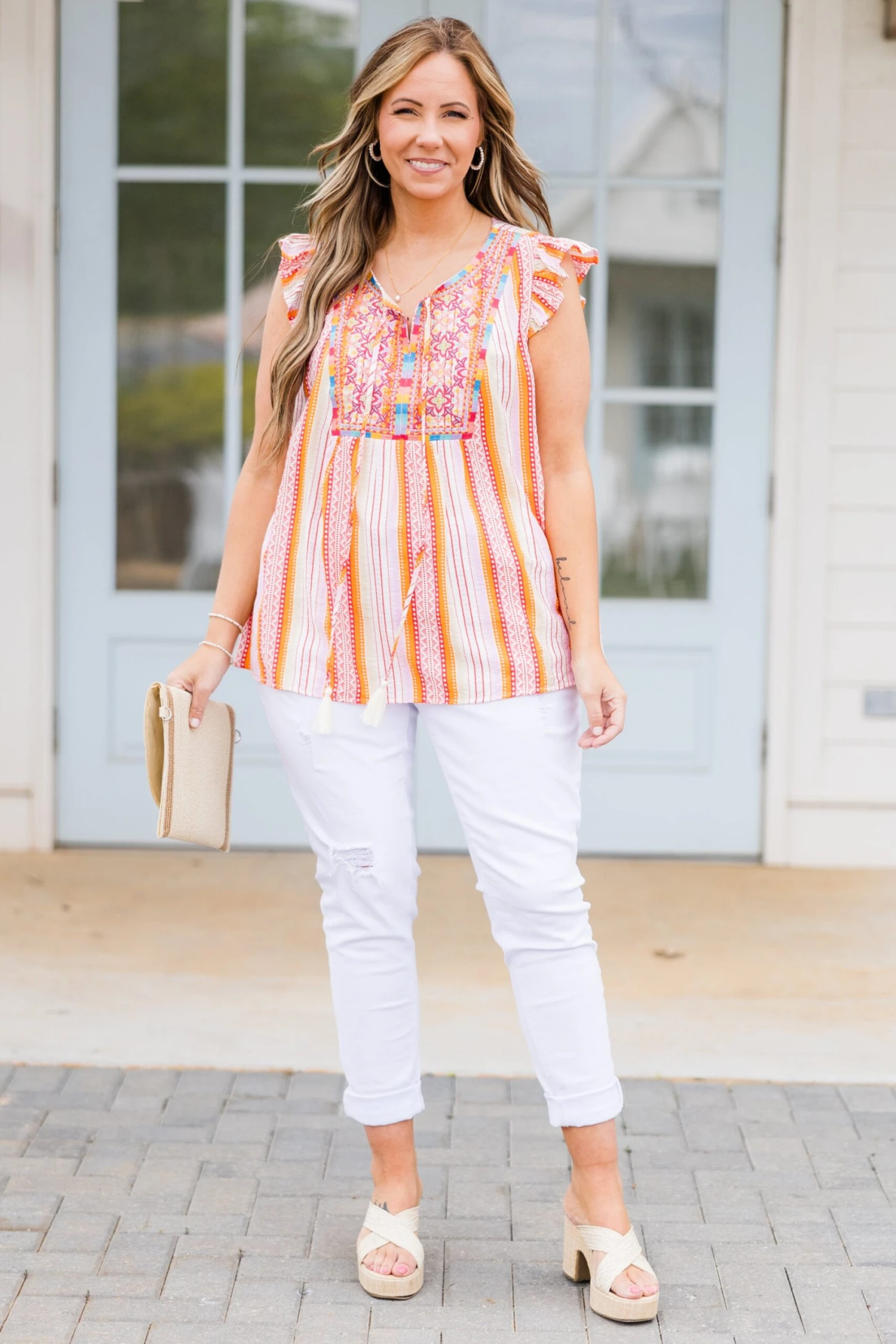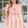 Make friends in style with our “To Building Friendships Top” in Rust! This bold top features charming ruffle detailing and playful embroidery, while the tassel ties add a touch of fun! The bold colors are perfect for the season, making it a must-have for any fashion-forward friend!