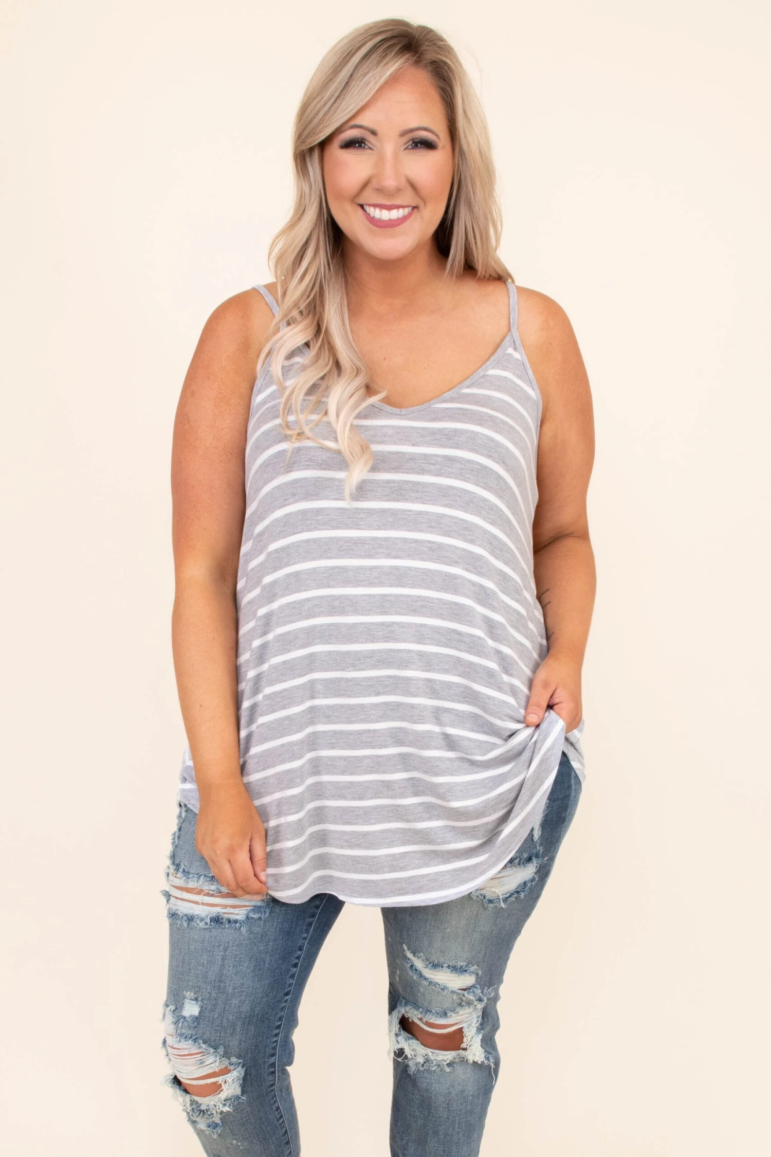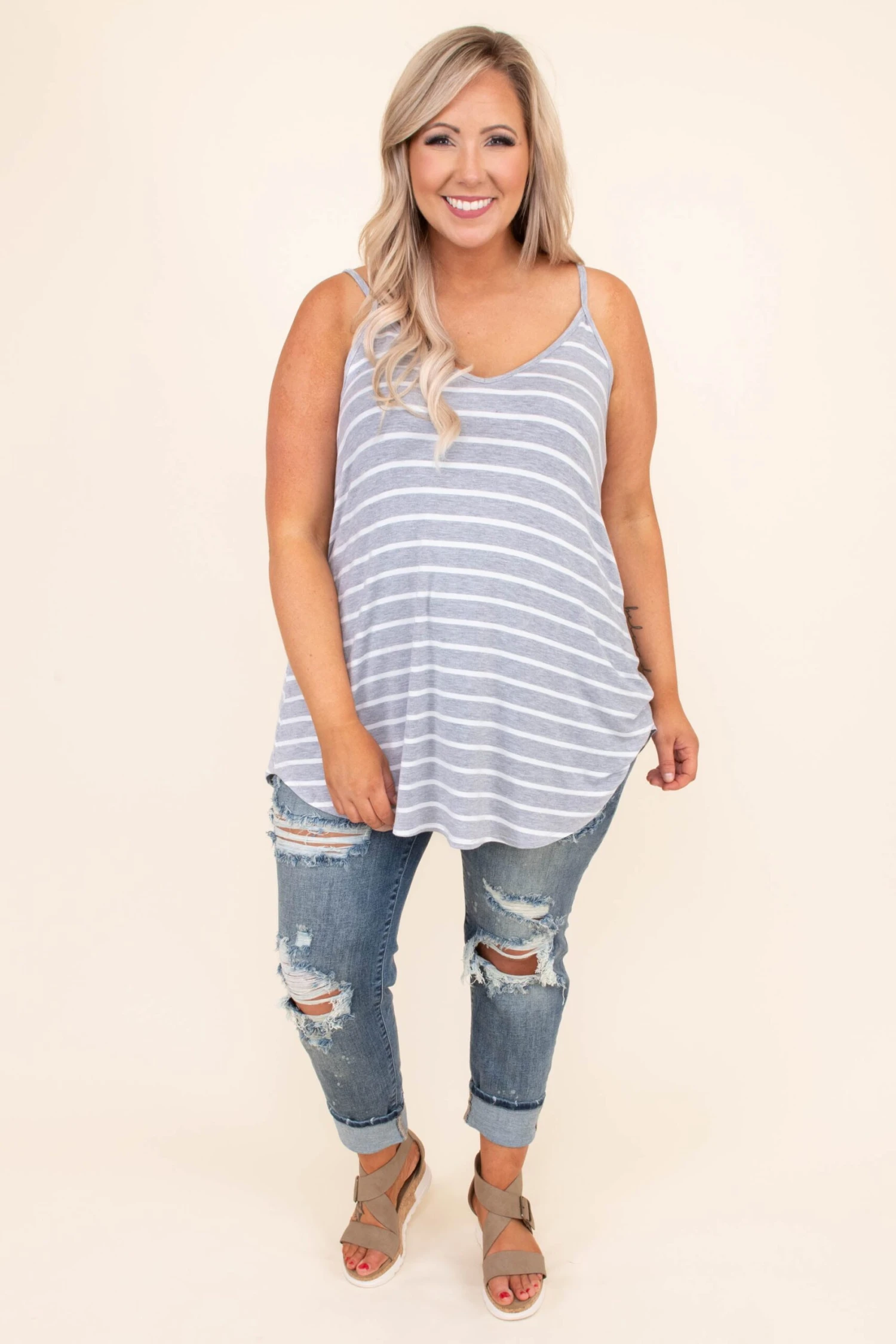 This top was made for a day at the beach! This tank has a simple stripe pattern with colors that are perfect for the season! It’s easy to style with your favorite shoes and accessories, has a flattering fit, and features a lightweight fabric you’ll want to wear all day long! Style this tank with shorts and sandals for your next vacation!