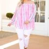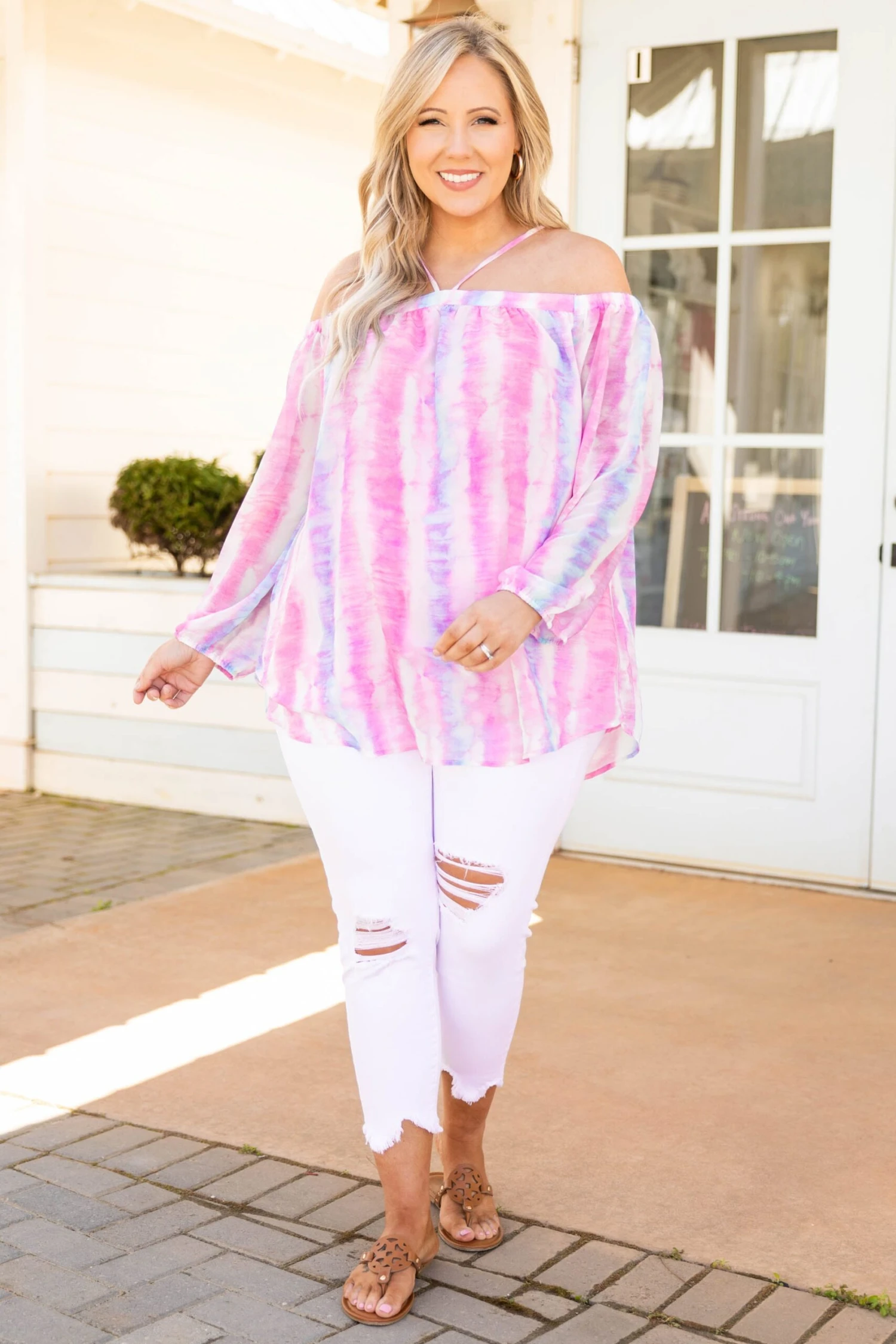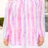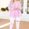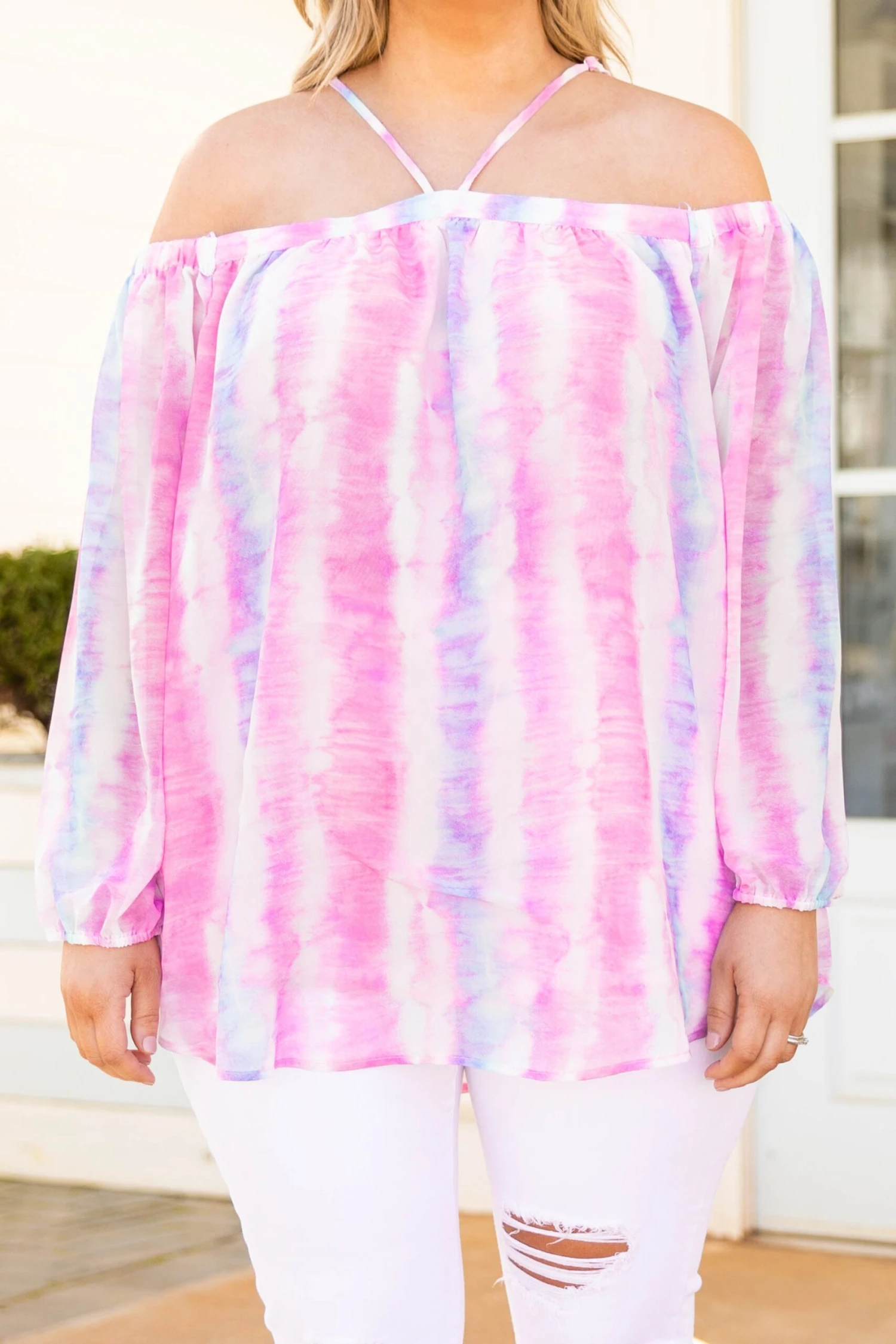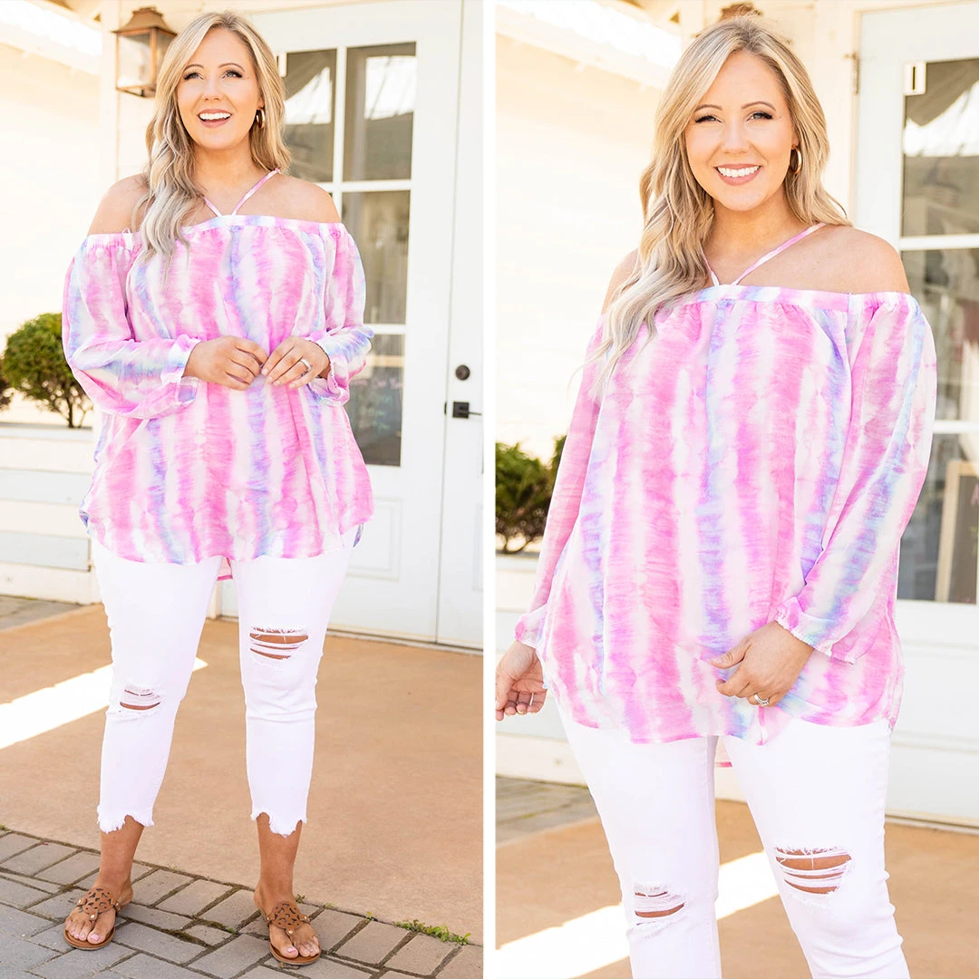 This is the perfect blouse for a top down cruise! This cutie has an off the shoulder halter neckline with adjustable straps for a super unique look! The tie dye pattern is so trendy and the pink and blue colors work SO good together! The back has an elastic band so you can comfortably wear this top all day! Just pair it with some white denim and sandals and you have an amazing look!