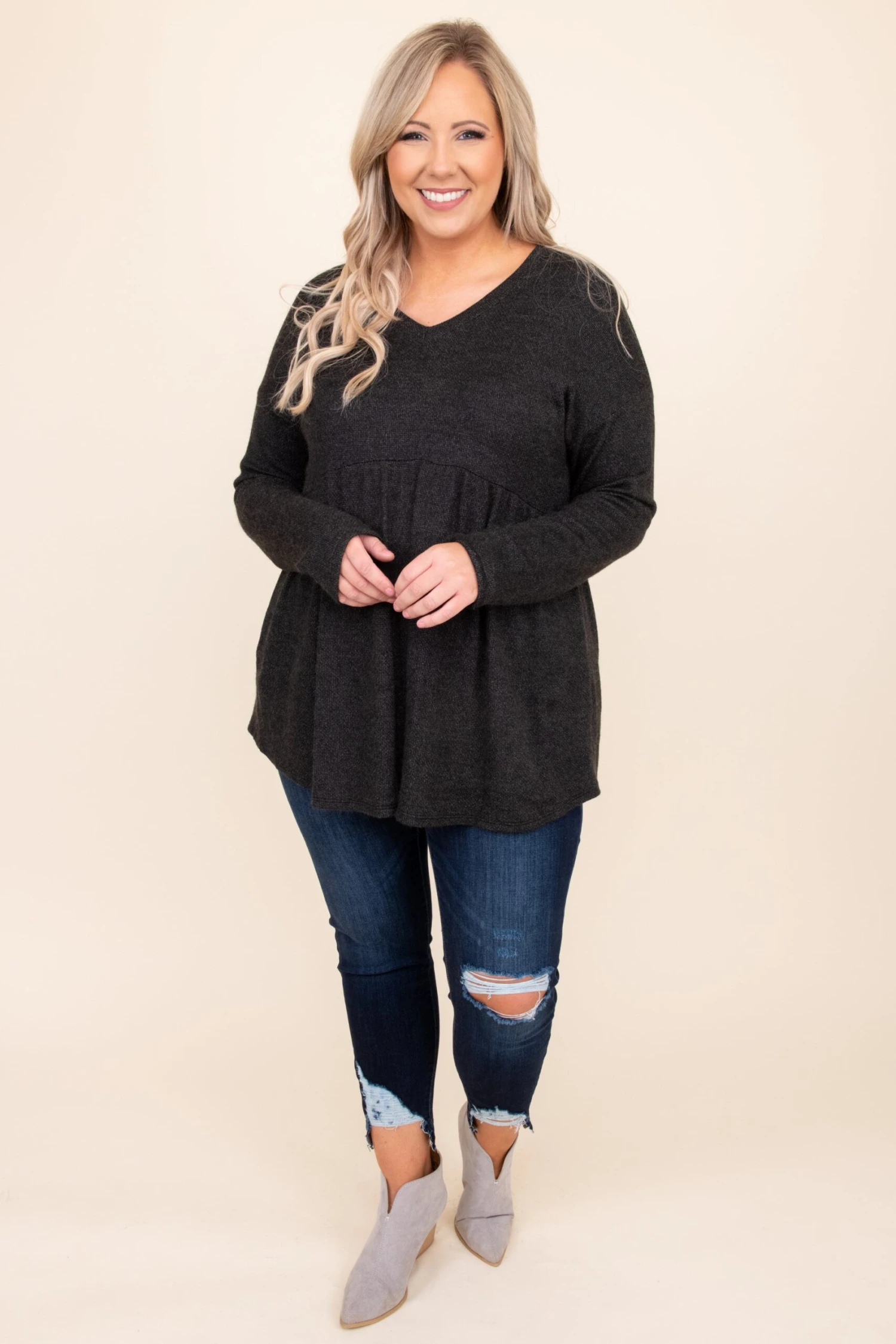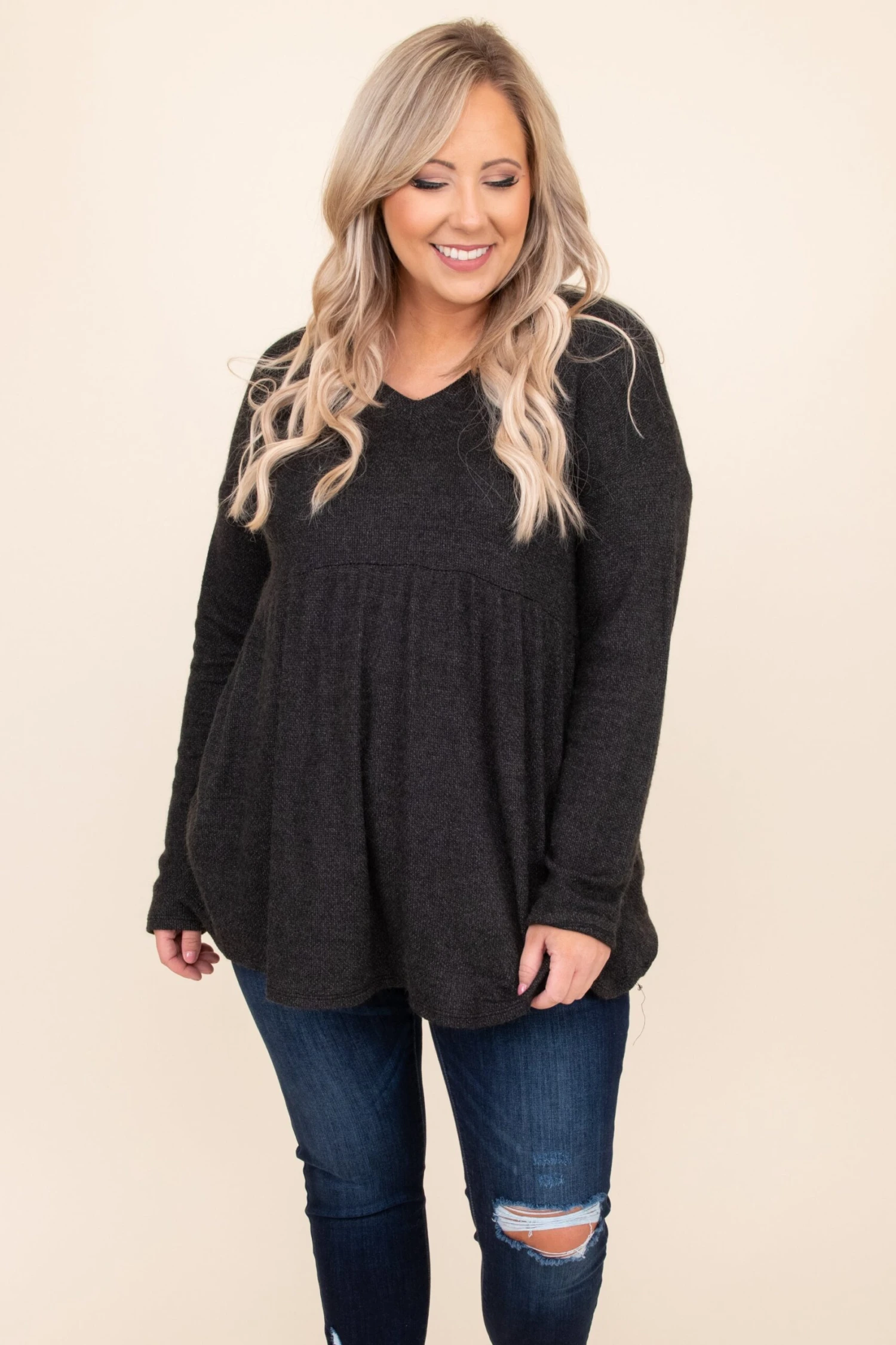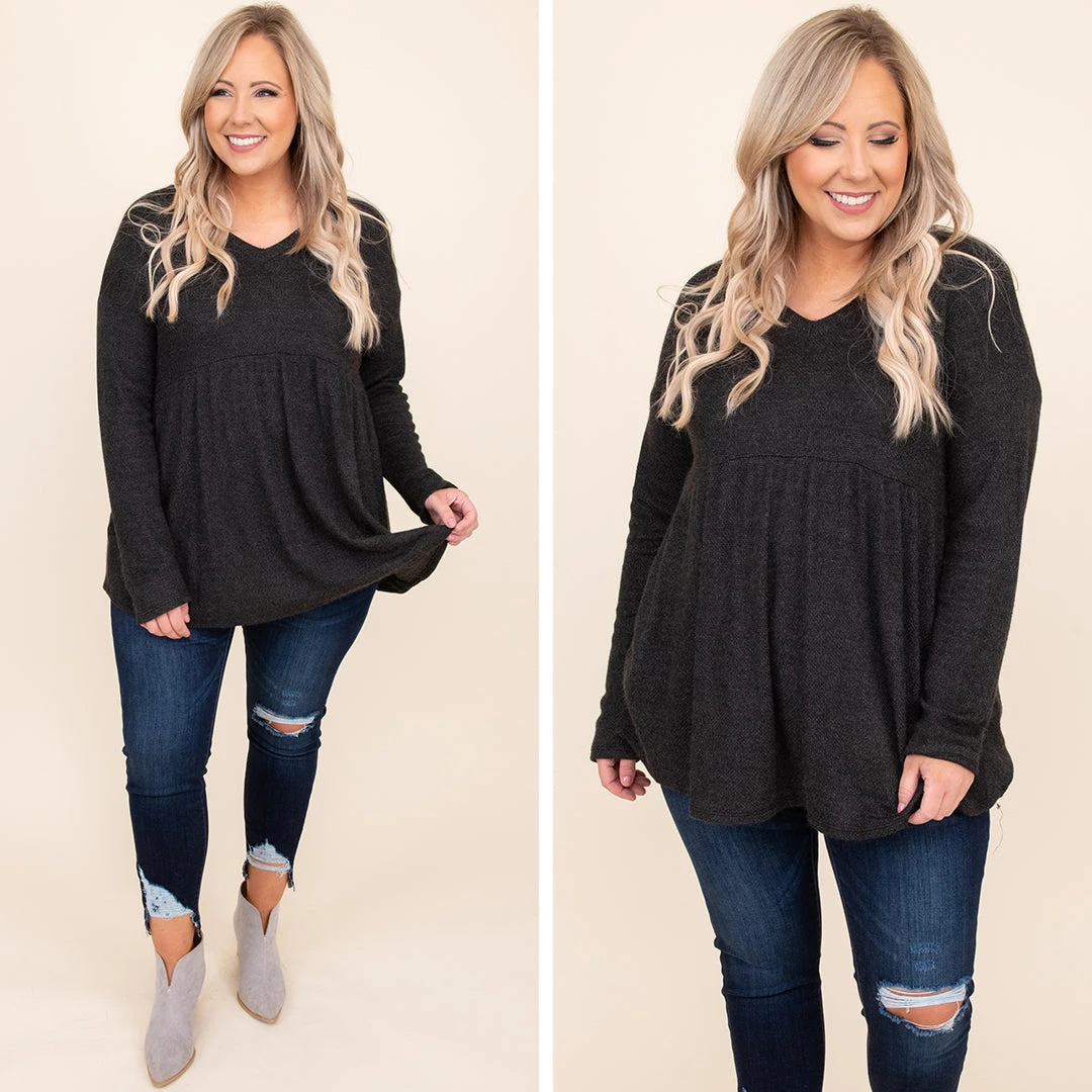 We know you will look fab heading into the city in this trendy sweater! It serves as the perfect basic sweater to add fun accessories and even a vest! It has a figure flattering babydoll hemline and is neutral in color to pair with all of your faves in your wardrobe! It features a soft material that will keep you warm for all of your outings! We see this paired with distressed skinny jeans, booties and a fabulous scarf!Â