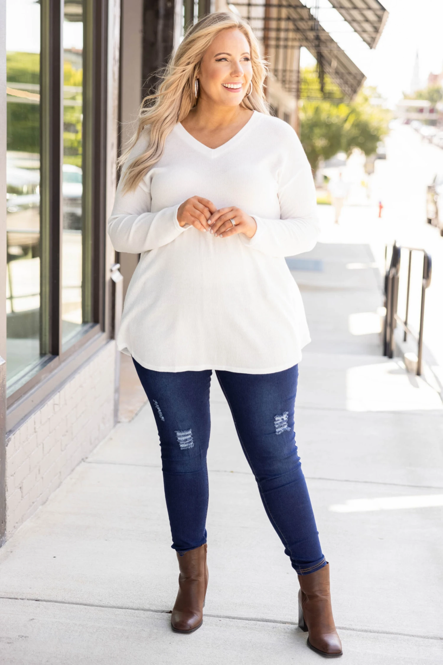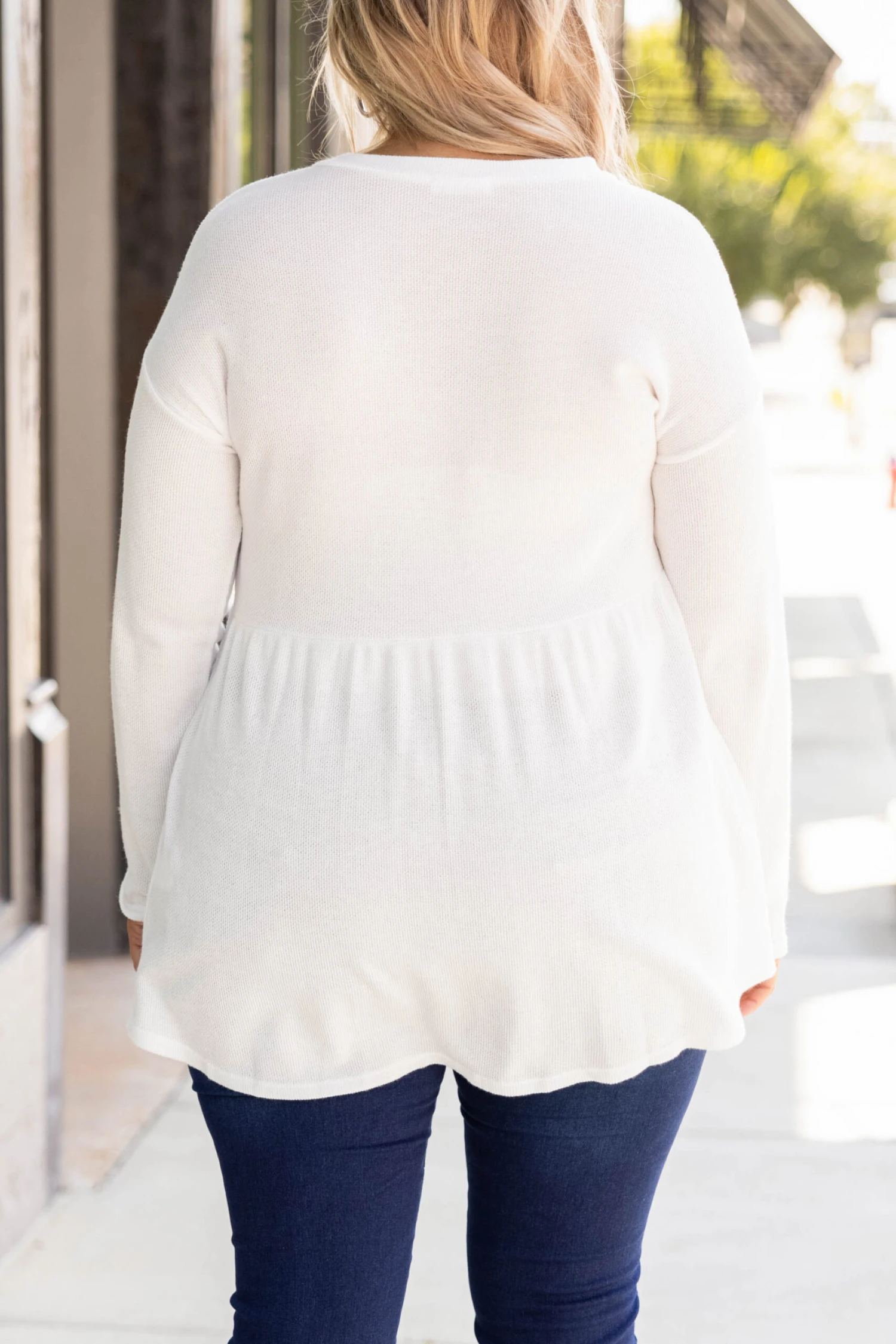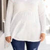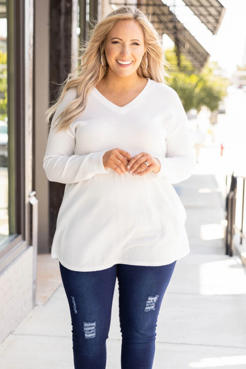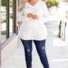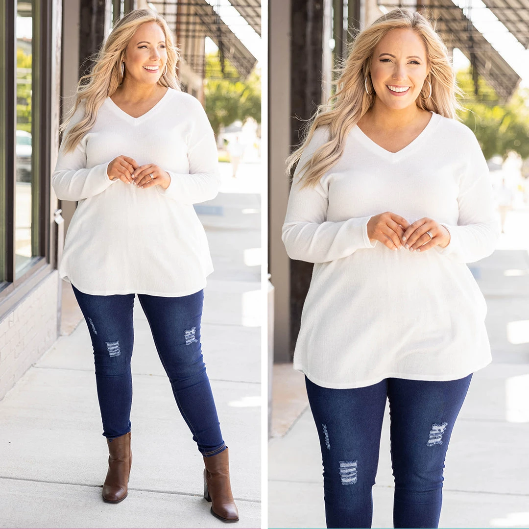 We know you will look fab heading into the city in this trendy sweater! It serves as the perfect basic sweater to add fun accessories and even a vest! It has a figure-flattering babydoll hemline and is neutral in color to pair with all of your faves in your wardrobe! It features a soft material that will keep you warm for all of your outings! We see this paired with distressed skinny jeans, booties, and a fabulous scarf!Â