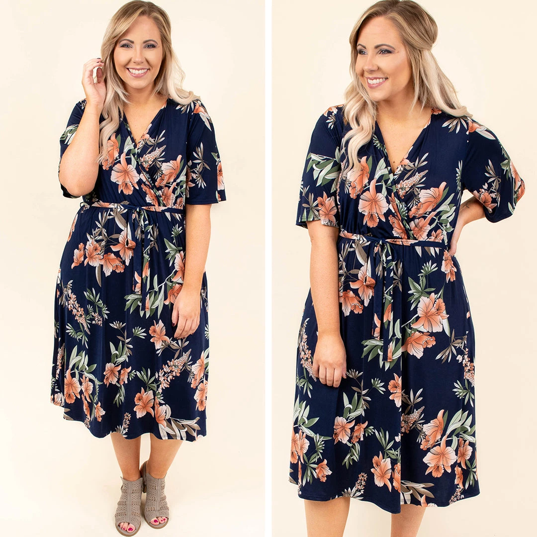 No matter the direction you’re traveling in, this dress is sure to please in every city! It has a beautiful floral pattern for Summer with a chic navy color that can’t be beat! The neckline is too cute and the fit is sure to flatter every figure! Wear it with booties or heels for your next event!Â