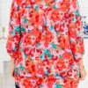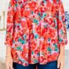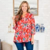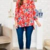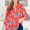 Grab this beauty for your next adventure! It features a wrinkle-free, easy care design, making it the perfect choice for looking and feeling great all day long! The lovely red multi color and beautiful pattern add a touch of sass that is just in time for the season! Pair with your favorite bottoms and accessories for classic chic look!