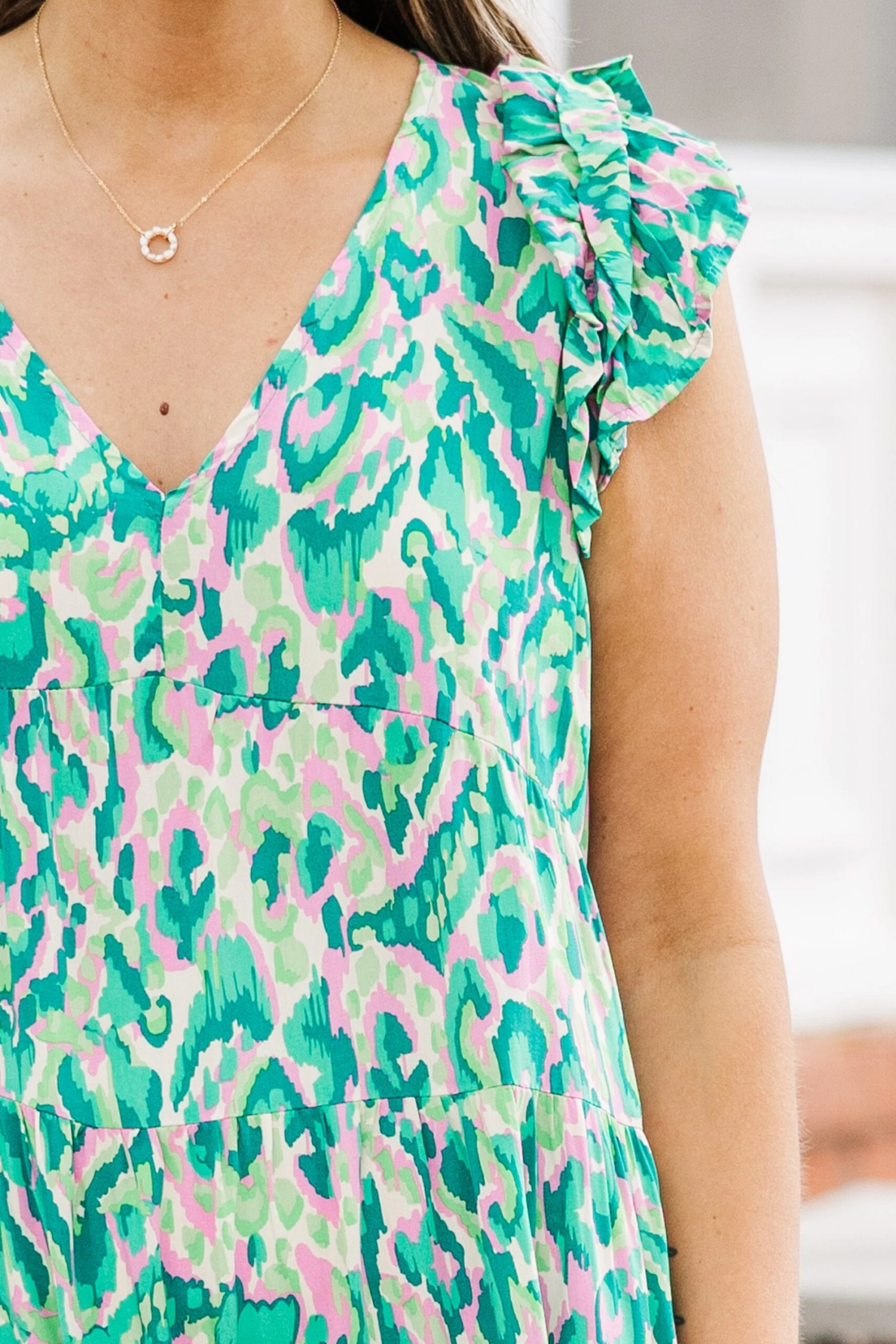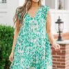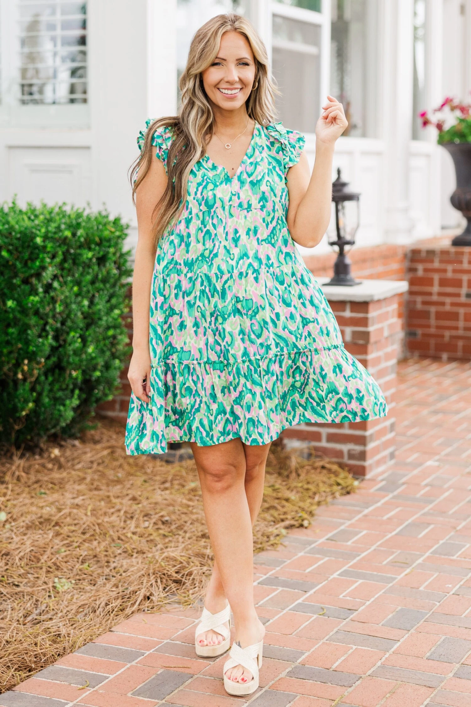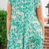We are so in love with this FAB dress! The flutter sleeves and flowy fit create a flirty and lightweight look! The abstract design adds a touch of sophistication, making it the perfect dress for any occasion! Experience true happiness with this must-have addition to your wardrobe!