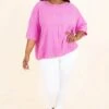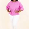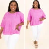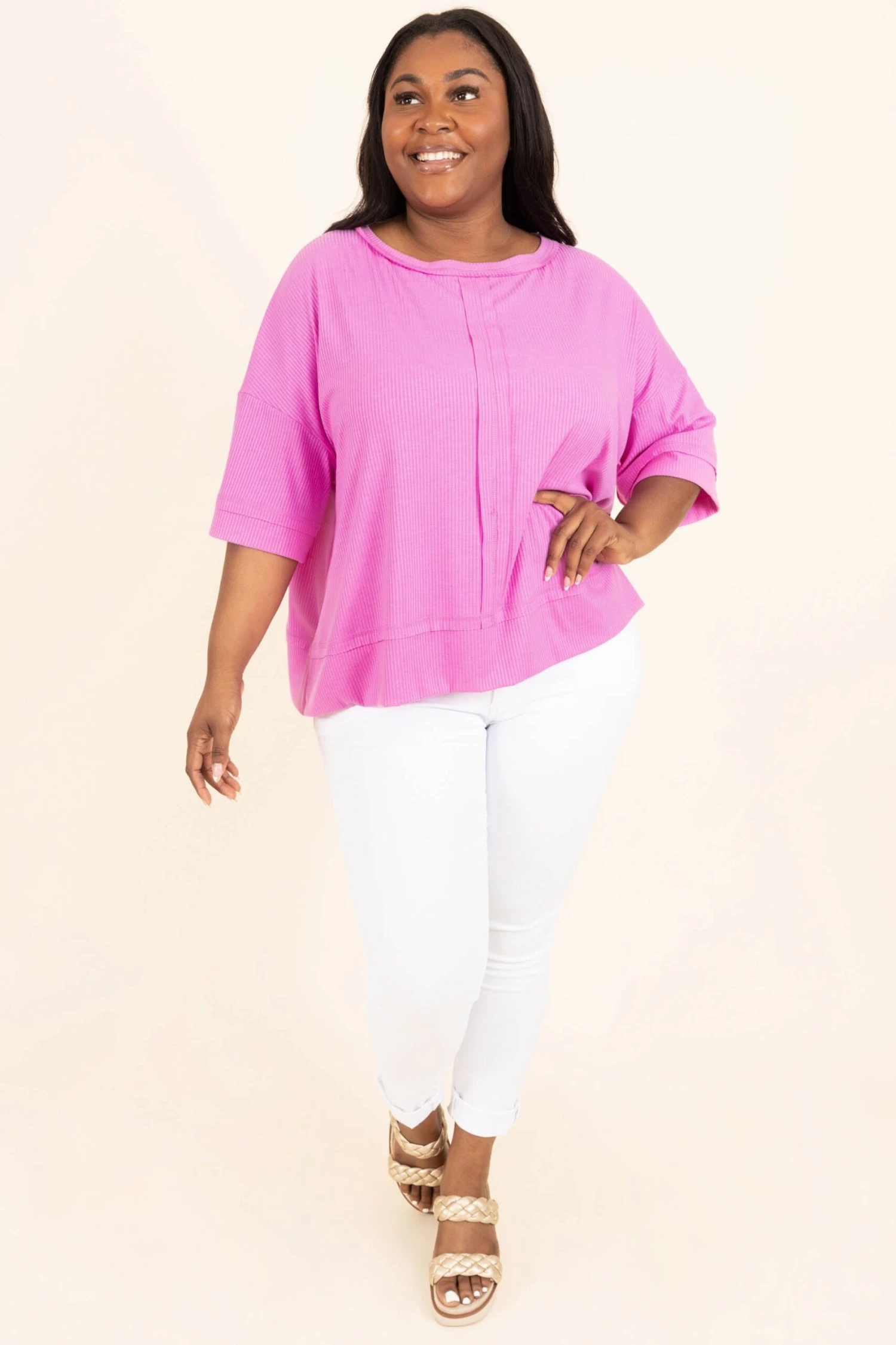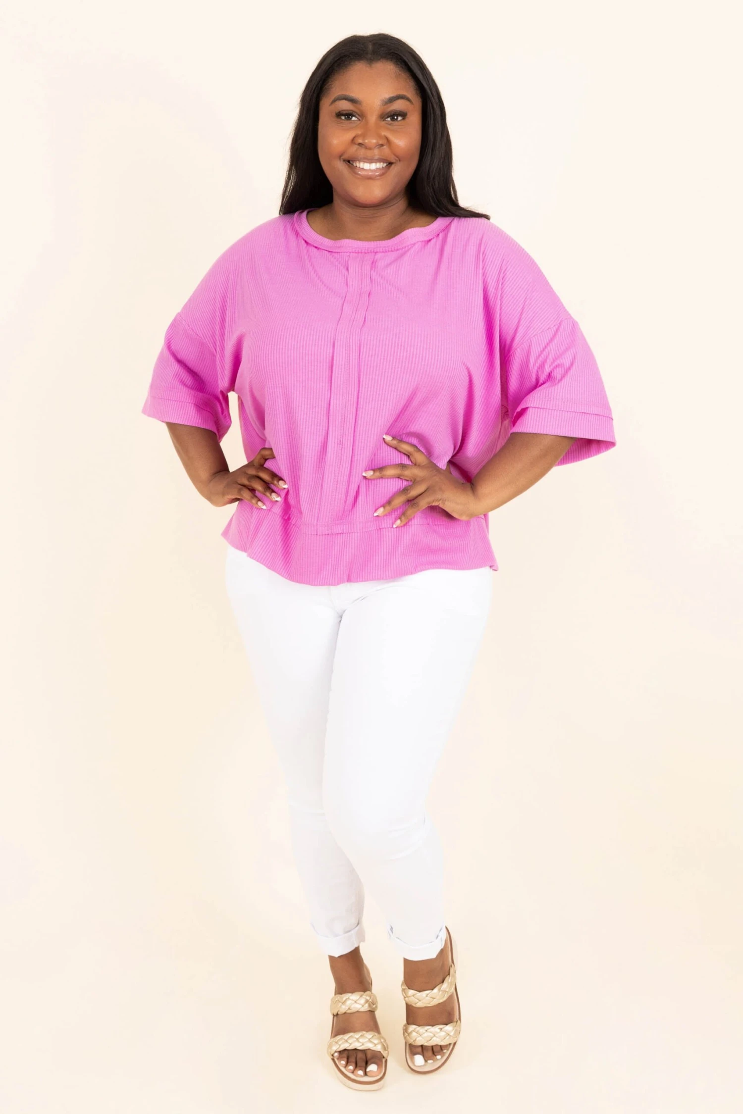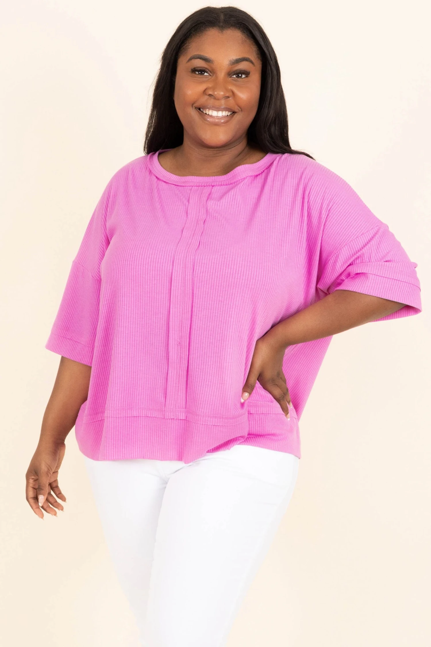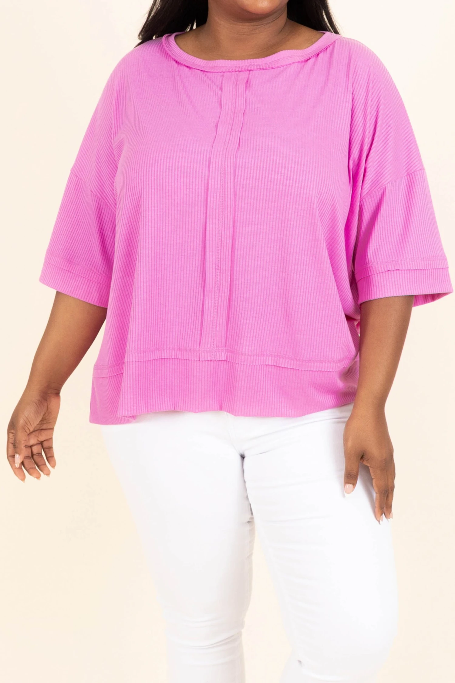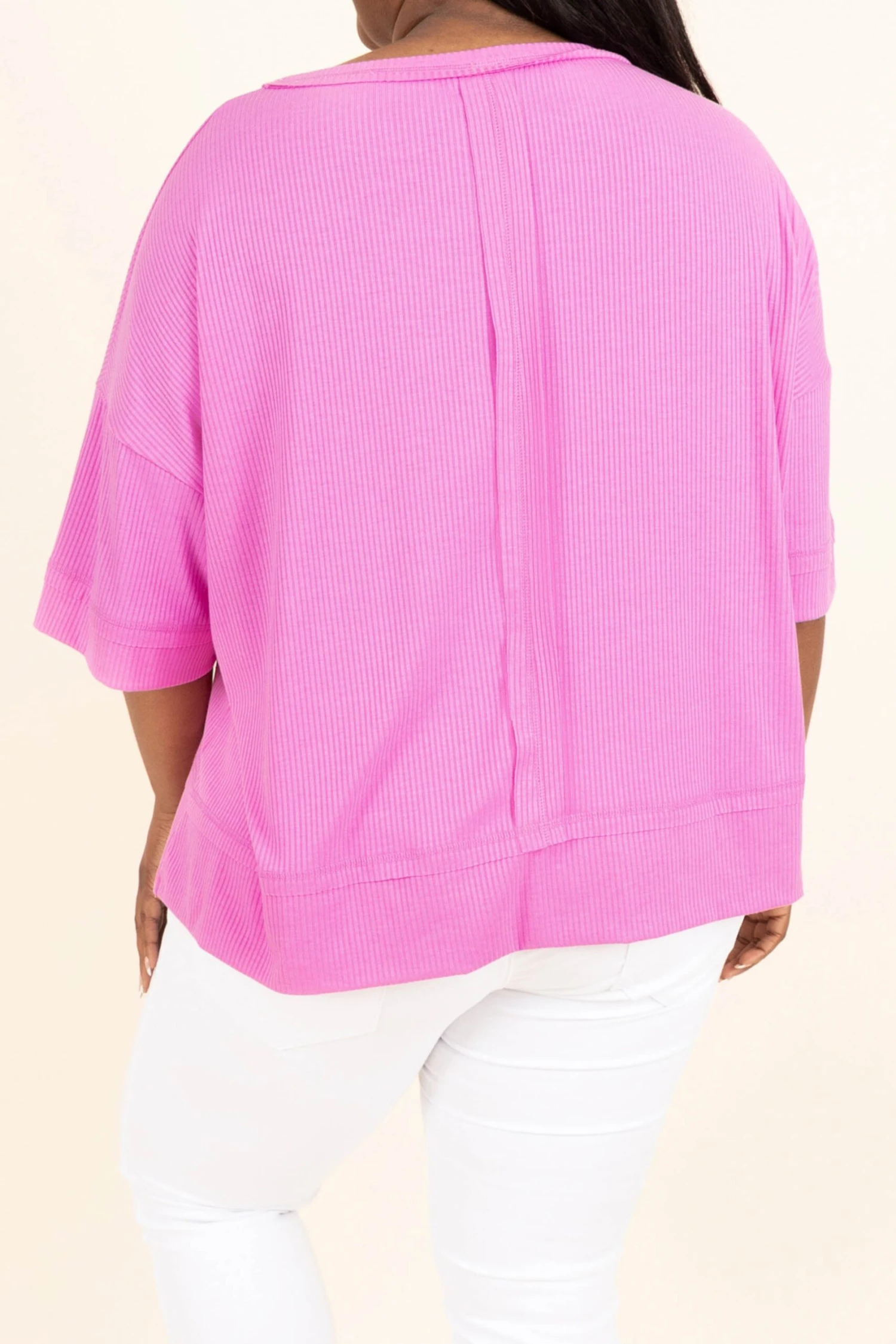 We simply LOVE this top! It has a bright mauve color with a ribbed texture that is super comfy and sweet! The stretchy, figure flattering fit is perfect for pairing with all of your favorite jeans and leggings! Style this top with some skinnies or shorts for a casual chic look!