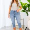 Get ready to turn heads with our Try Harder Capris in blue! These capris feature a button fly and distressed hem, adding a unique touch to your look. So go ahead, and stand out in style!