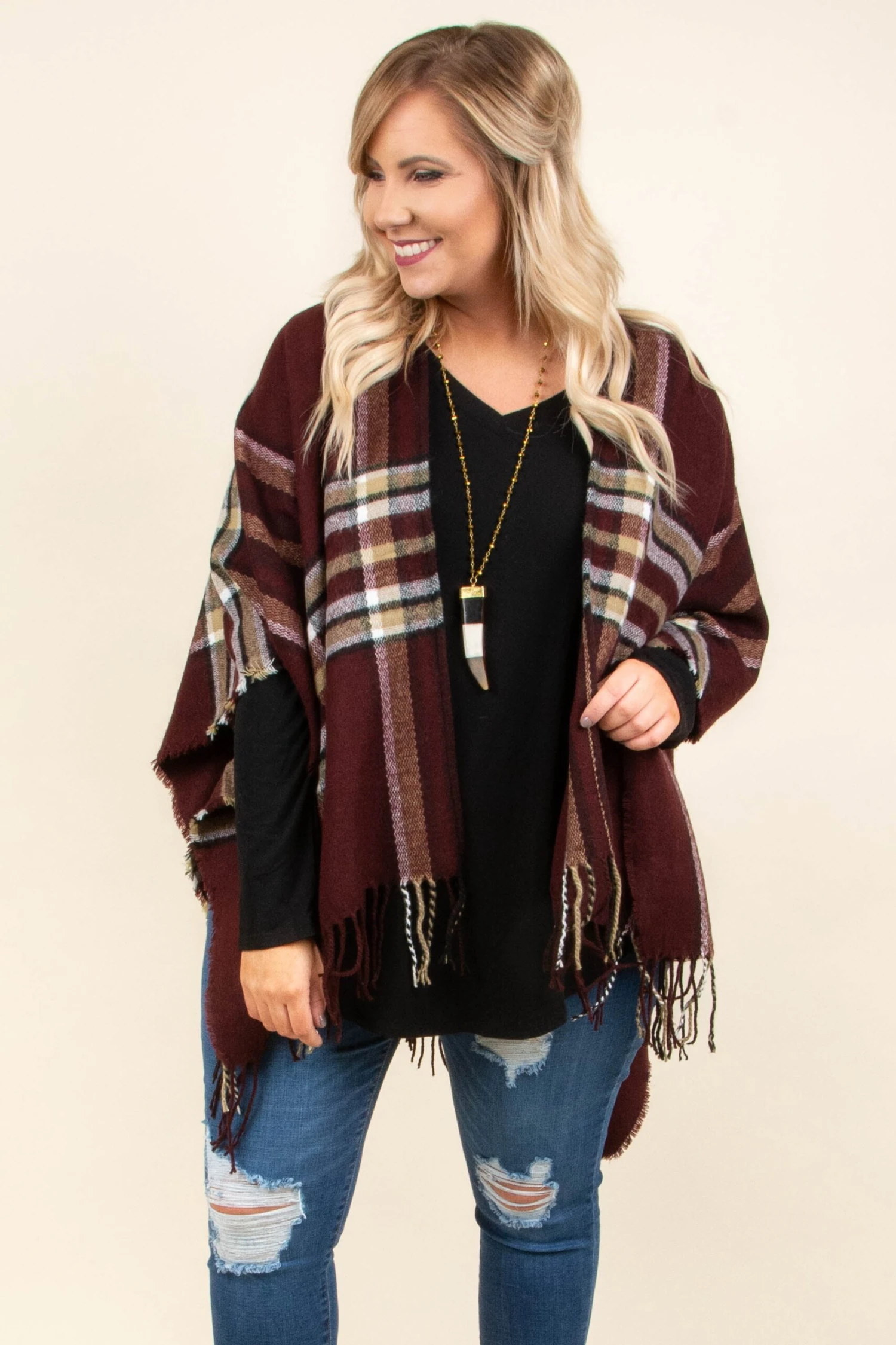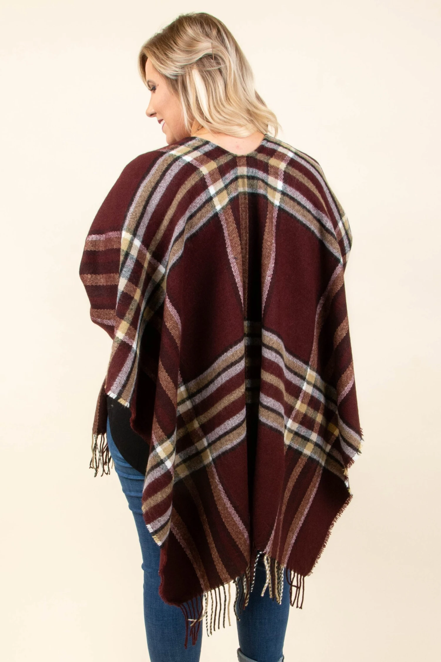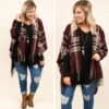 You are sure to look twice as nice in this sweet poncho! We can’t get enough of these closet staples this season, and we know that you’re going to LOVE our latest style! The classic plaid print combined with this deep red color is perfect for dressing up any basic pieces in your collection. Throw it over a black top with skinnies and boots for an easy outfit that everyone will love!Â