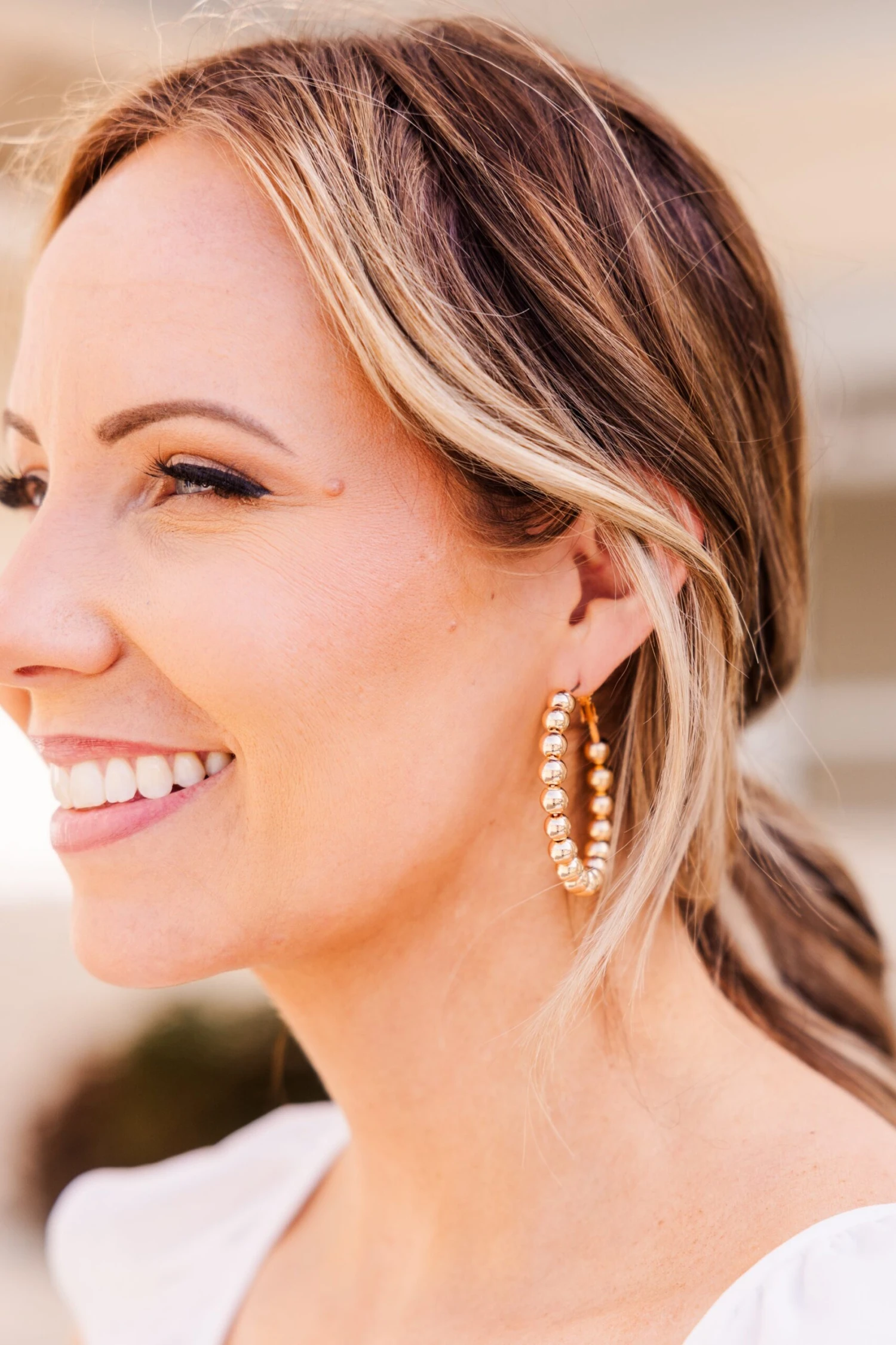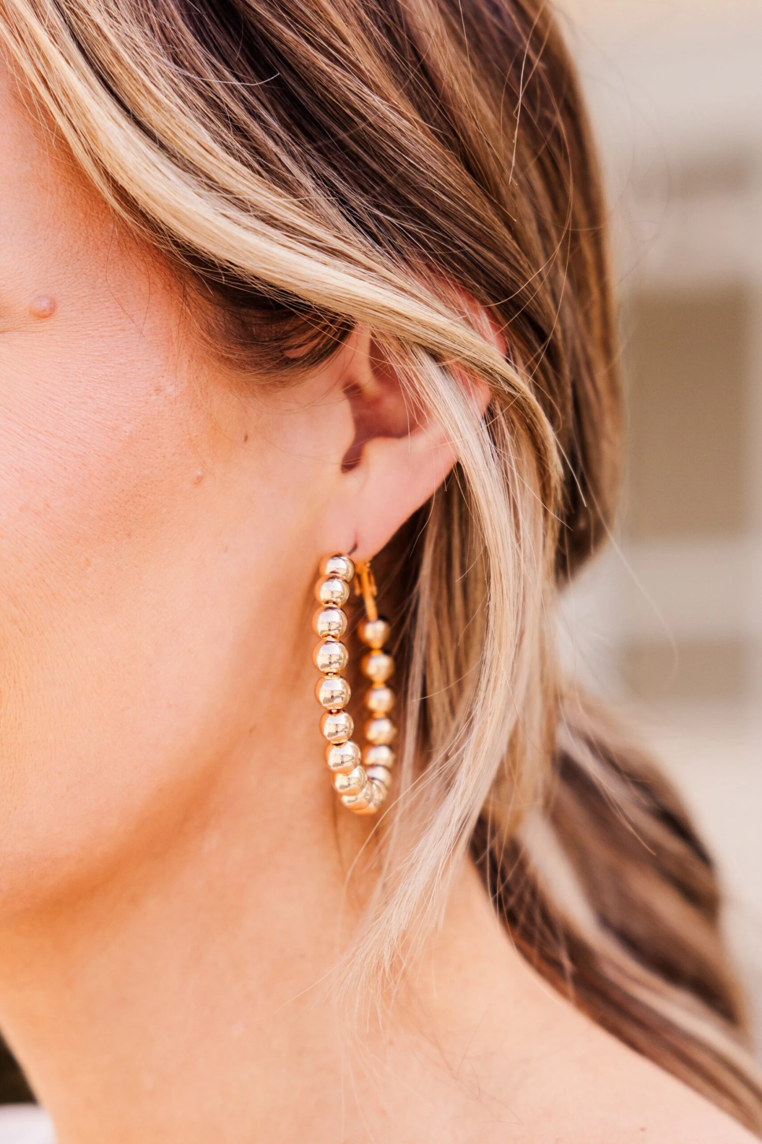 We simply adore these dazzling earrings! They are a must-have for any jewelry collection! The closed hooped design, beaded style, and classic gold color adds a touch of elegance to any outfit! Versatile and timeless, they pair well with all of your favorite ensembles all throughout the season!