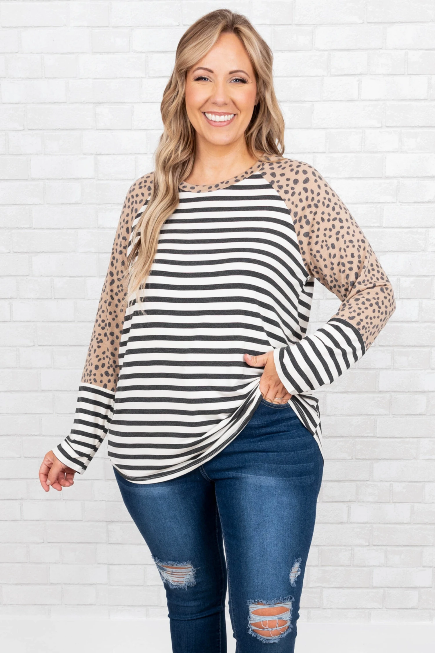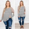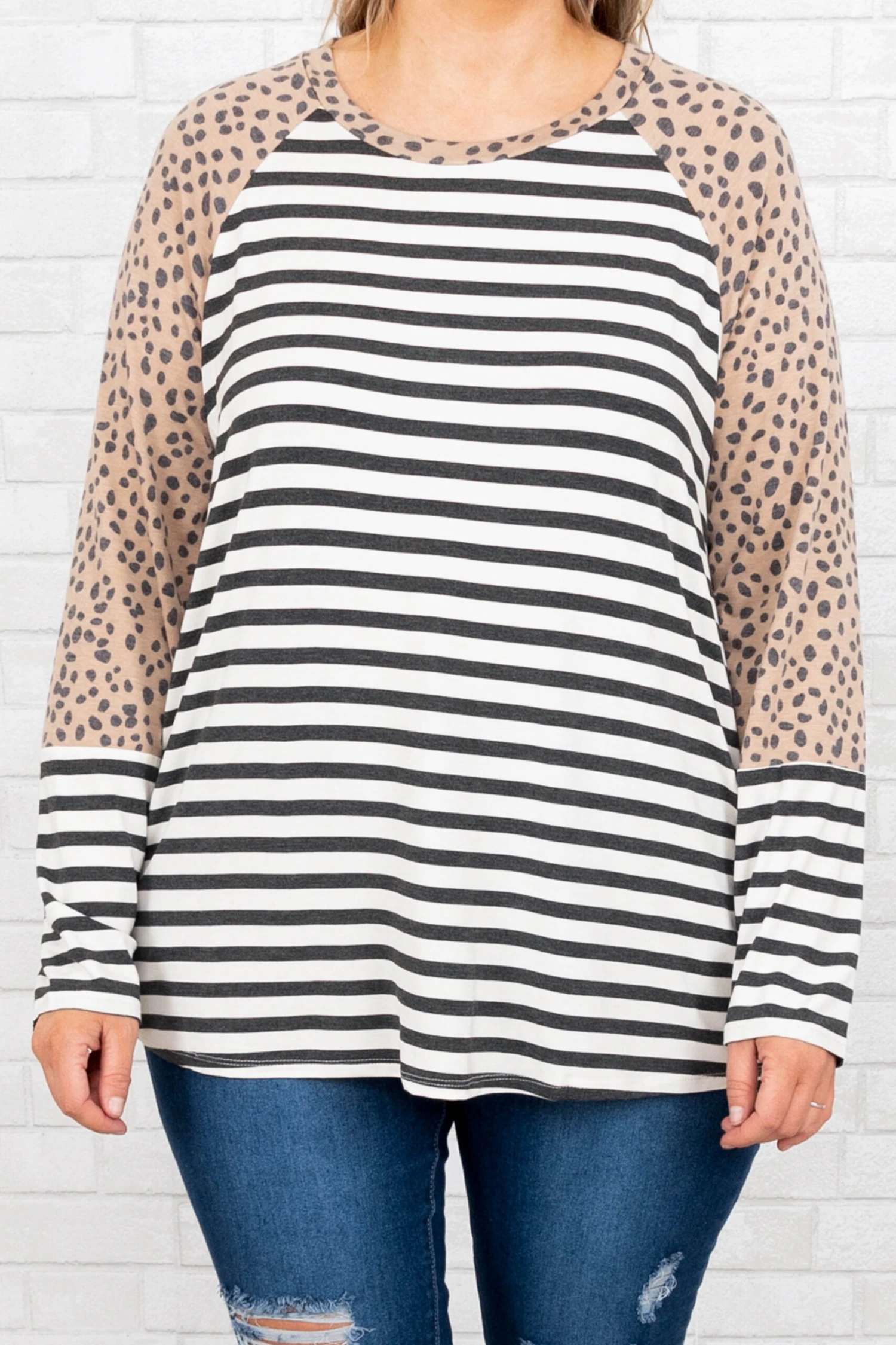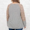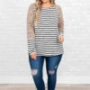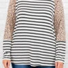 You are going to love this top so much you’ll want to get two! This top has a trendy leopard and stripe print with neutral colors you can style with your favorite pieces! It’s comfortable for all-day wear, has a figure-flattering fit, and features a curved hemline for the ultimate look! Pair this top with distressed skinnies and sandals for your next night out!Â