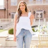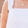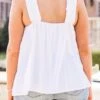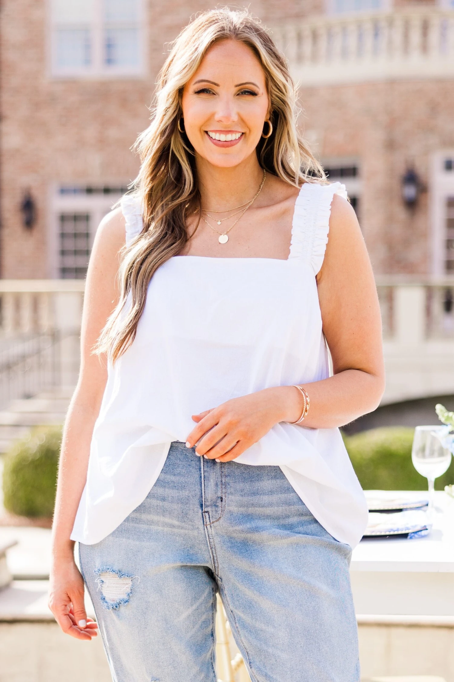 We simply adore this adorable top! This classic white tank features a flowy fit and ruffle detailing, making it a versatile addition to your wardrobe! Its timeless design pairs effortlessly with all your favorite bottoms and accessories!