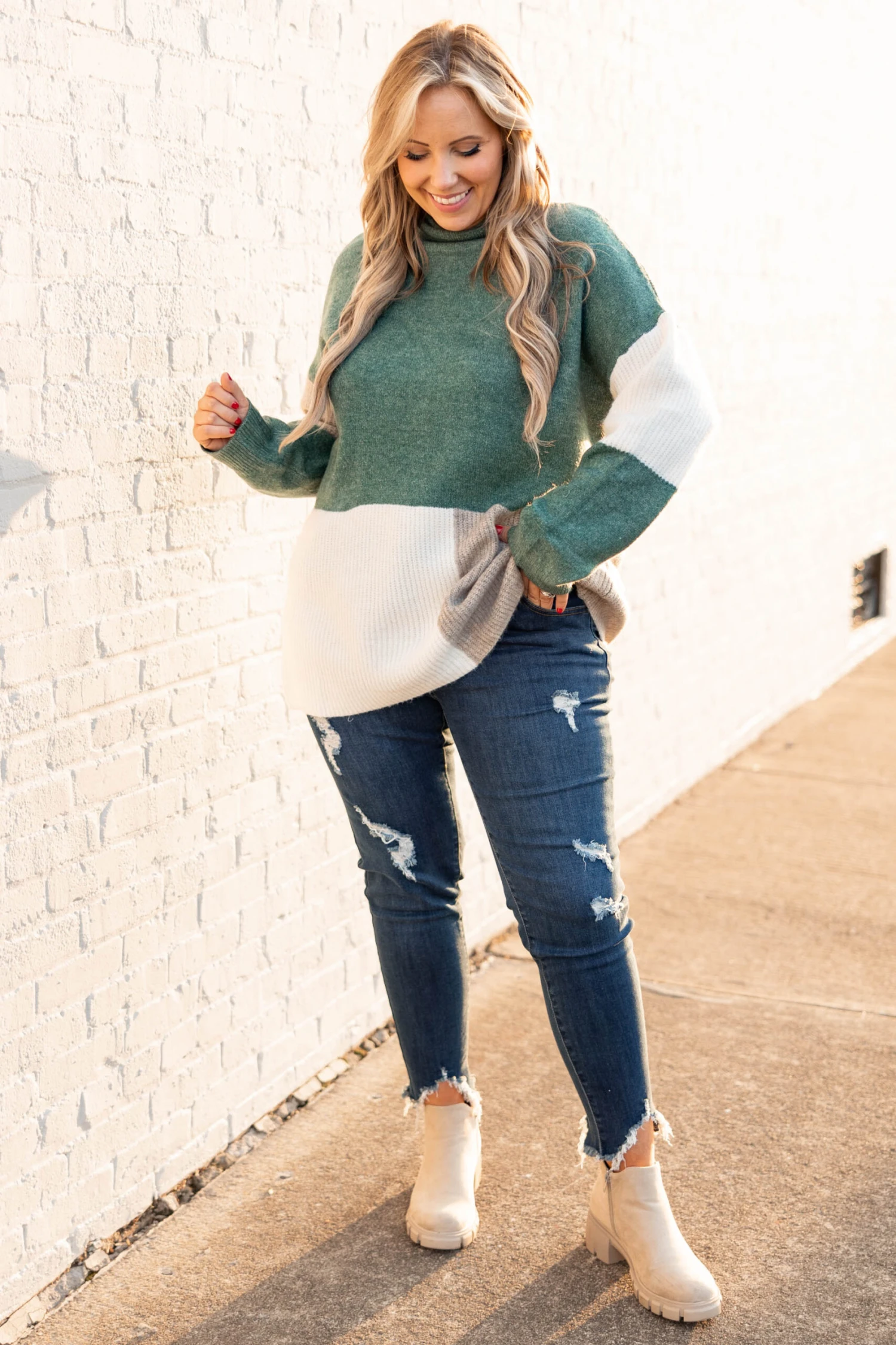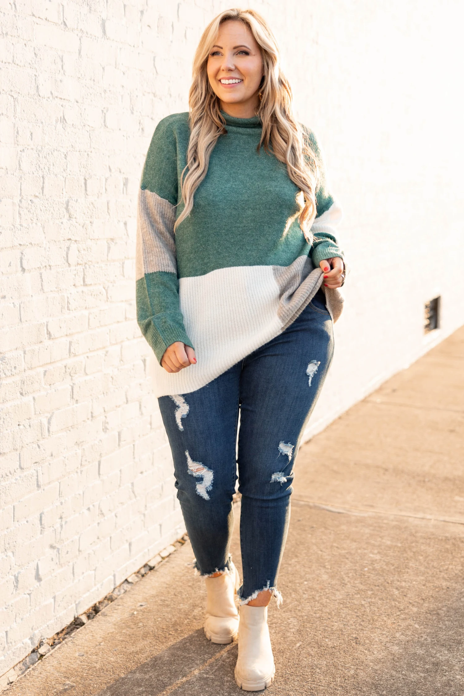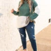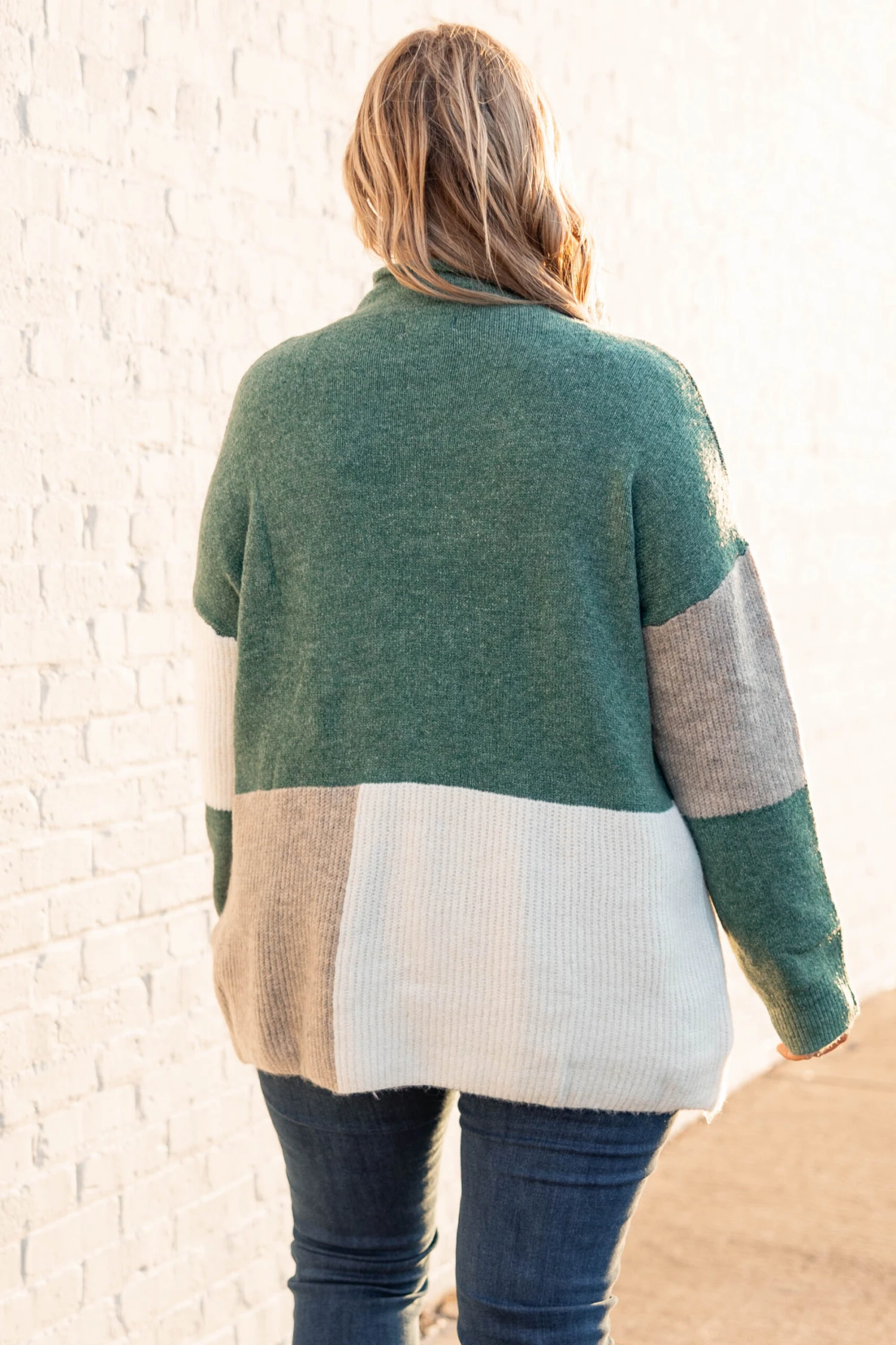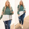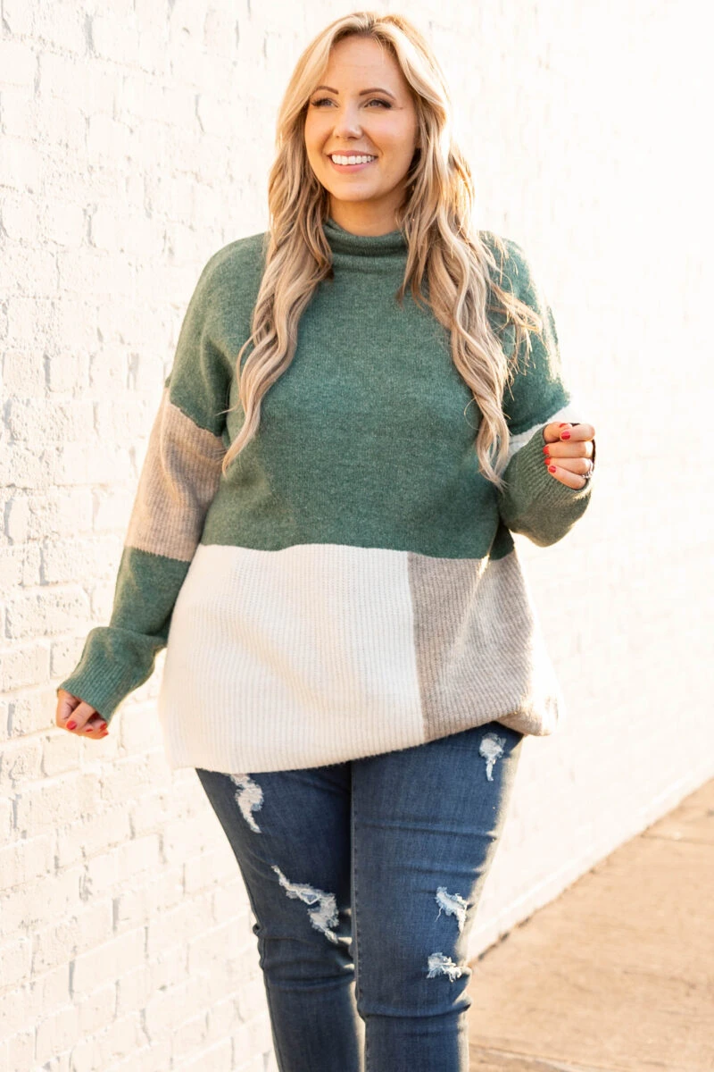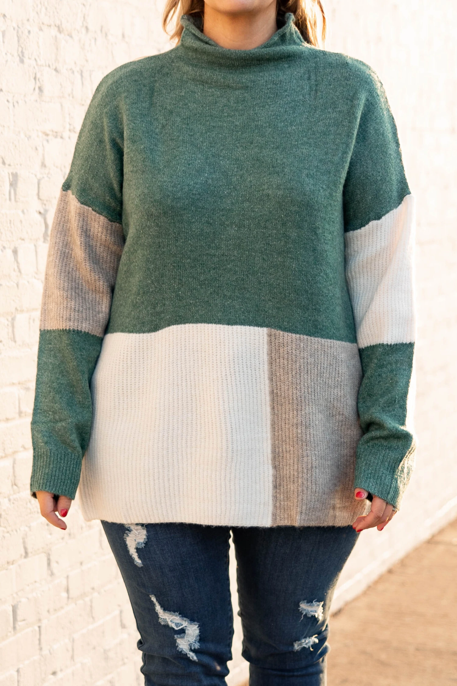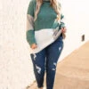 You’ll want to publish every photo taken of you wearing this sweater! This sweater has a chic color block pattern with lovely colors you can style for every occasion! It’s comfortable for all day wear, has a flowy fit, and features the cutest high neckline! Pair this sweater with distressed skinnies and booties for your next event!Â