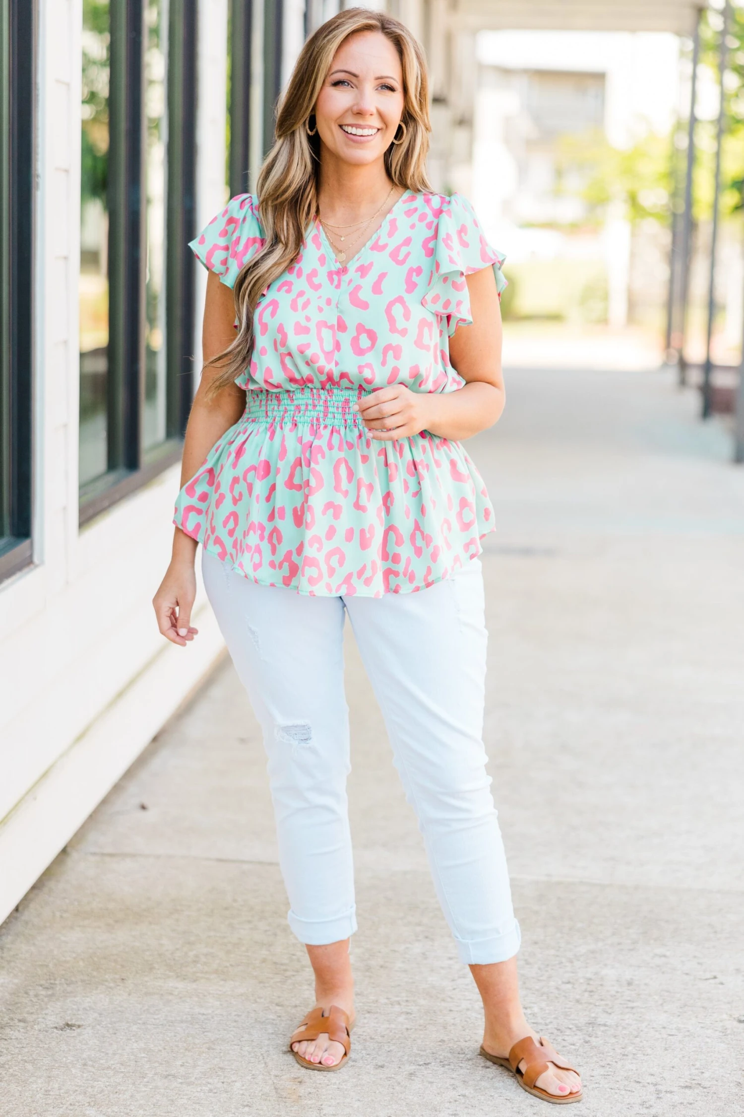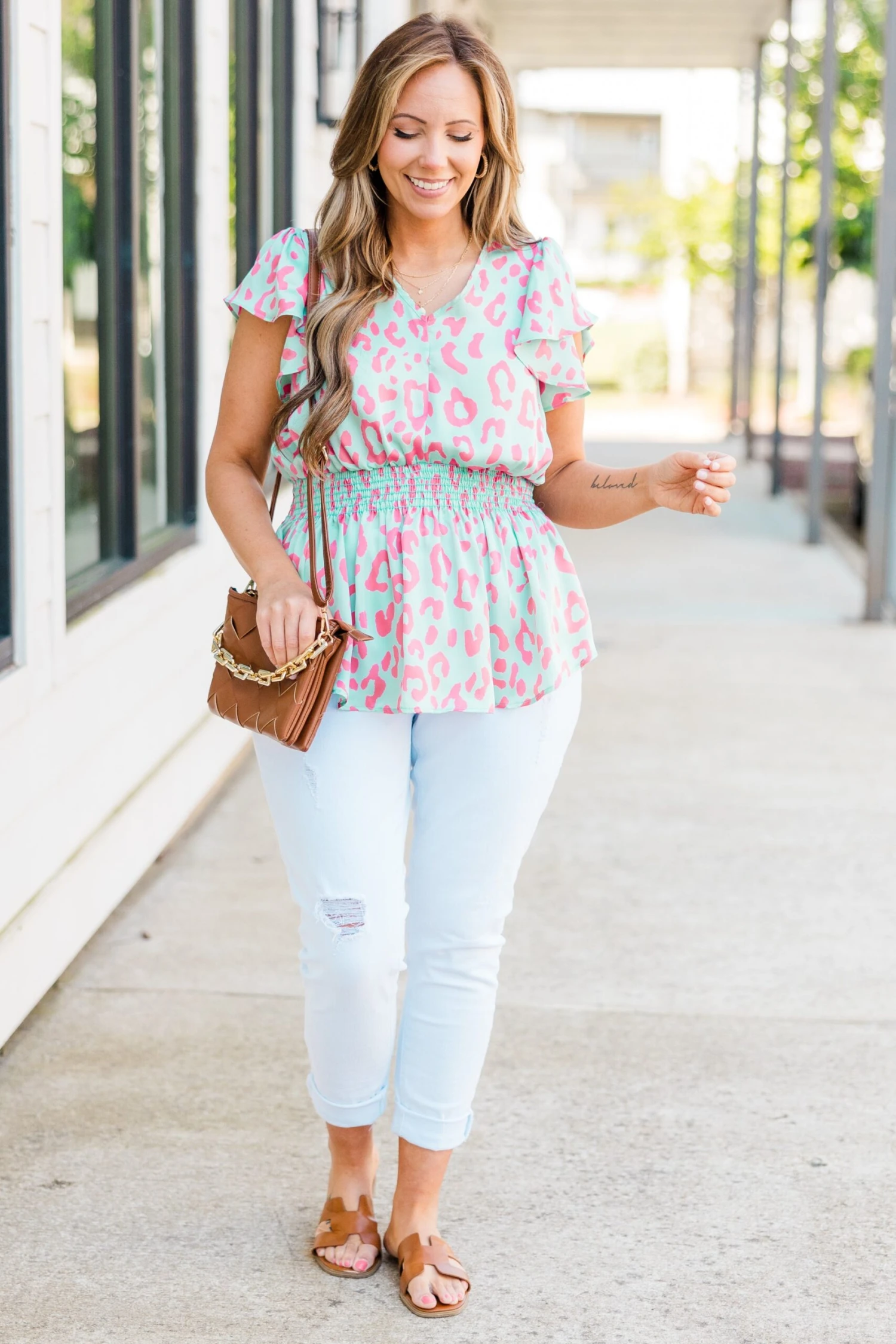 Add a pop of fun to your wardrobe with our Unstoppable Love Top in mint! The sinched look and flutter sleeves give a flattering silhouette, while the leopard pattern adds a playful touch! With its gorgeous mint color, this top is sure to become a go-to for any occasion!