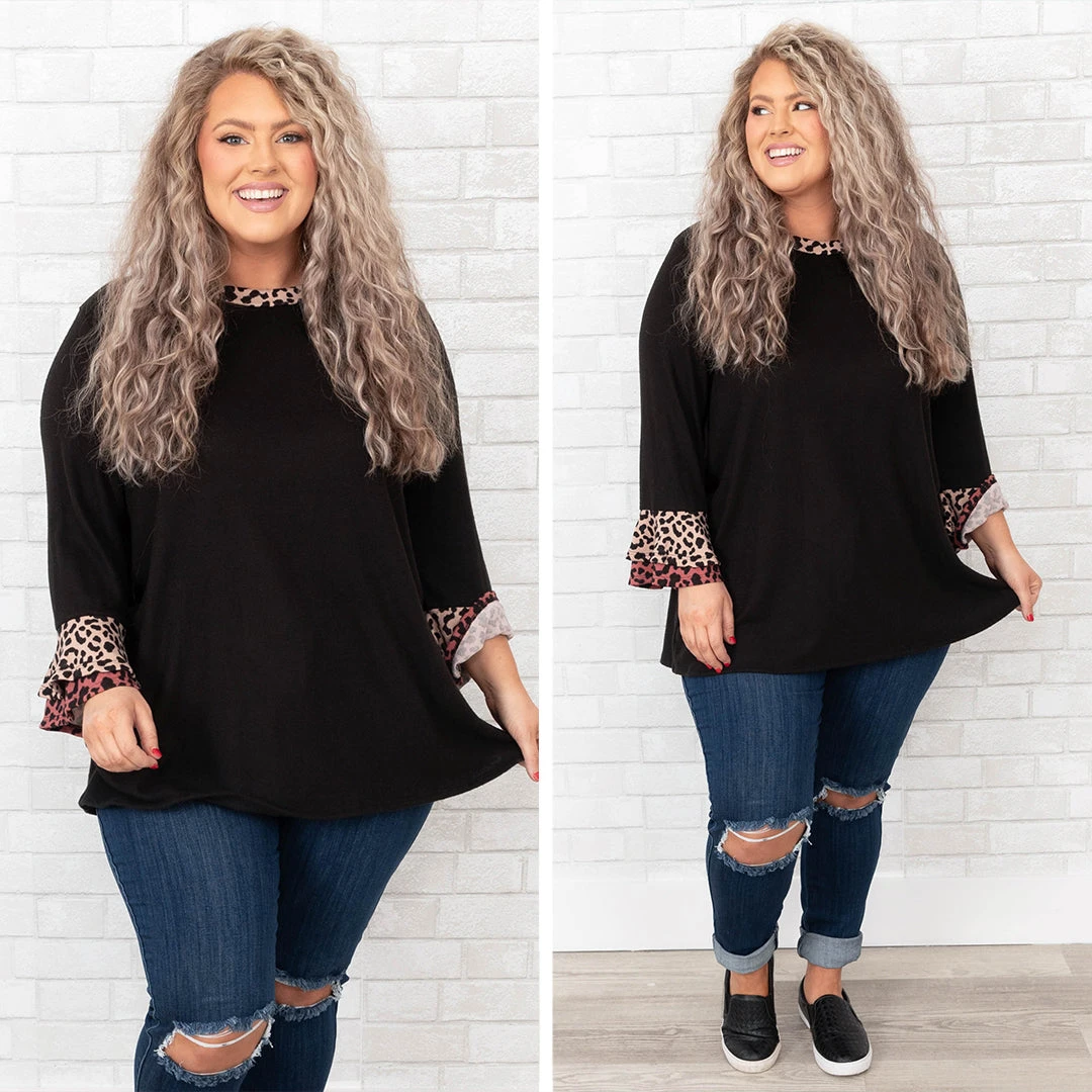 Re-write the rules in this beautiful top! This top is oh, so soft, features a solid color that makes layering and pairing a dream, and it has a trendy leopard pattern along the sleeves and neckline! This top would look great paired with some distressed skinnies and sneakers for a sassy casual look!