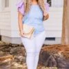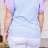 Introducing the Up And Coming Top in blue-pink! This playful top features a square neckline and trendy contrast striped flutter sleeves! Get ahead of the fashion curve with this unique and fun piece!
