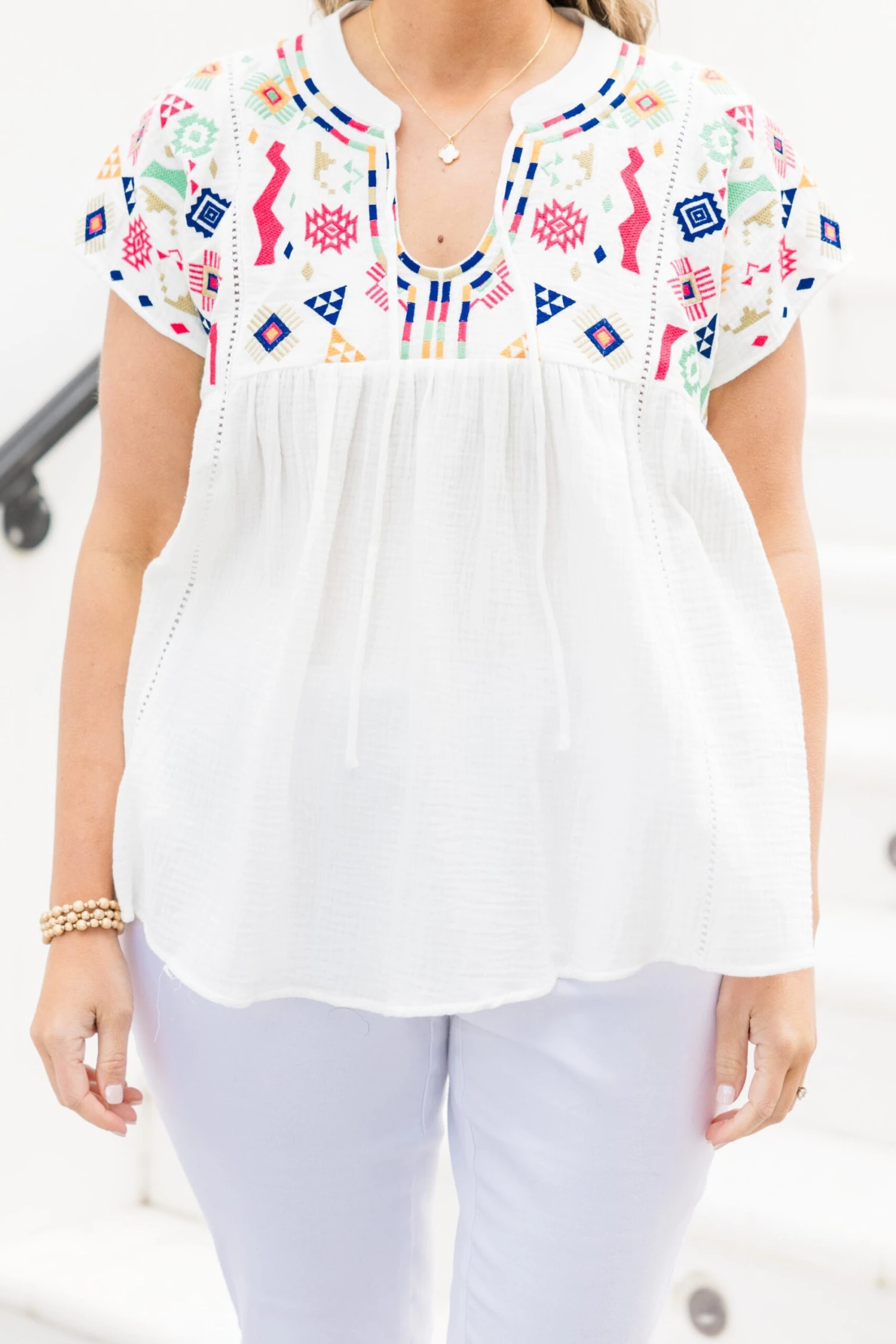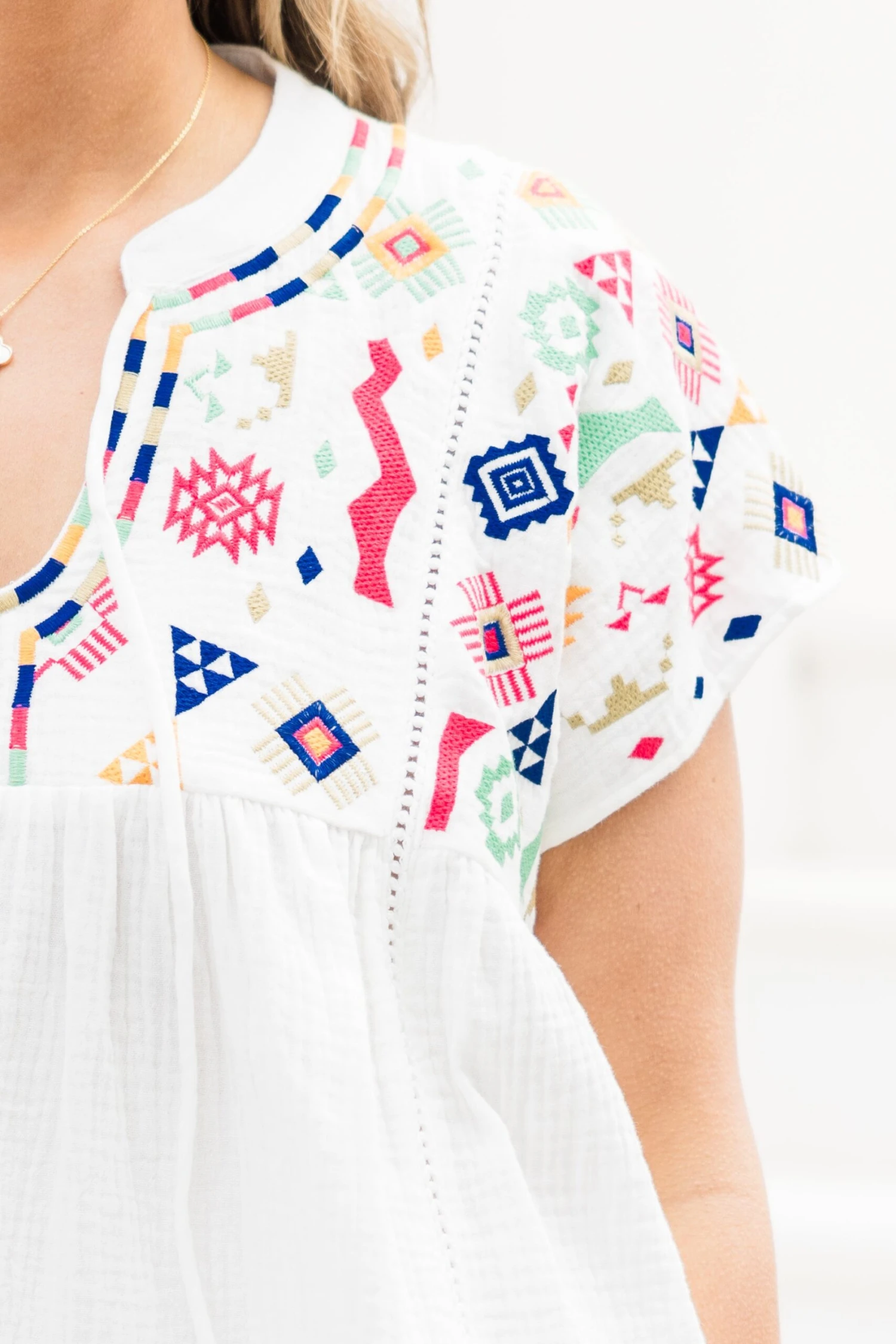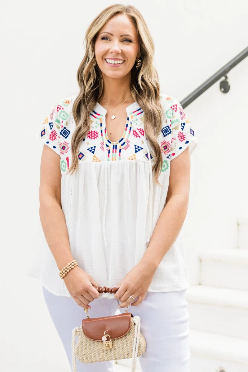 Let your fashion choices be a reflection of your unique style with this top in off white! Featuring vibrant geometric aztec embroidery on the bib and playful tassels, this gauze top offers a fun and quirky twist to the classic babydoll silhouette! With this top, the options are endless!