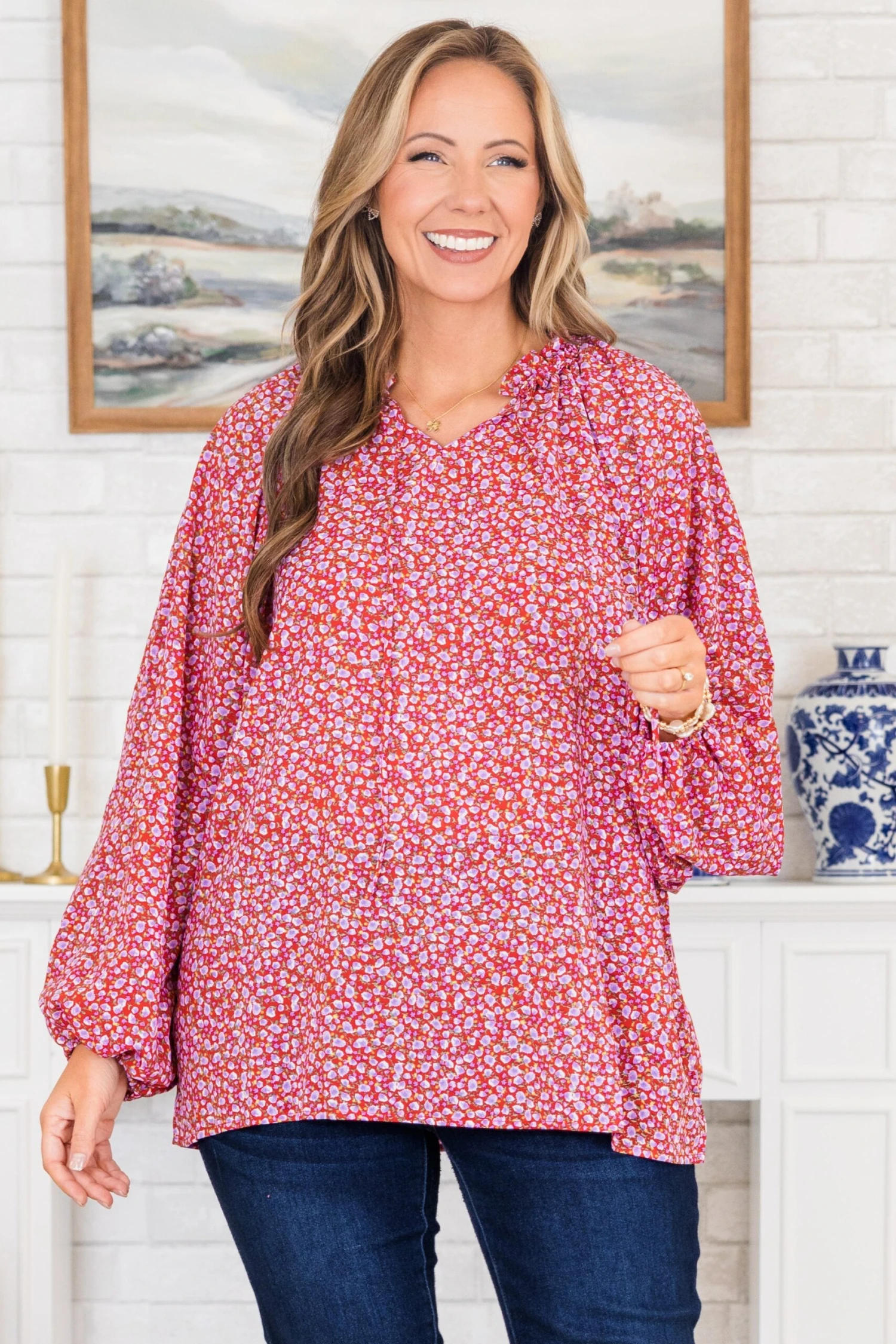 Elevate your style with this top in red! This floral top features a delicate ruffled neck and playful tassels, adding a touch of charm to any outfit! The elastic cuffs ensure a comfortable fit for all-day wear. Make a statement with this must-have piece!