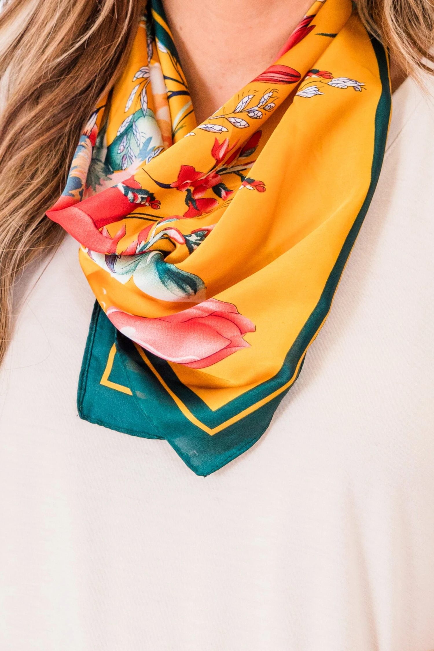 Get vacay ready with this adorable scarf! It features a bold multi-color floral pattern, making it the perfect accessory for your next adventure! Its vibrant design adds a pop of color to any outfit, while its lightweight material ensures comfort and convenience on the go!
