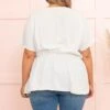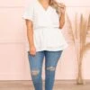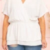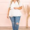 This top is so lovely! The cream color is easy to match with all of your favorite bottoms and the cinched waist flatters the best parts! This cutie has a flowy style that is so sweet and a v-neck look that is super flirty! Style this with skinnies and slides for the perfect look!