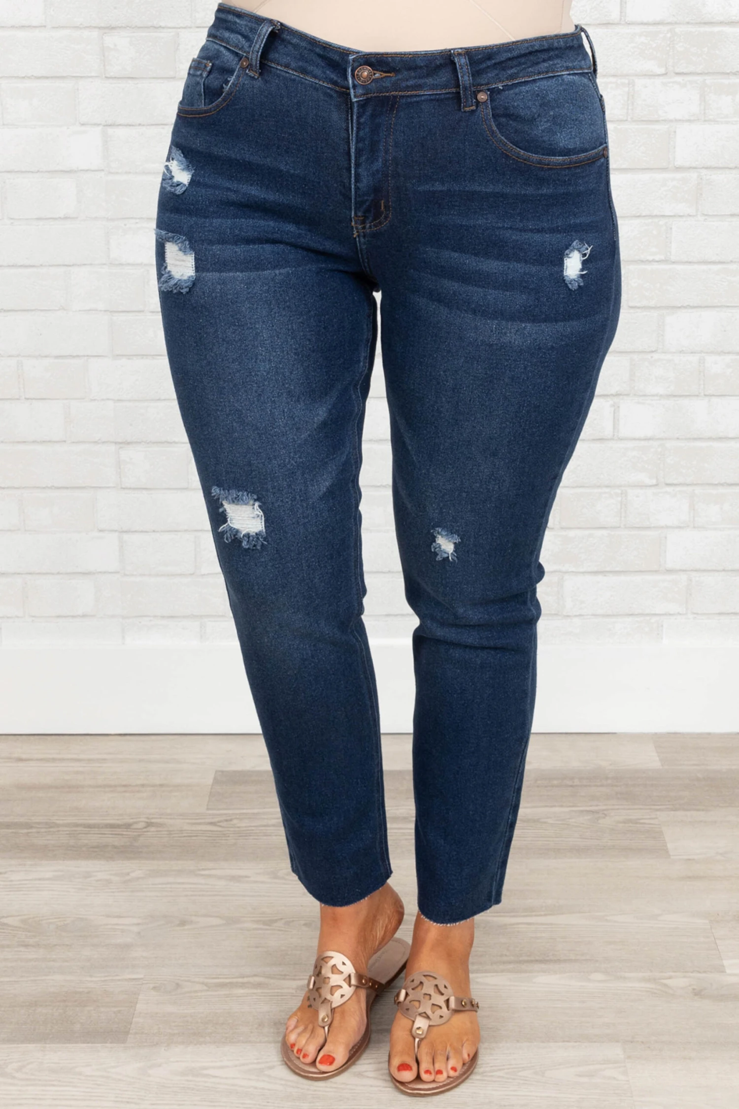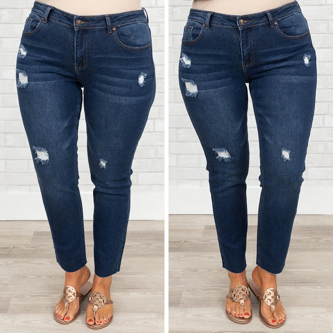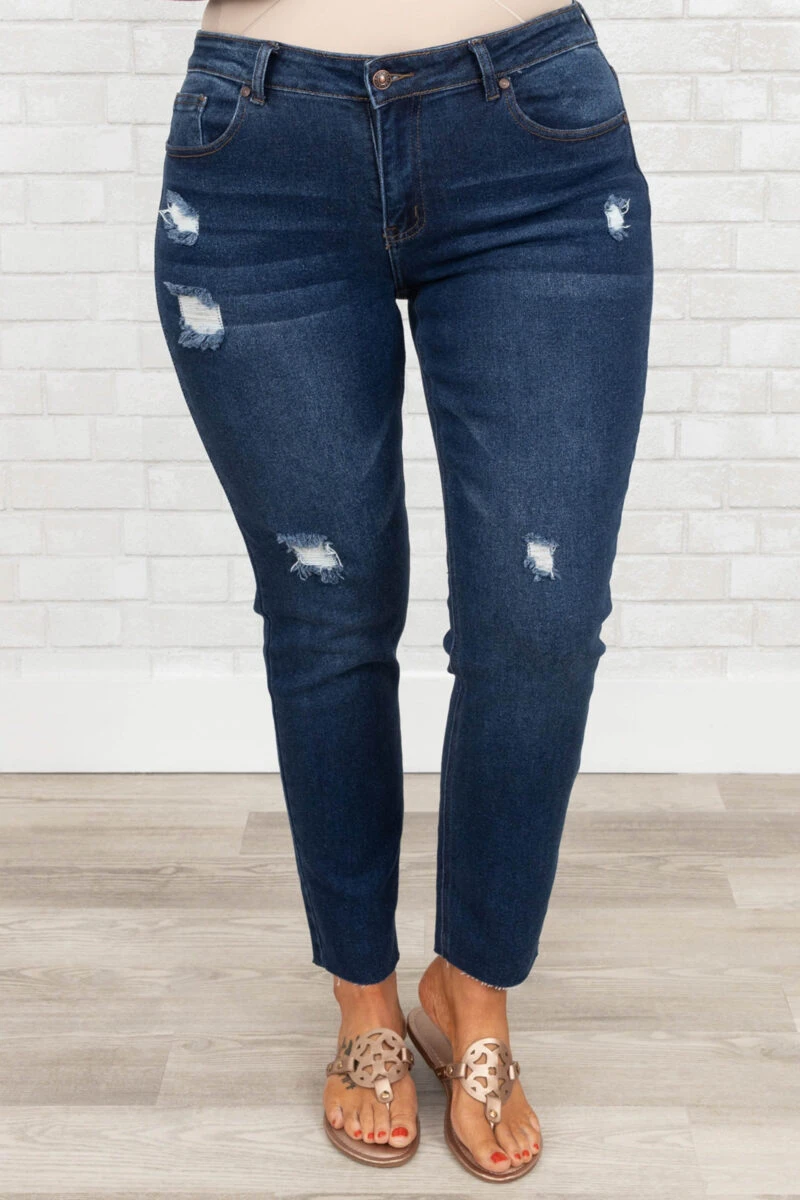 Walk that walk in these gorgeous jeggings! They have trendy dark wash and light distressed design that is great for paring with all of your fave tops and accessories! They are SUPER comfy and have a figure flattering fit that is great for all day wear! Pair these jeans with a sassy top and sandals or heels for the ultimate casual look!