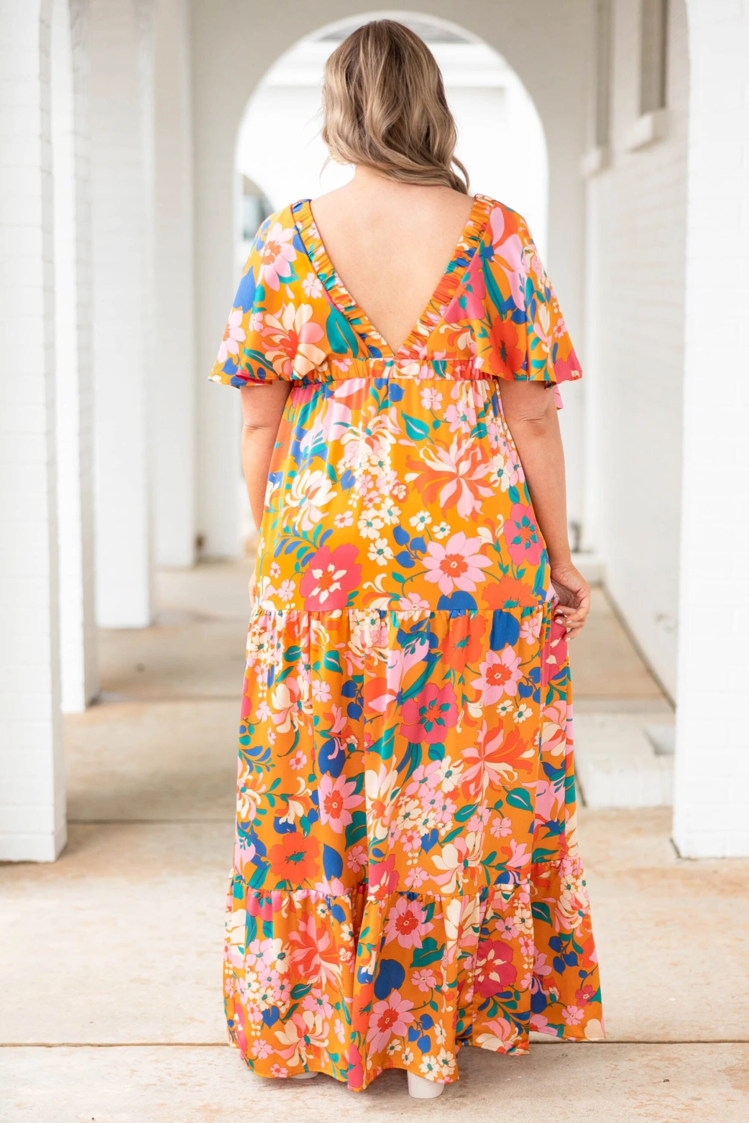 Take a walk through the flowers in this beauty! This dress could easily be your new favorite dress for the season! The bold orange floral and flirty v-neck design is a must-have! You’ll love how flowy and figure flattering it truly is! style this dress with heels or wedges for an effortlessly chic look!