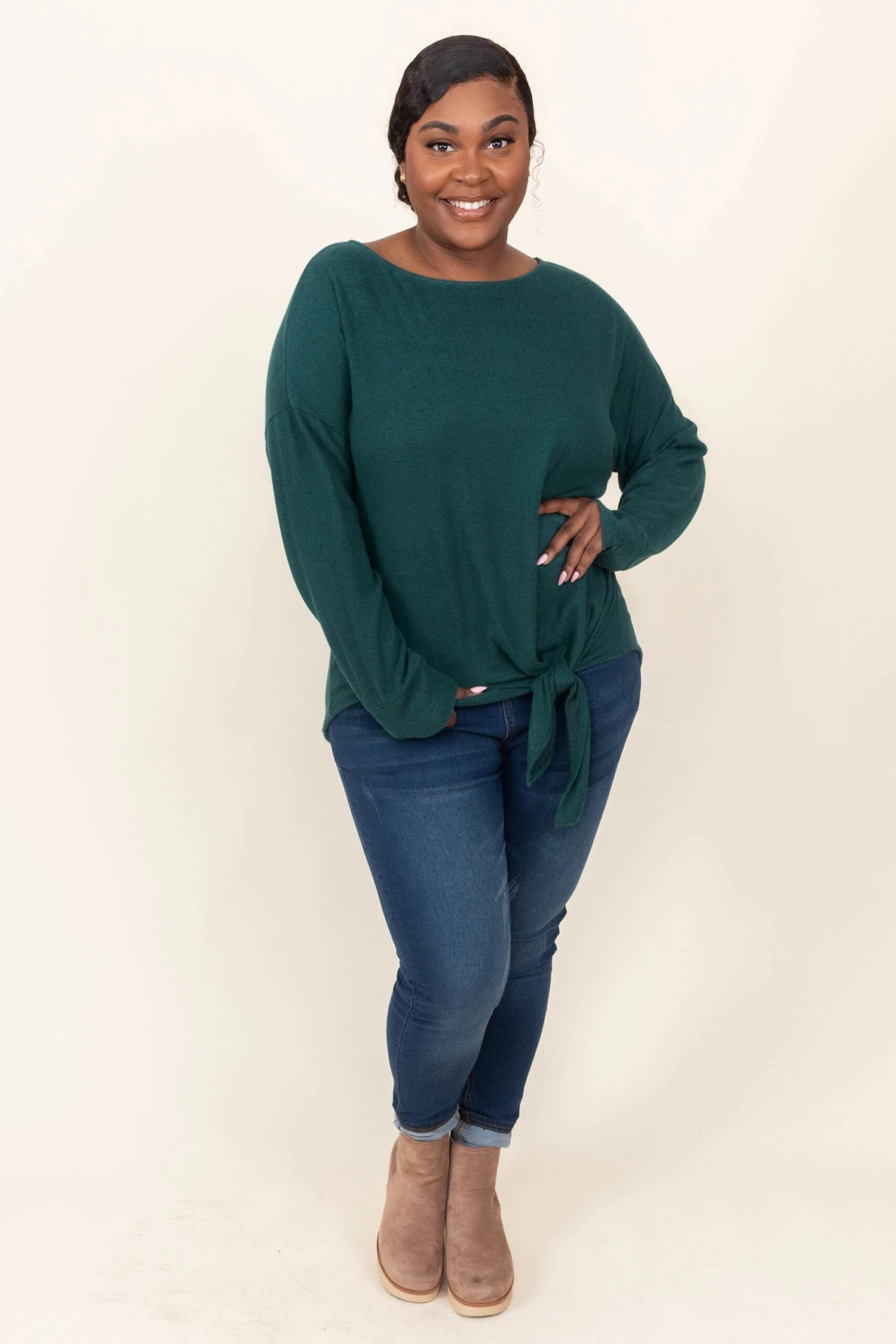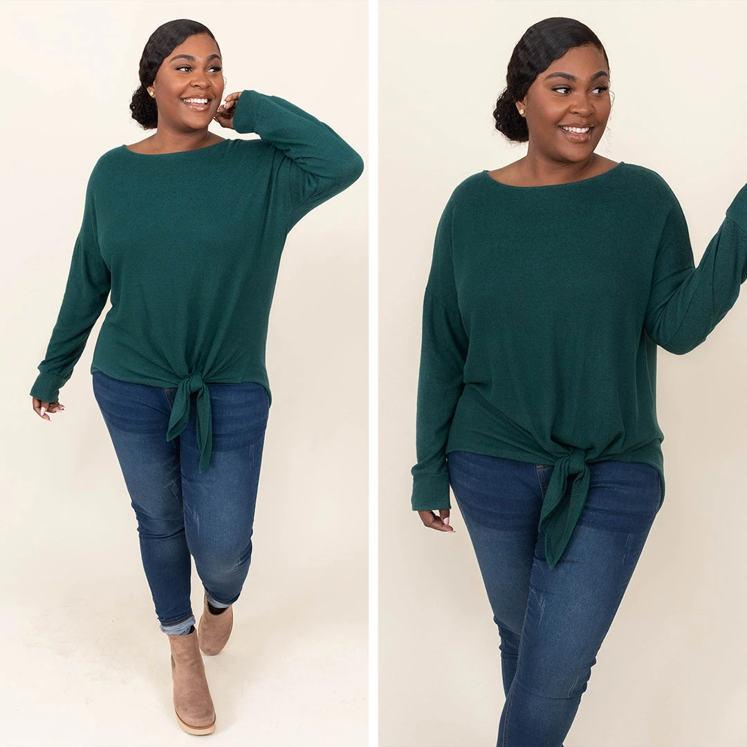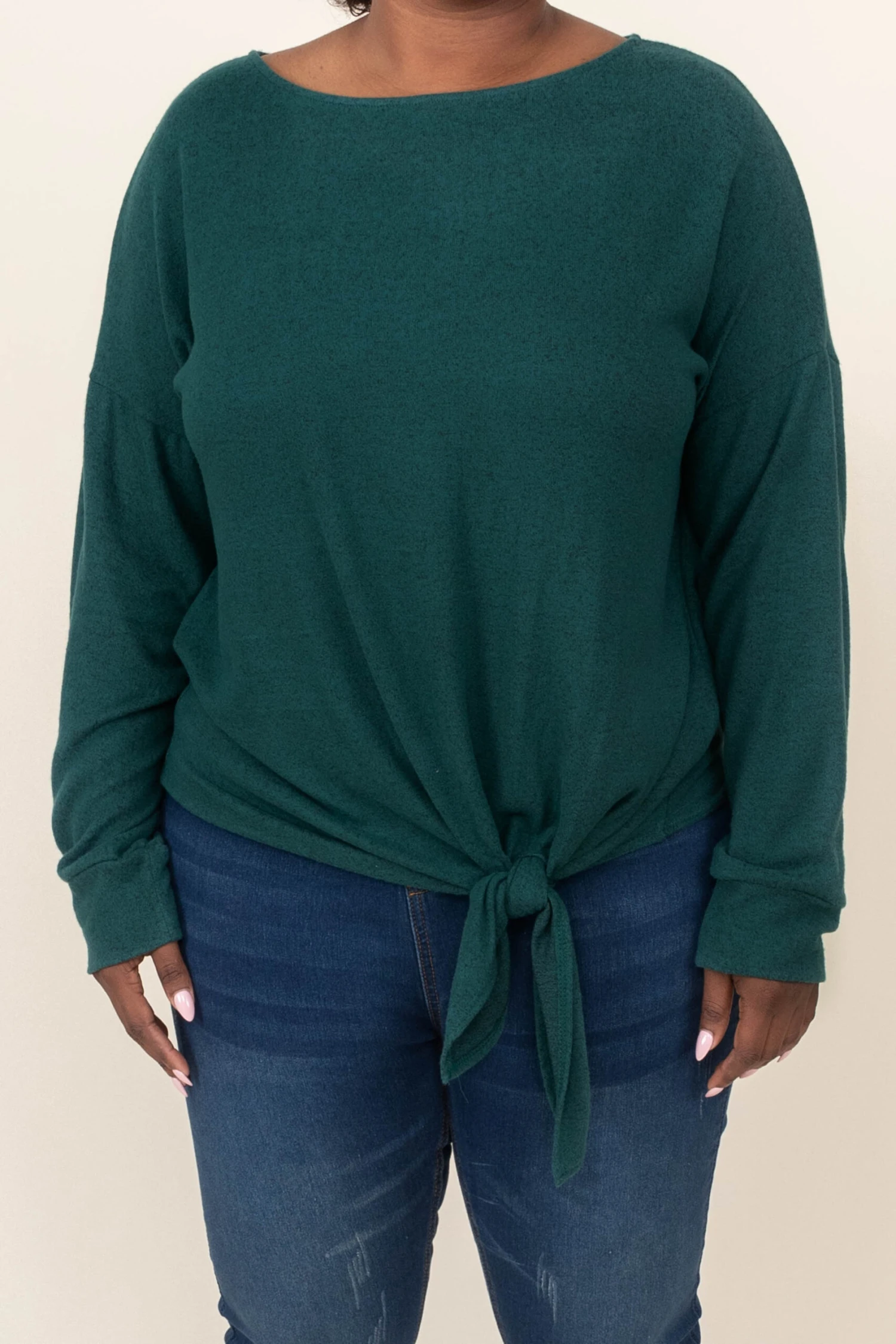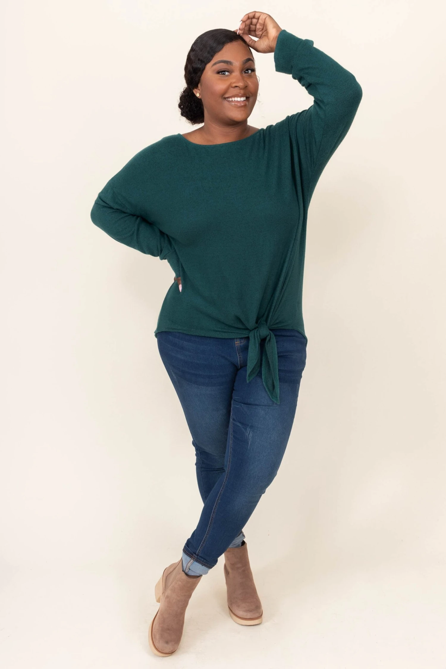 This top is what dreams are made of! This top has a bold hunter green color with a stretchy figure flattering fit that is perfect for the season! The knotted hemline and cozy material is great for everyday wear! Style this top with skinnies and booties for a trendy chic look!