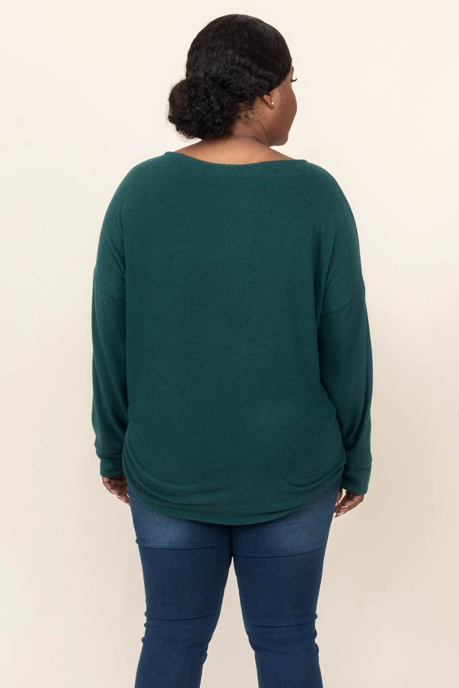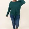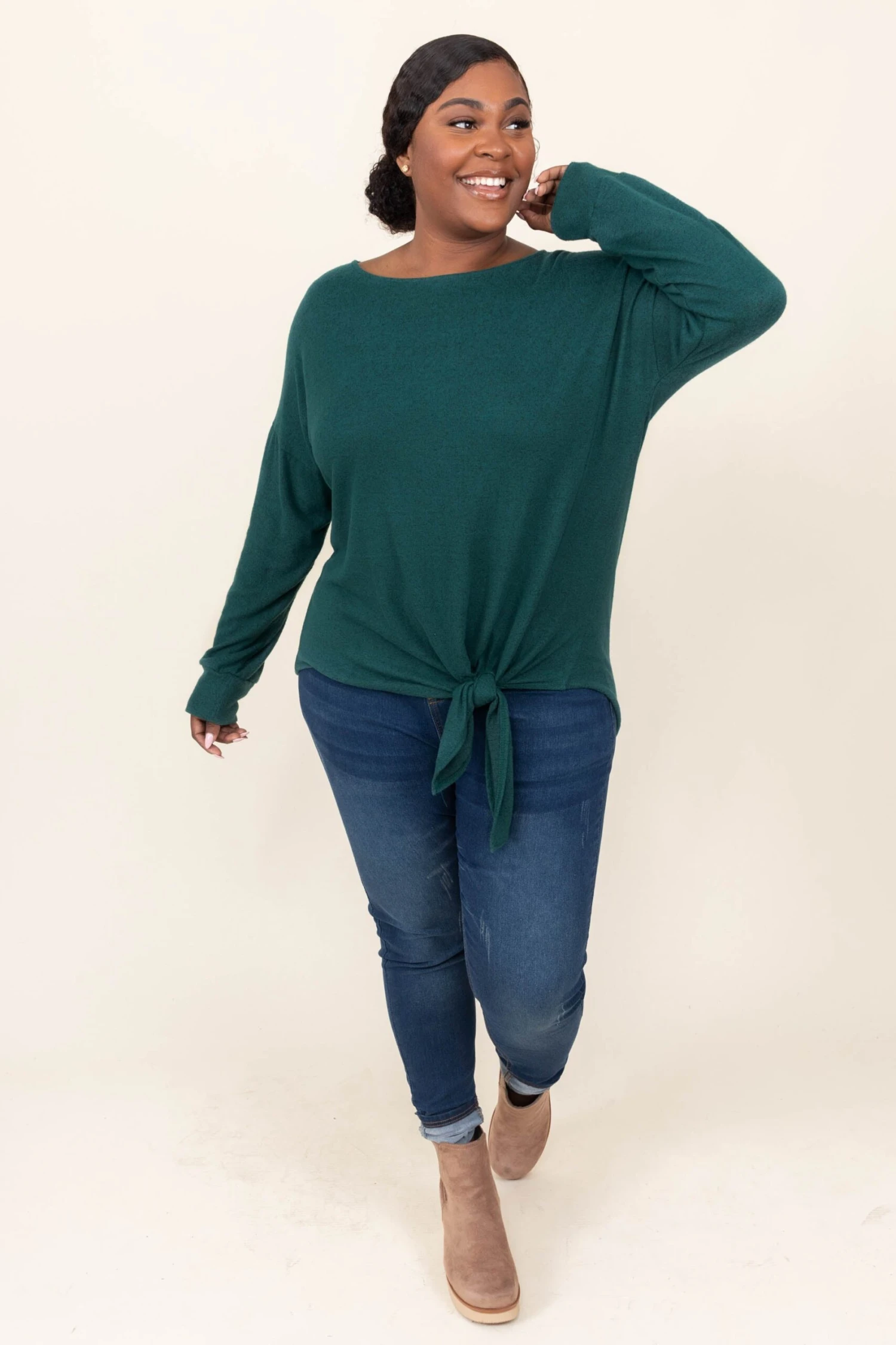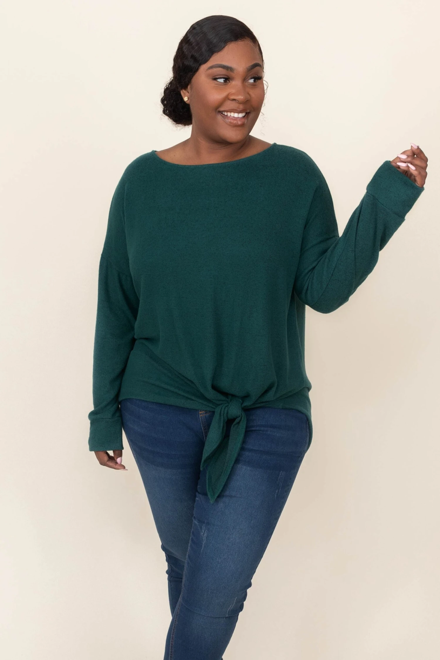 This top is what dreams are made of! This top has a bold hunter green color with a stretchy figure flattering fit that is perfect for the season! The knotted hemline and cozy material is great for everyday wear! Style this top with skinnies and booties for a trendy chic look!