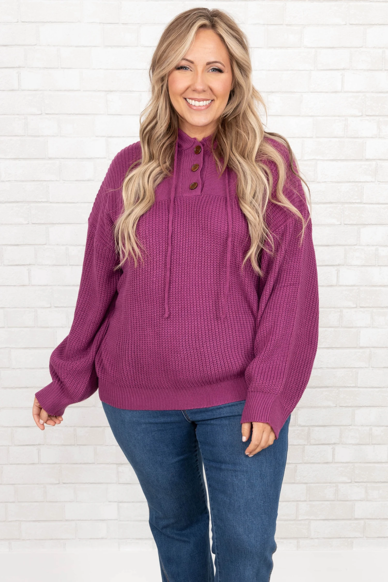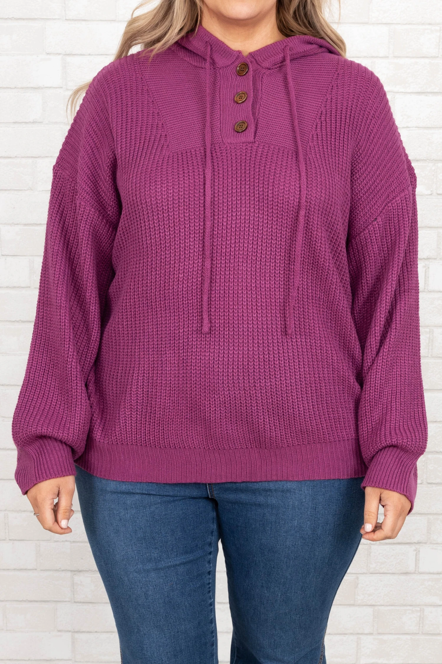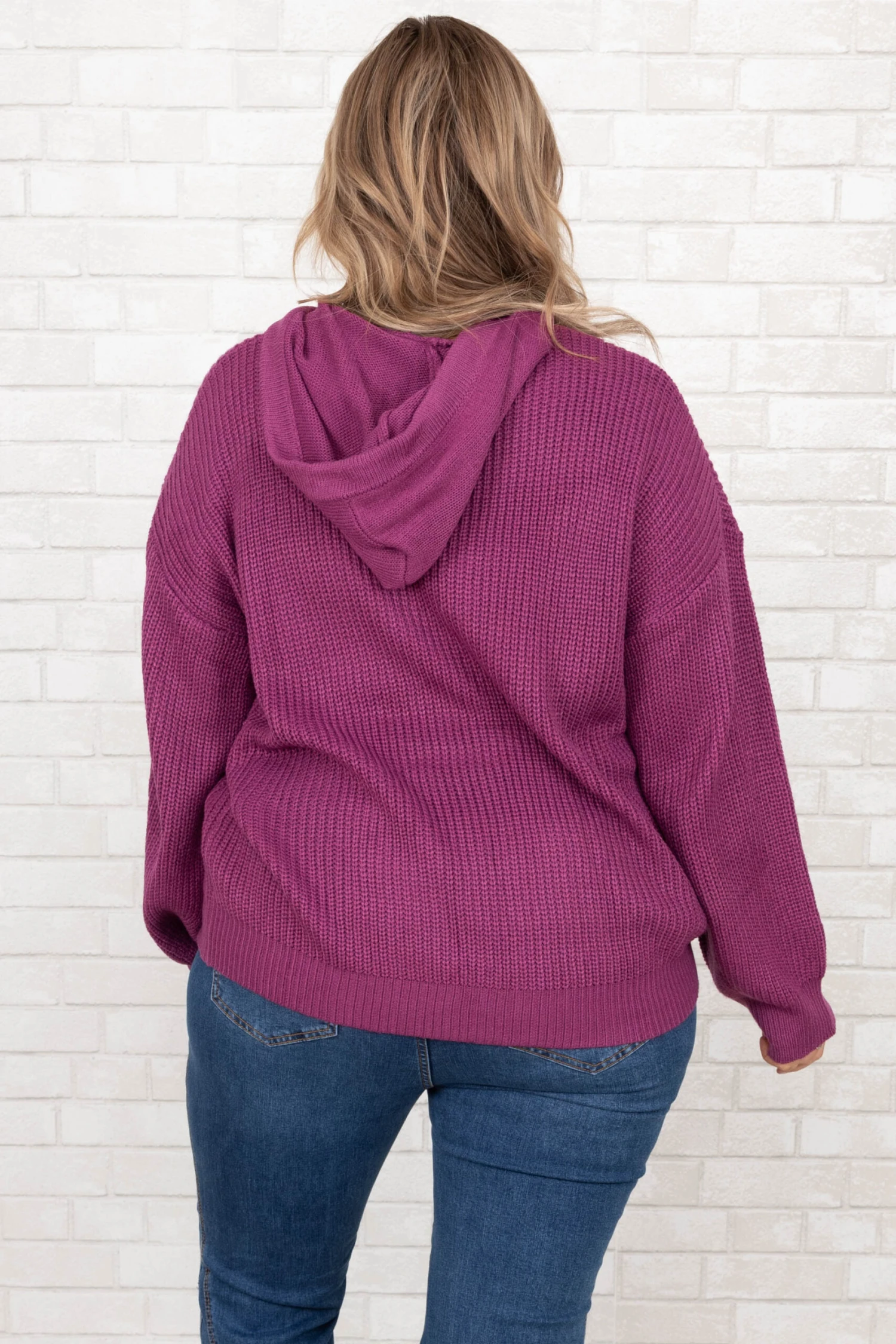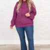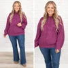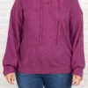 You’ll definitely be warm and happy in this amazing hoodie! The bold, fuchsia color and cozy fit are just in time for the season! The figure flattering fit and textured material is perfect for pairing with all your favorite bottoms! Style this pullover with some flare jeans and booties for a classic, chic look!