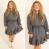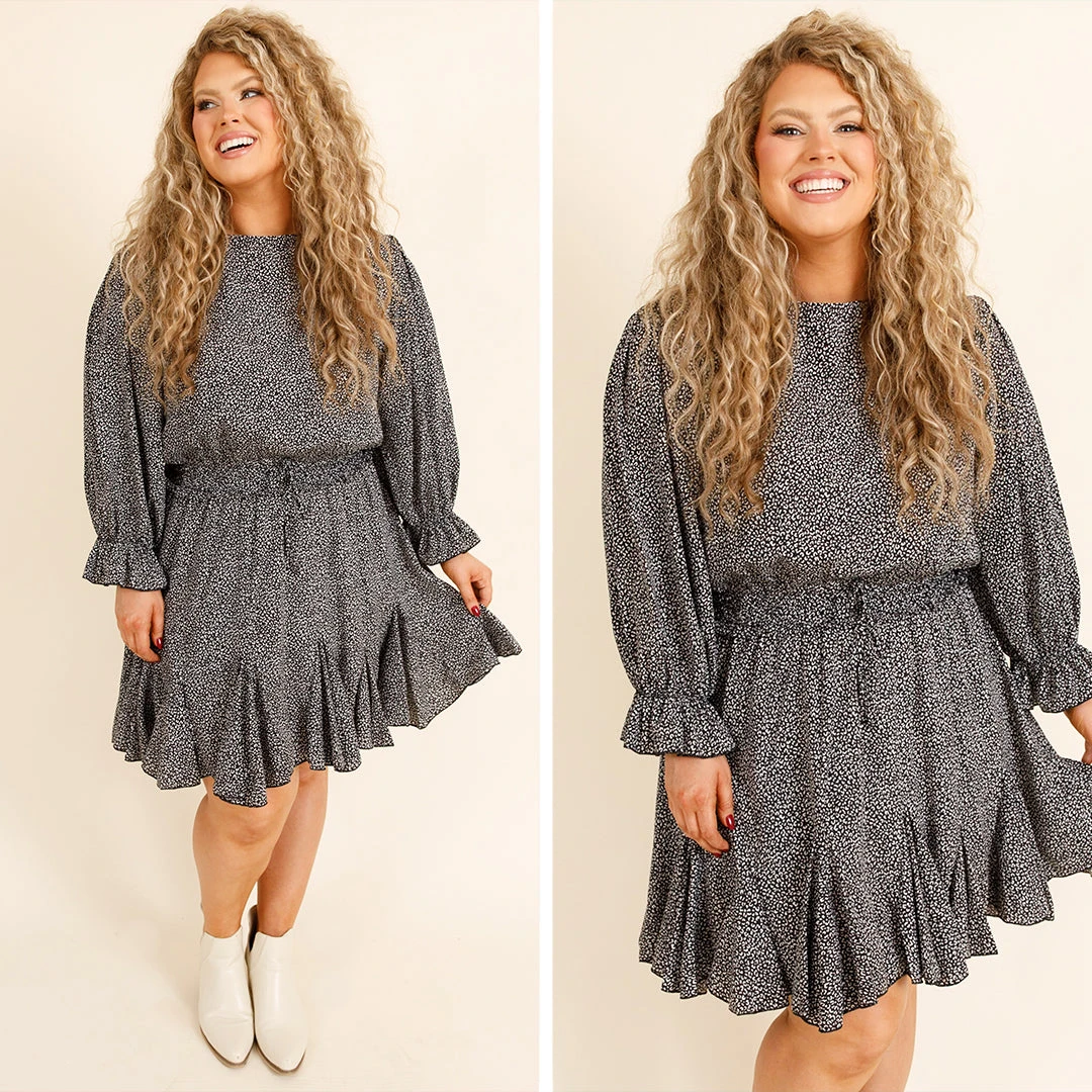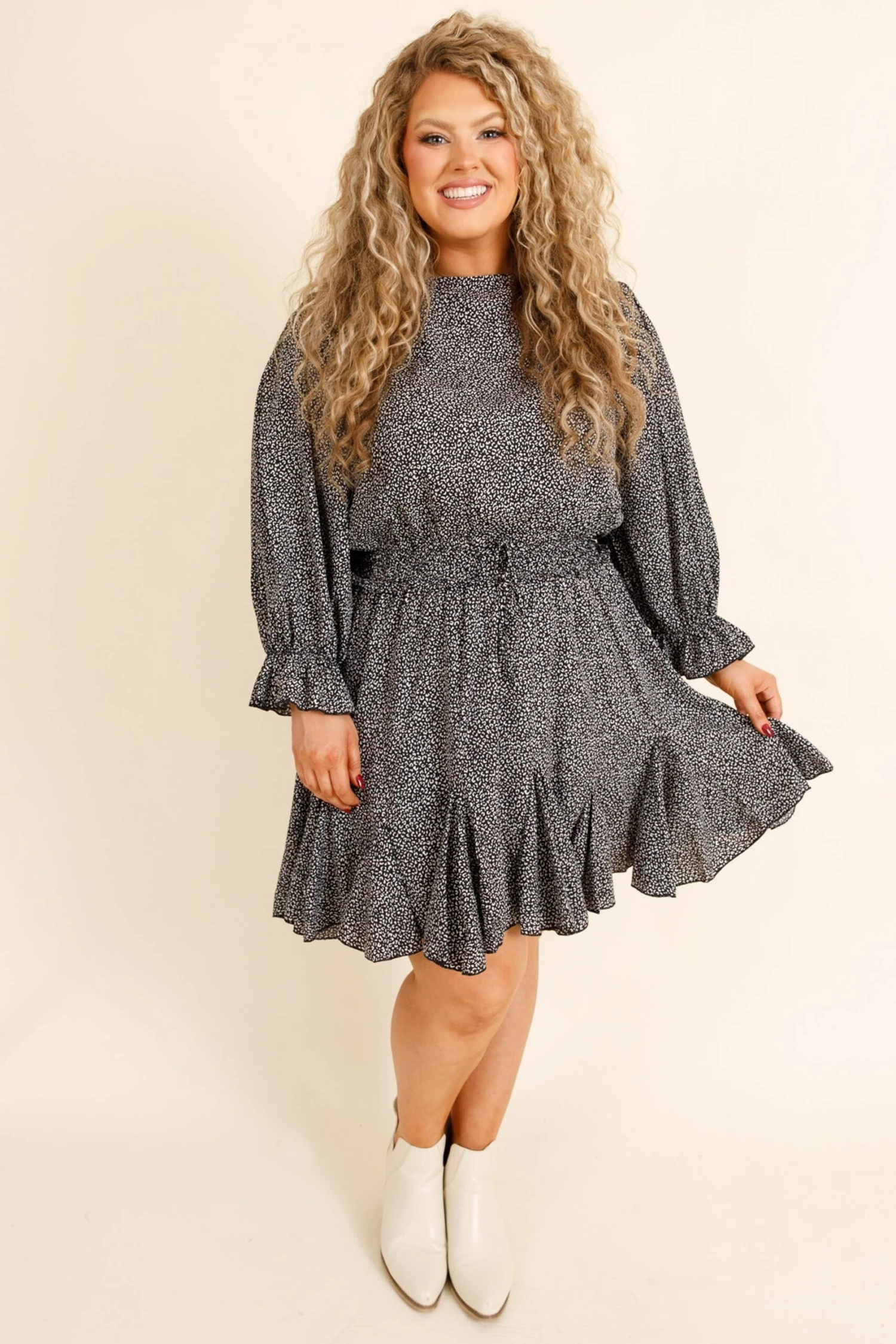 It won’t be hard to warm up to this romper! The neutral black color is so pretty and the leopard pattern is perfectly sassy! This babe has a ruffle hem and trendy bubble sleeves with a high neck collar to keep you in style! The waist is smocked with an adjustable tie to make sure you have the perfect fit and there are built in shorts to keep you in secure! Style it with some heels and chic earrings for an elegant look!