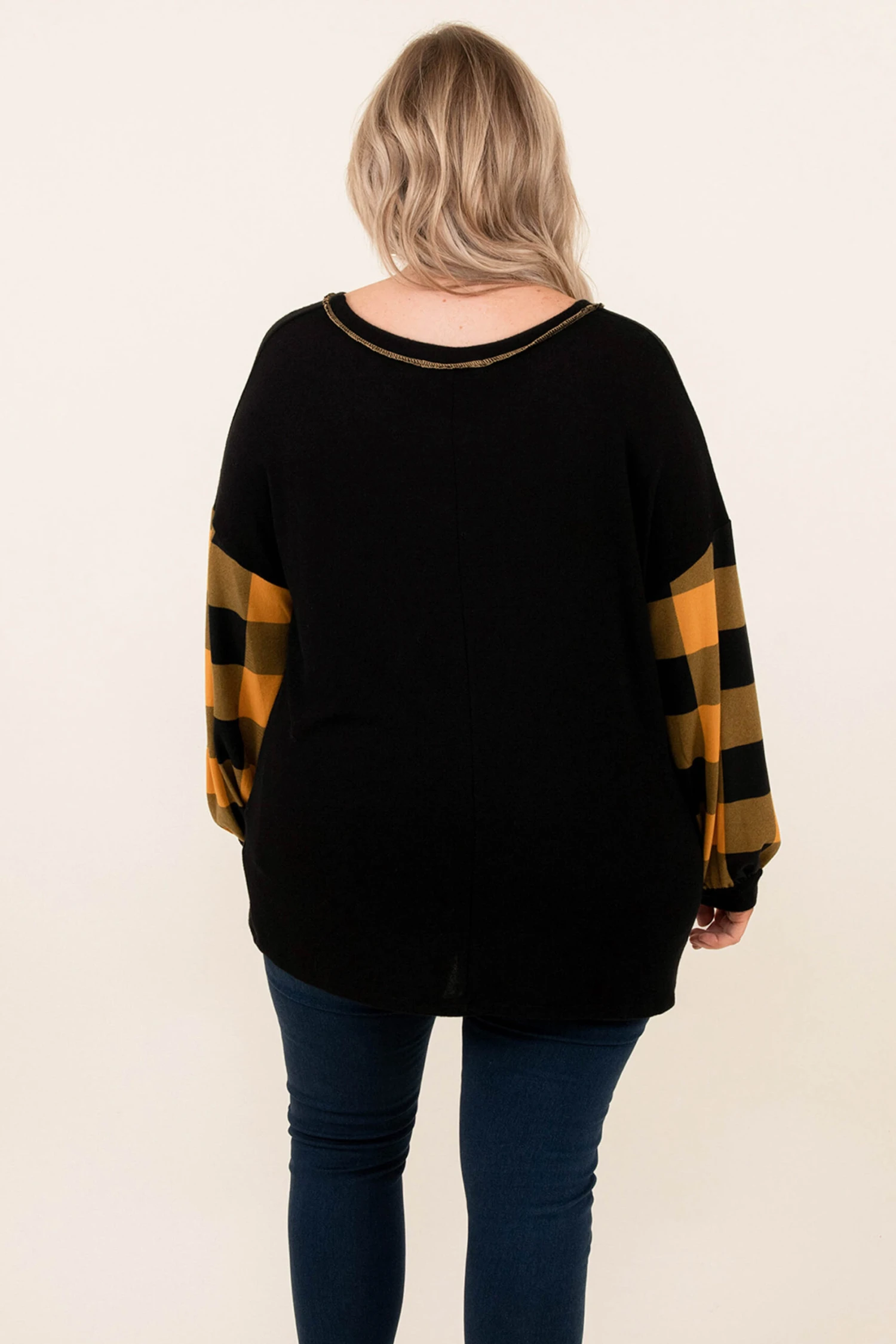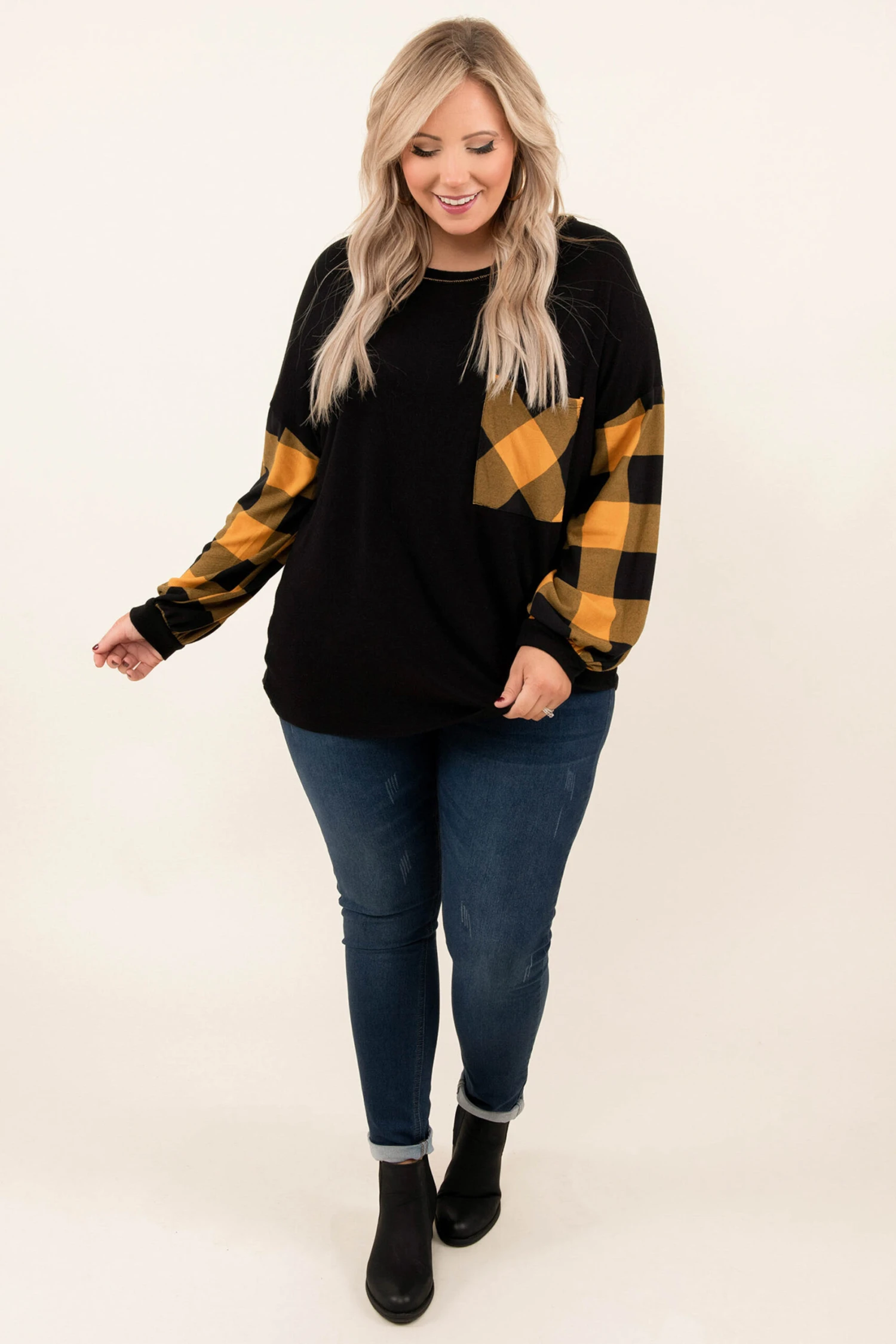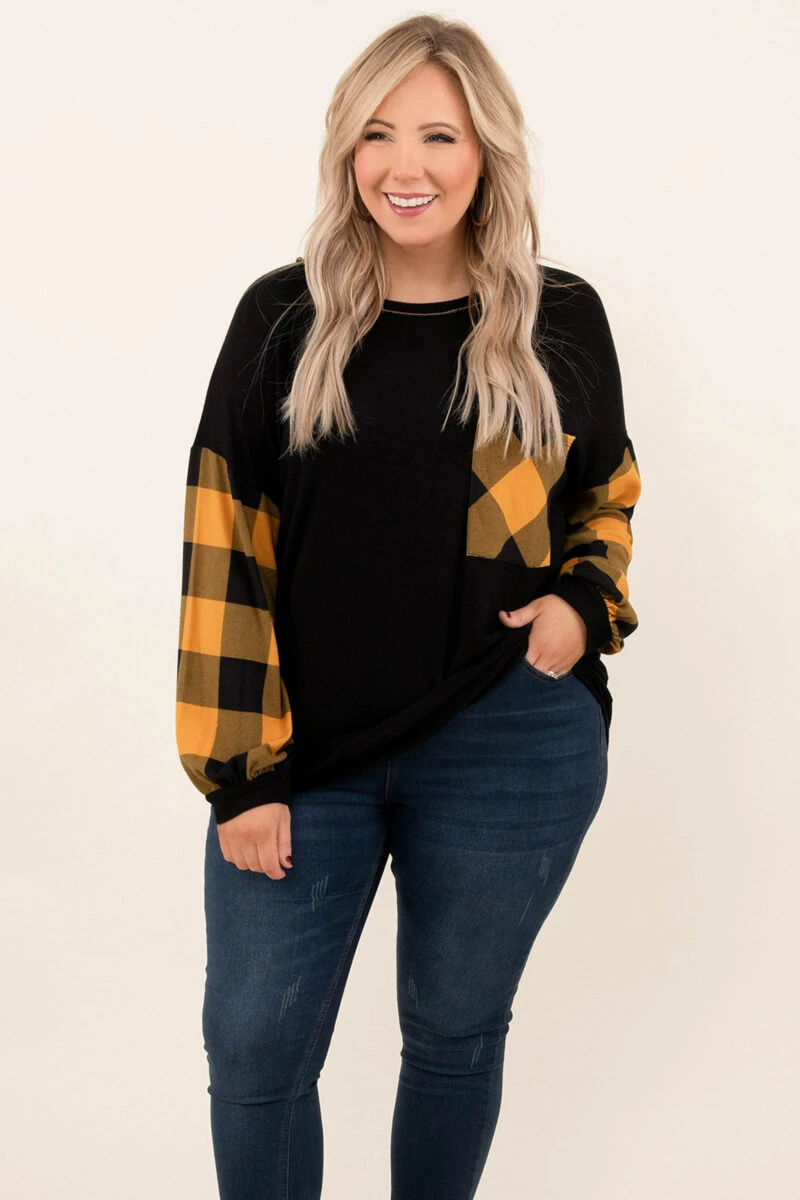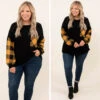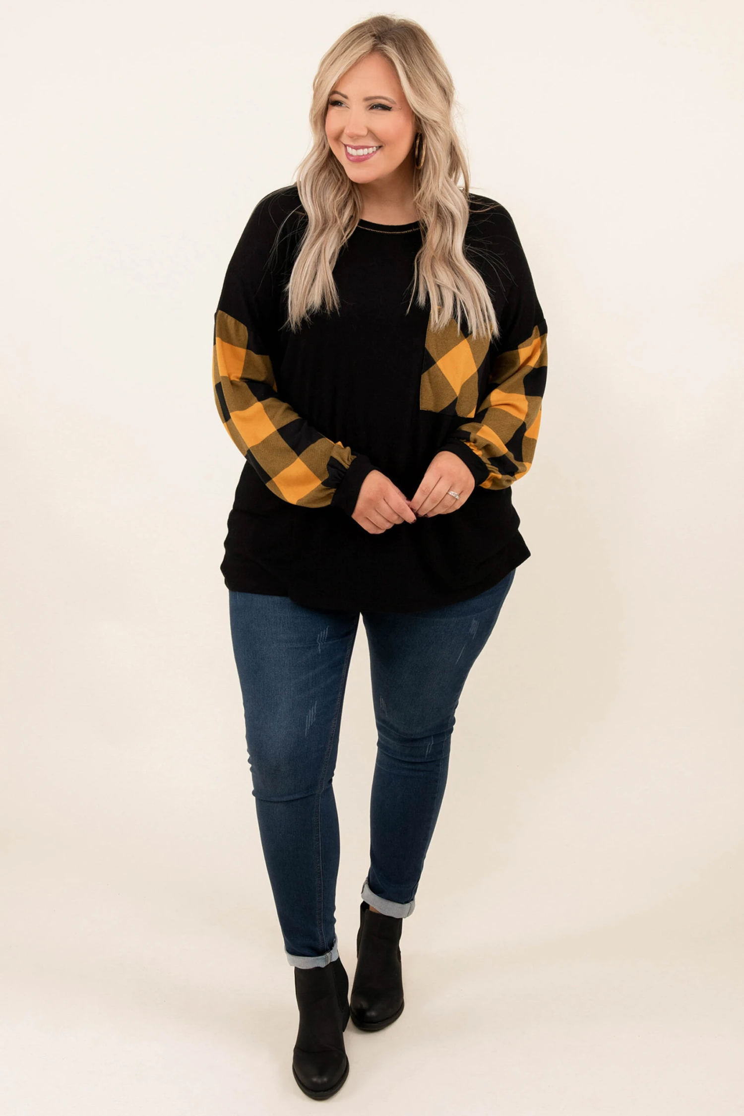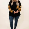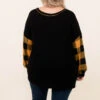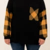 This top screams holiday and you need it in your wardrobe ASAP! The trendy buffalo plaid sleeves are the perfect added touch! This top is so warm, figure-flattering for all body types, and serves as a great layering piece for all of your jackets and vests! Simply, pair this top with skinnies and boots for an effortless, seasonal look!