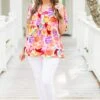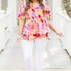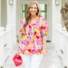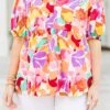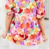 Catch the eye with our Watercolor Swirls Blouse! This cream-colored top boasts a playful split neck and puffy sleeves, while the delicate floral print adds a touch of whimsy! Perfect for a fun and flirty look!