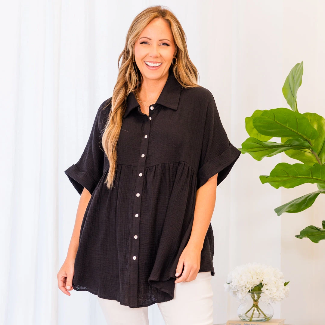 This top is so sweet you’ll keep it on repeat all season long! It features a black color, babydoll design, perfect for a classy chic look! Made with a textured material, this top is sure to stand out in a crowd! Pair it with white denim and wedges for a stylish and elegant outfit!