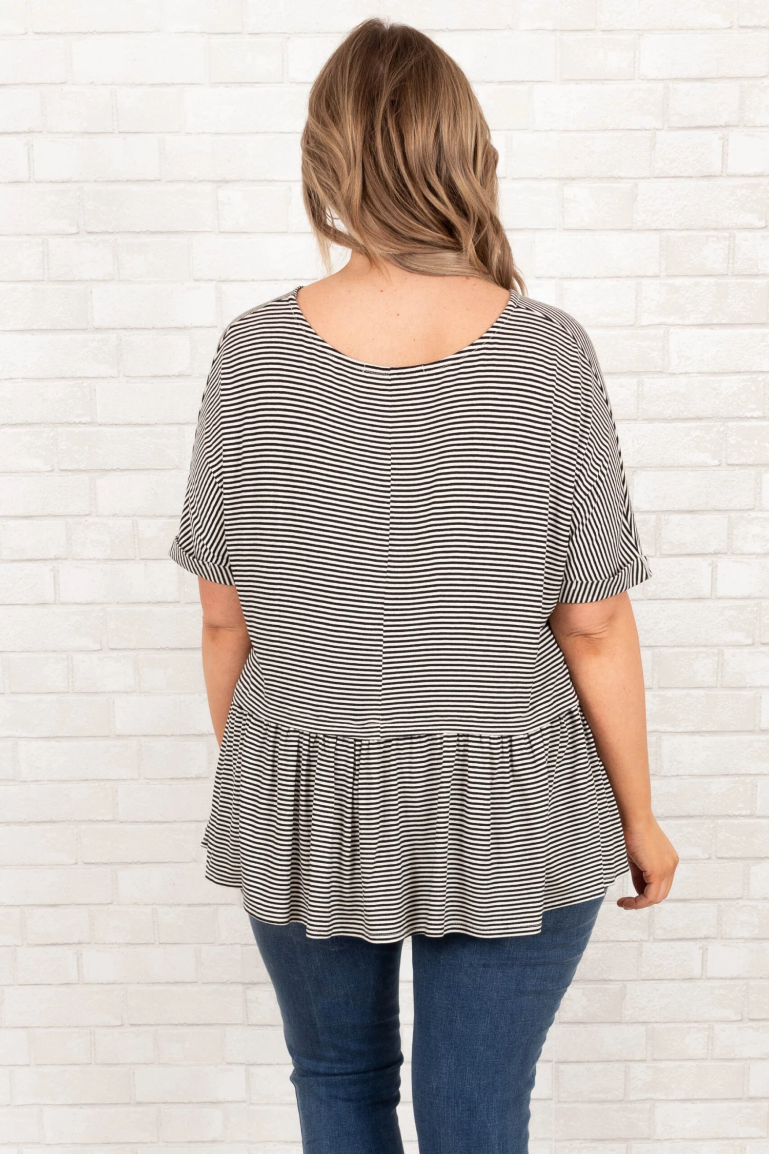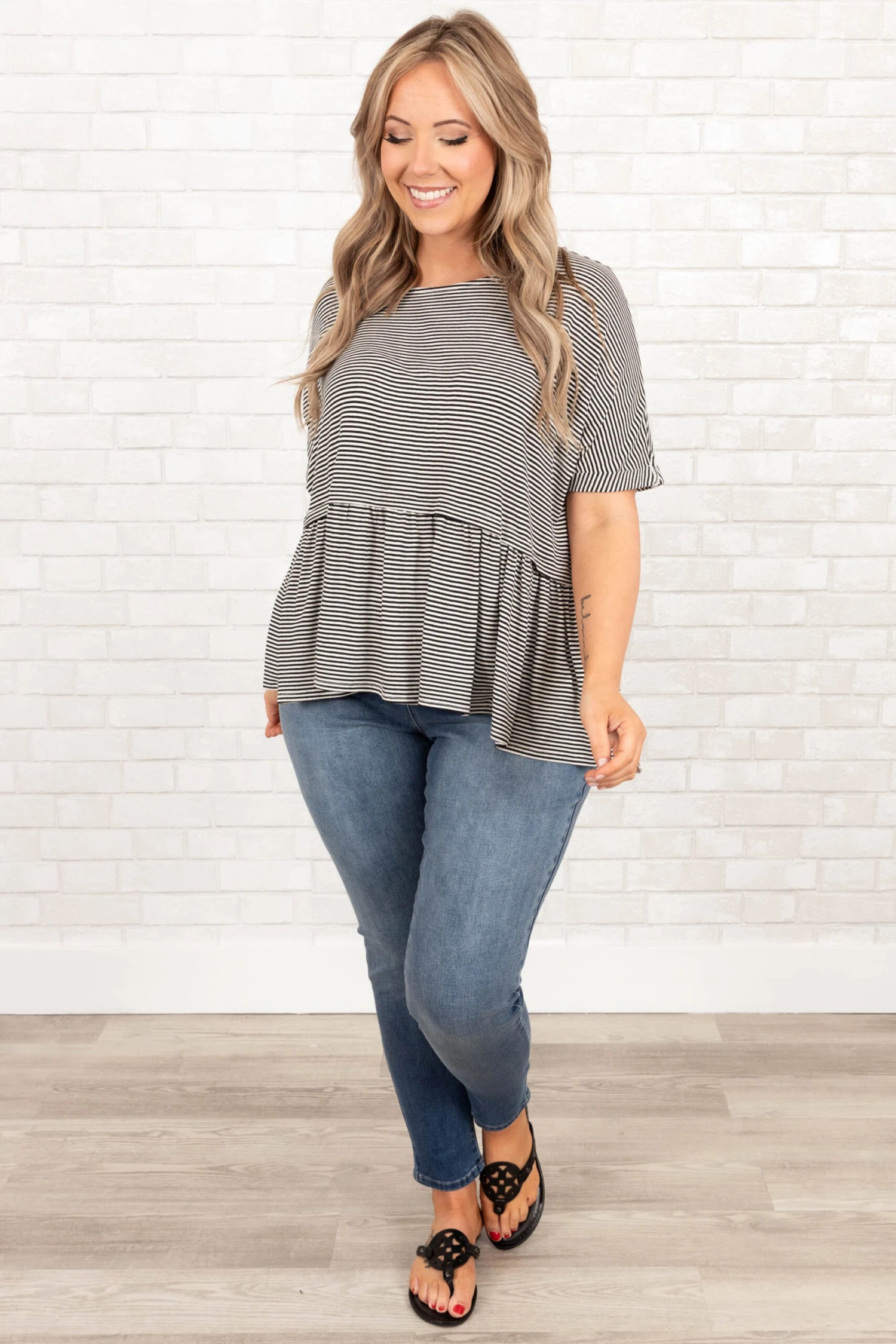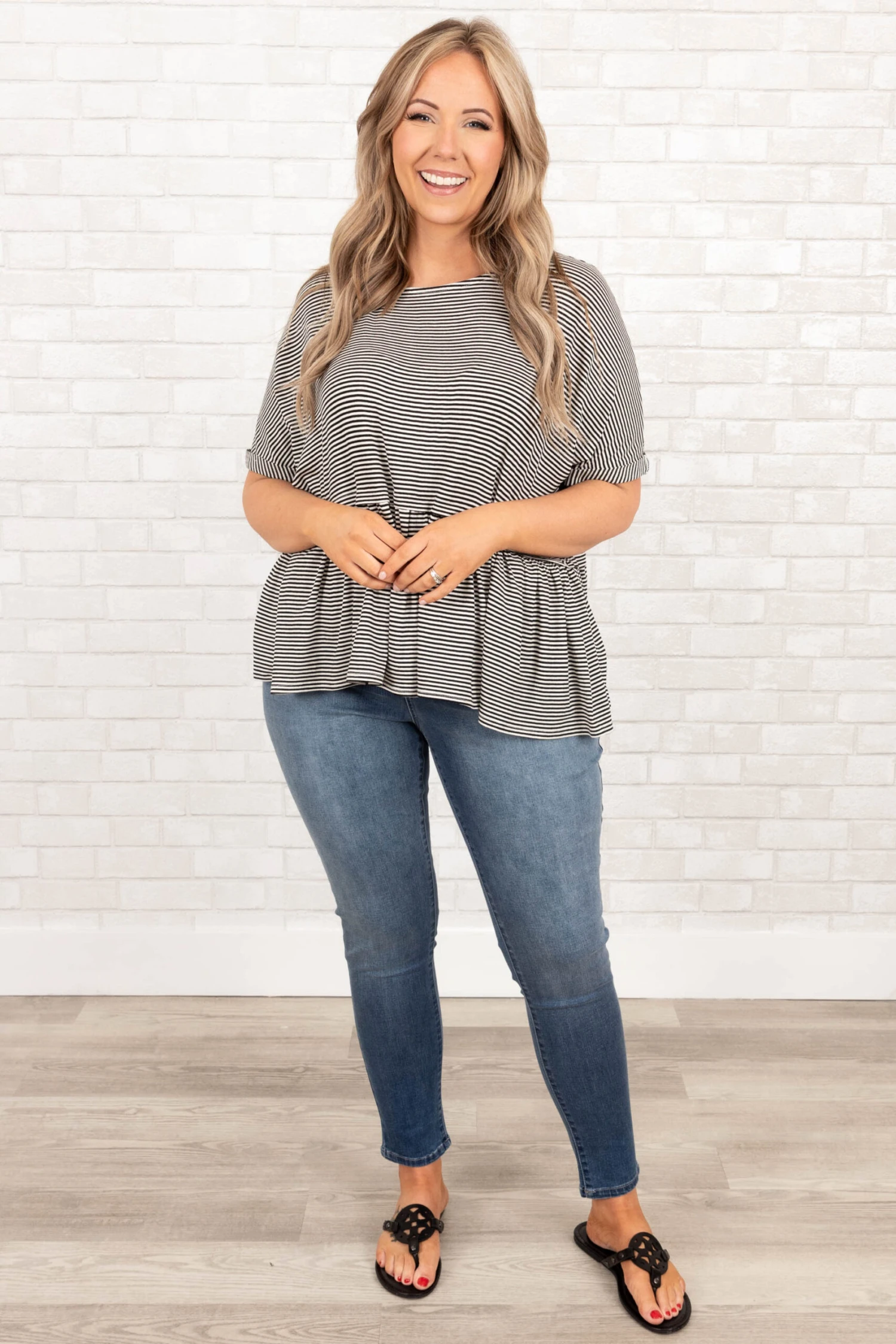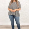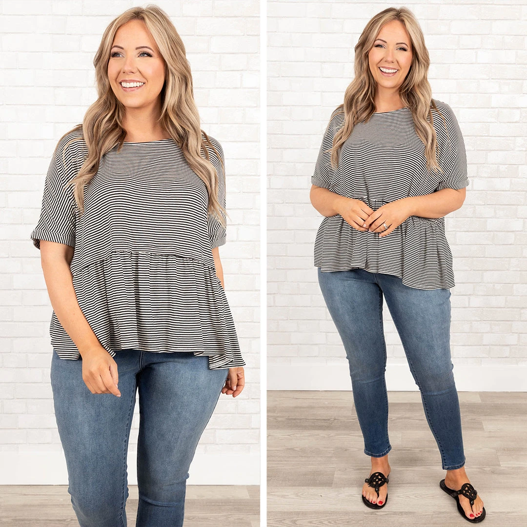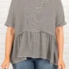 The normal wear and tear has nothing on this top! This cutie has a fun black and white stripe pattern that is so trendy and a super flattering babydoll style that we love! The material is oh so soft and will keep you comfy all day long! Style this with skinnies and sandals for a super stylish look!