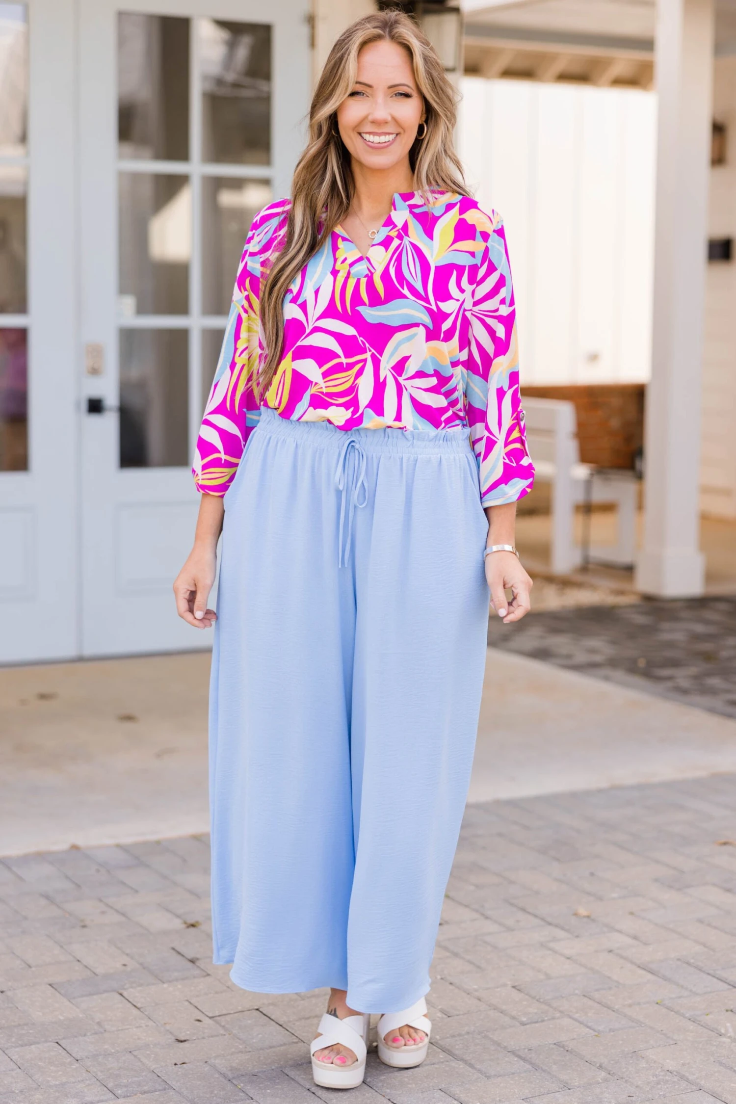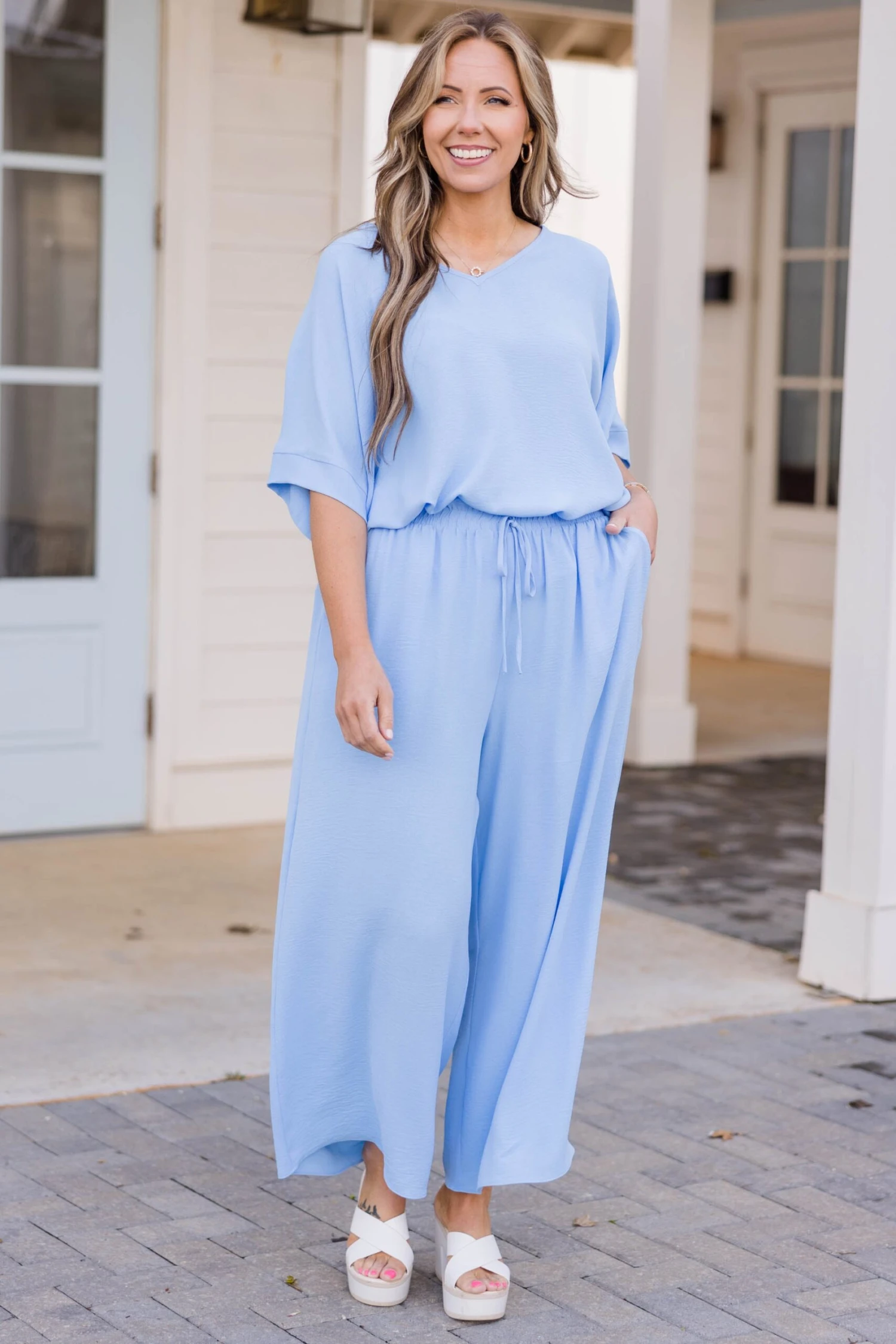 Looking for ways to spice up your weekend style? Our ALL NEW weekend wardrobe is here! These spring blue colored pants offer ultimate comfort and style! The lightweight, wrinkle-resistant material allows for air flow, making them perfect for any casual occasion! Pair it with your favorite tops and accessories for a versatile and chic look!