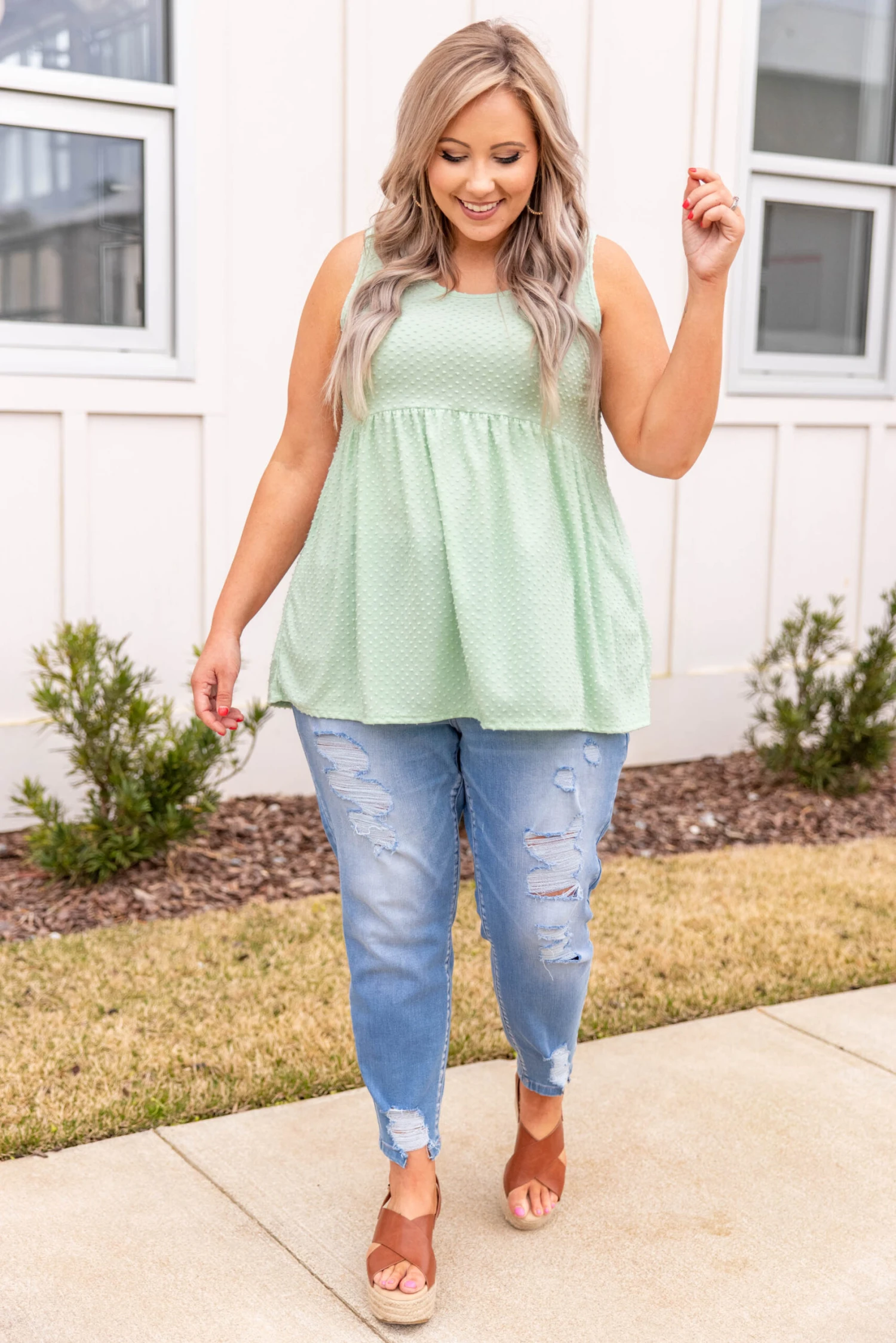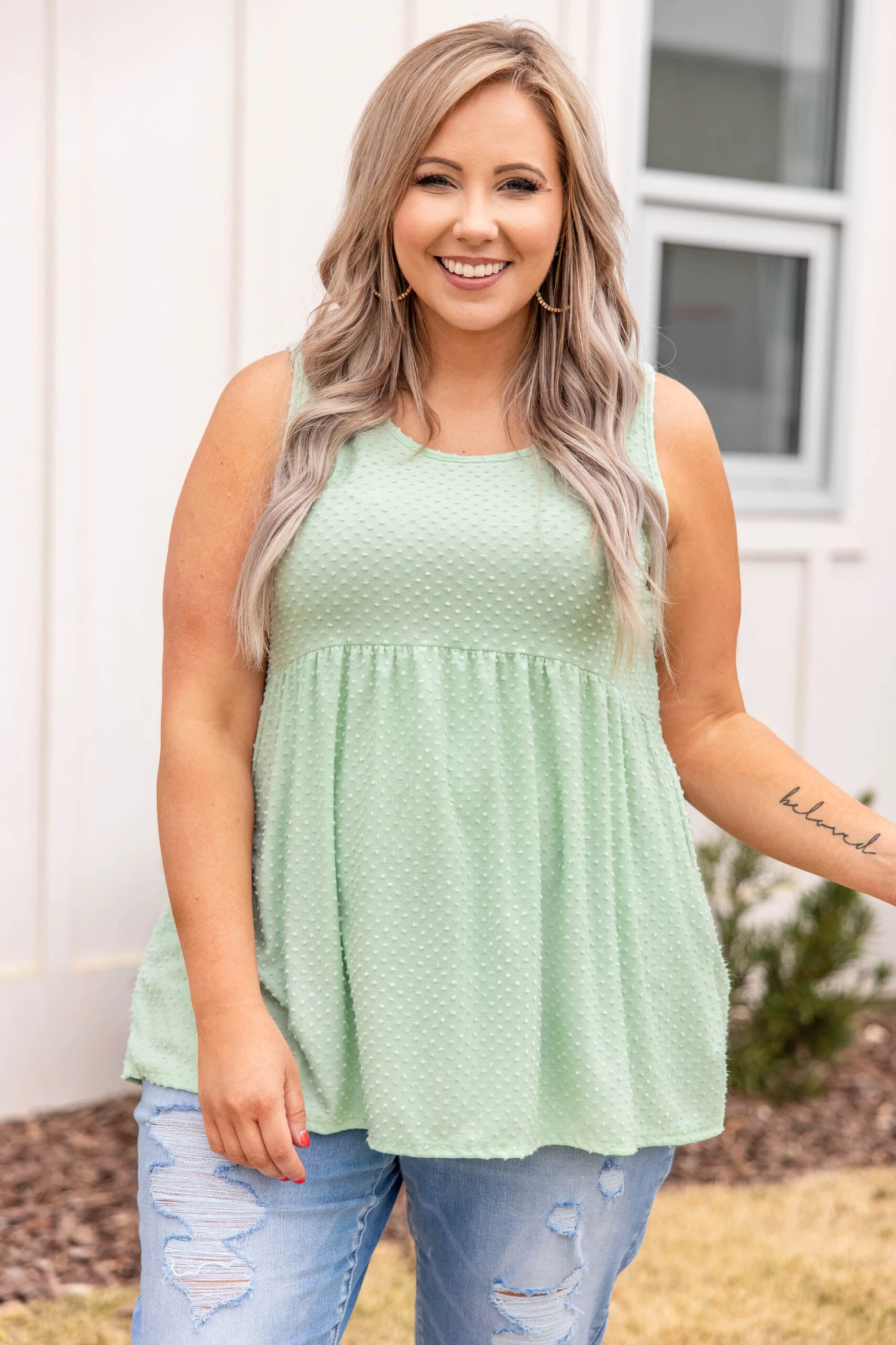 Introducing your new favorite top: The Weekender! Made for wearing beyond the weekend, this tank has a figure-flattering baby-doll fit, a soft fabric to keep you comfortable, and a solid color with a trendy french raised dot print easy to pair with everything in your wardrobe! Dress this top up or down and wear it all season long! Pair it with your favorite shoes and accessories for an effortlessly beautiful look you can own in every color!Â
