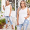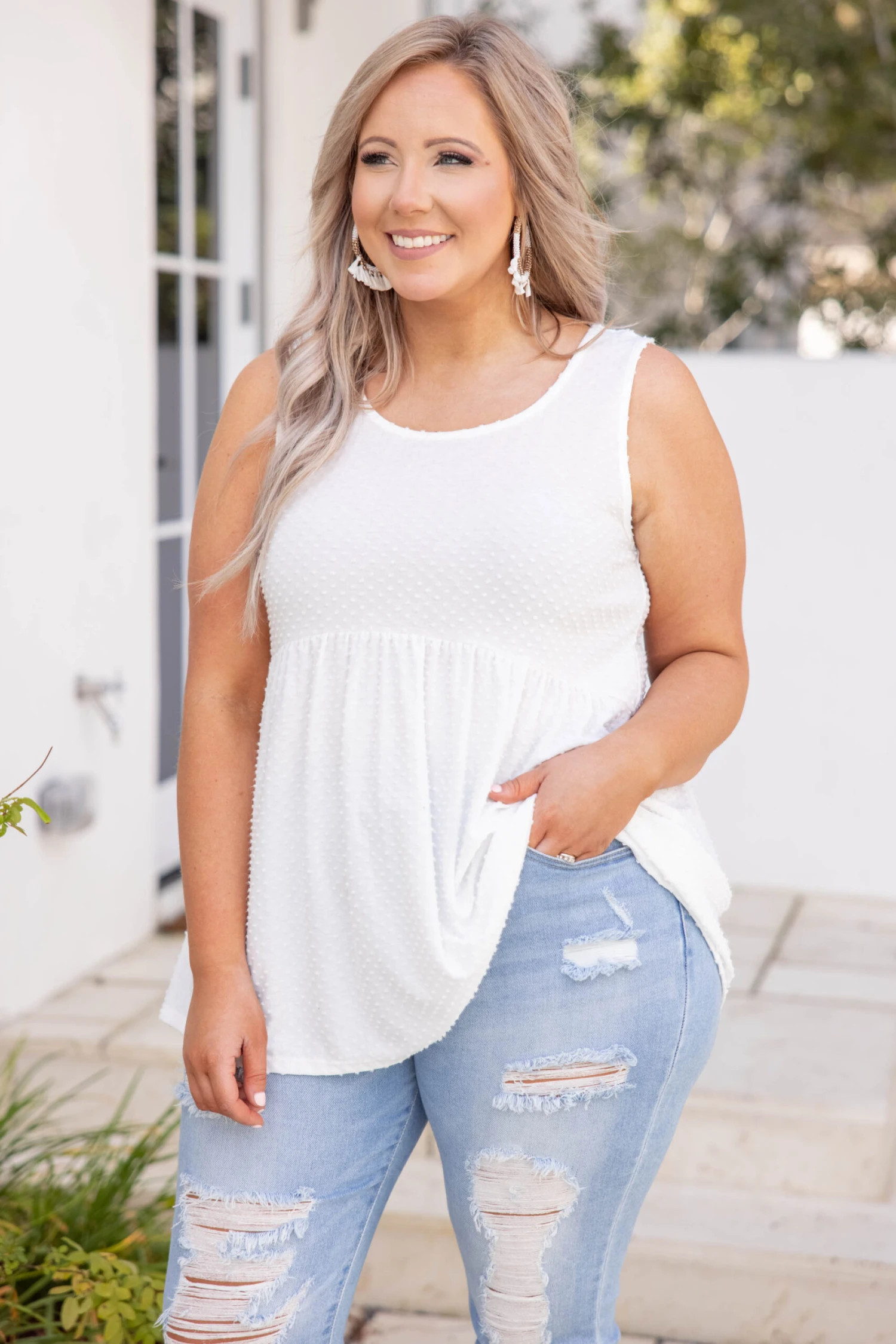 Introducing your new favorite top: The Weekender! Made for wearing beyond the weekend, this tank has a figure-flattering baby-doll fit, a soft fabric to keep you comfortable, and a solid color with a trendy french raised dot print easy to pair with everything in your wardrobe! Dress this top up or down and wear it all season long! Pair it with your favorite shoes and accessories for an effortlessly beautiful look you can own in every color!Â