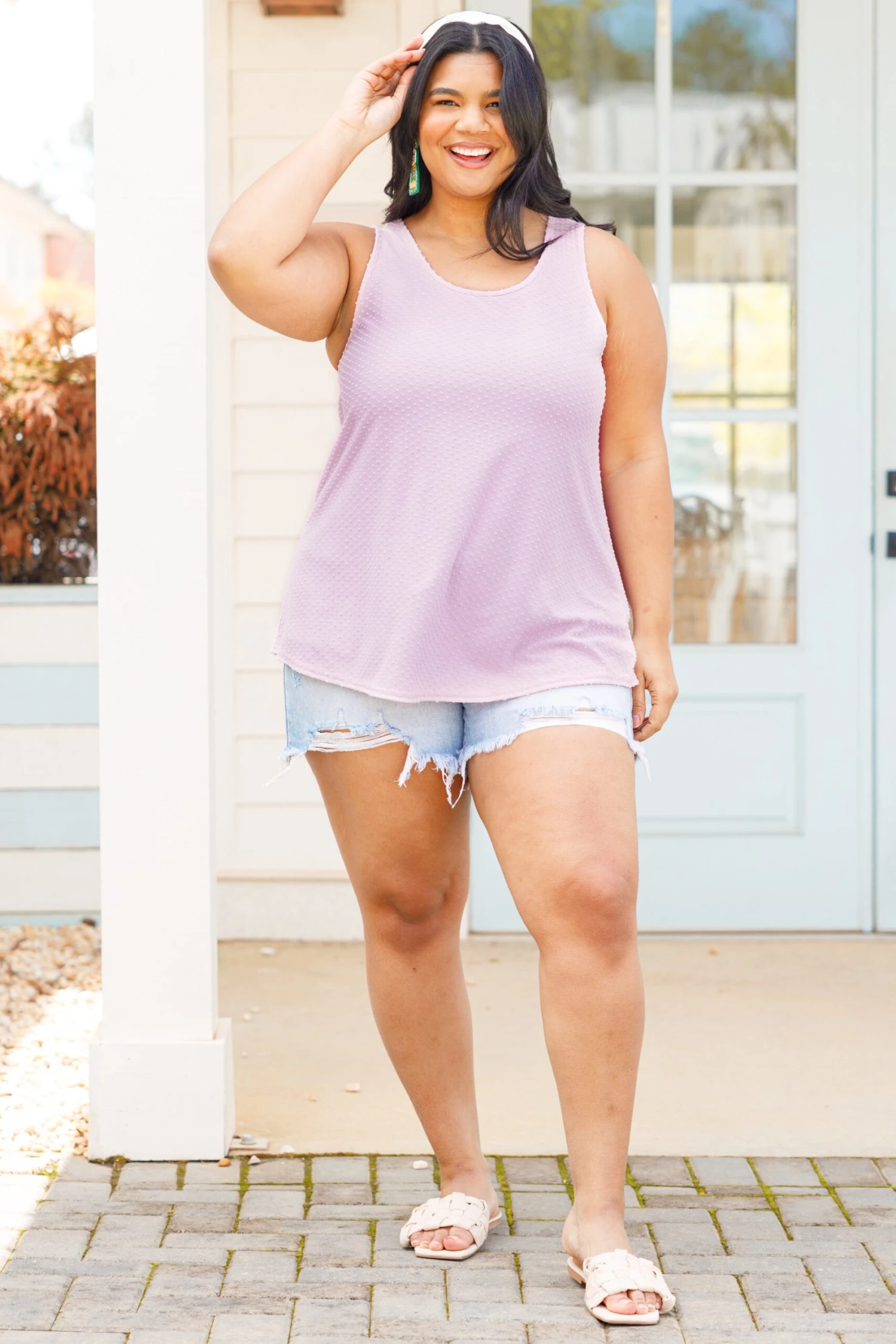 Introducing your new favorite top: The Weekender! Made for wearing beyond the weekend, this tank has a figure-flattering fit, a soft fabric to keep you comfortable, and a lavender solid color with a trendy French raised dot print easy to pair with everything in your wardrobe! Dress this top up or down and wear it all season long! Pair it with your favorite shoes and accessories for an effortlessly beautiful look you can own in every color!Â