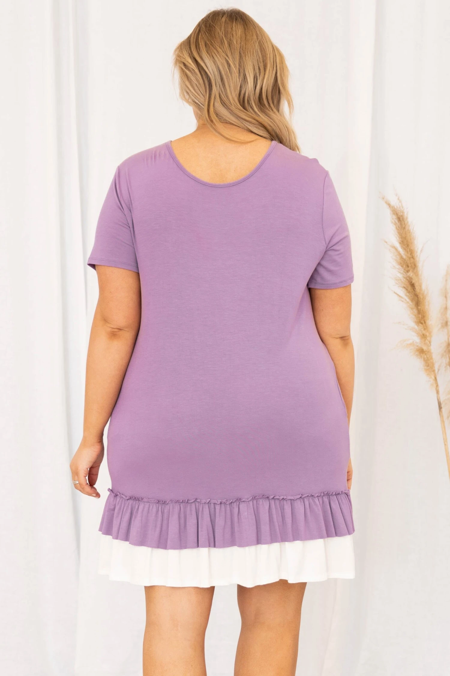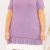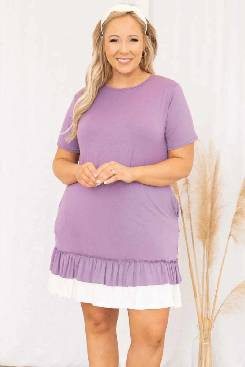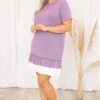 Welcome to our world! This dress is ADORABLE and the lilac color is so sweet! The drop waist hem is so trendy and the ruffles have us obsessing! This cutie is so soft it will have you in comfort all day long making it the perfect dress for a day at work! Style it with a cute headband and heels or wedges for a stylish look!