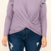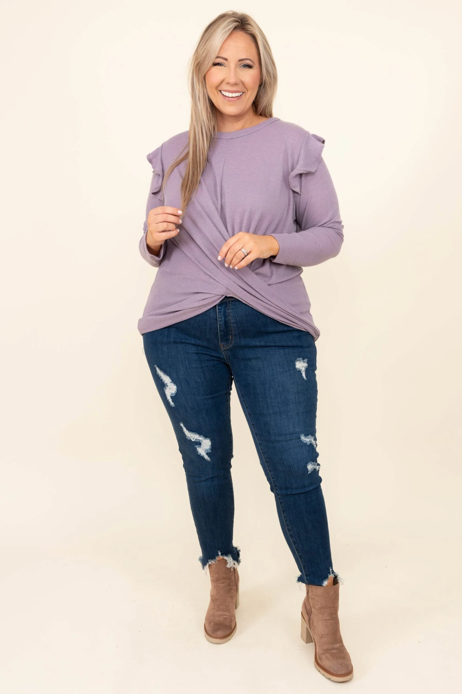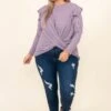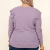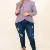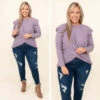 Say hello to this perfect Fall top! We love the chic dusty plum color and ruffle sleeves on this one! It has a figure-flattering fit and is sure to keep you warm all season long! Pair this top with skinnies and booties for a trendy winter look!Â