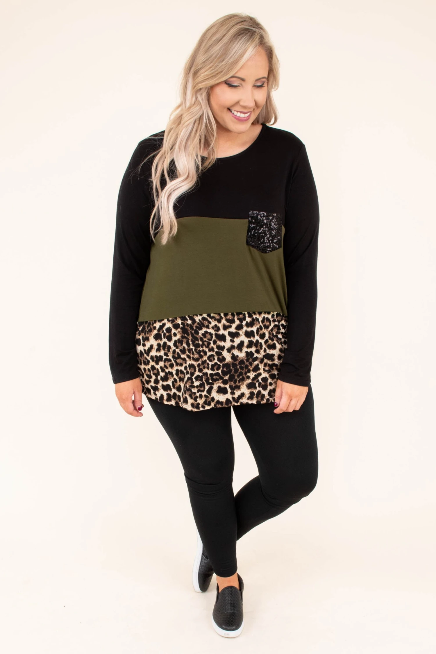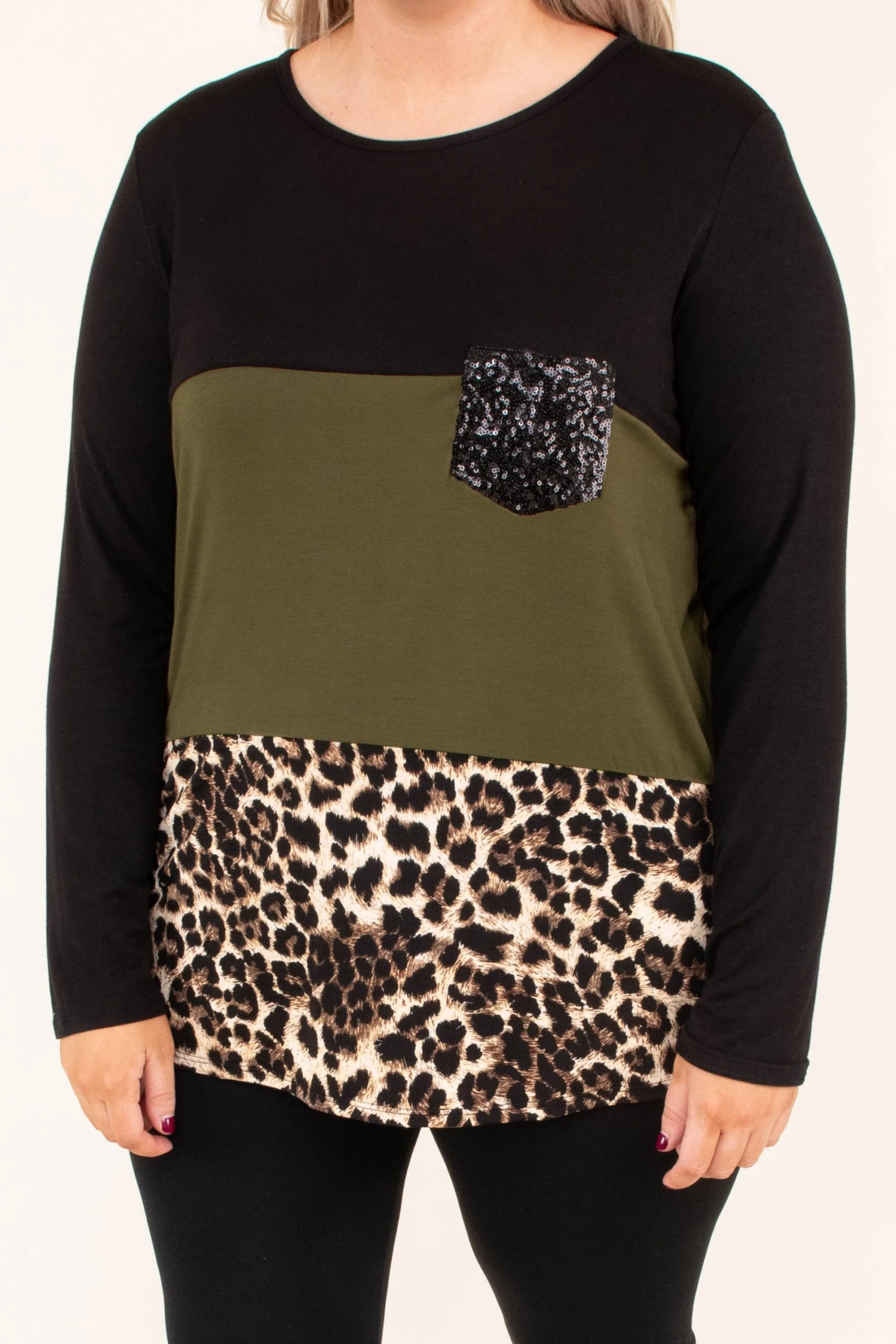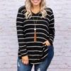 We have this top in mind for your wardrobe! This top has a trendy color block pattern with just the right amount of color for a look you can easily style! It’s comfortable, figure-flattering, and even has a glittery pocket! Simply, pair this top with skinnies and booties for an effortlessly chic look!