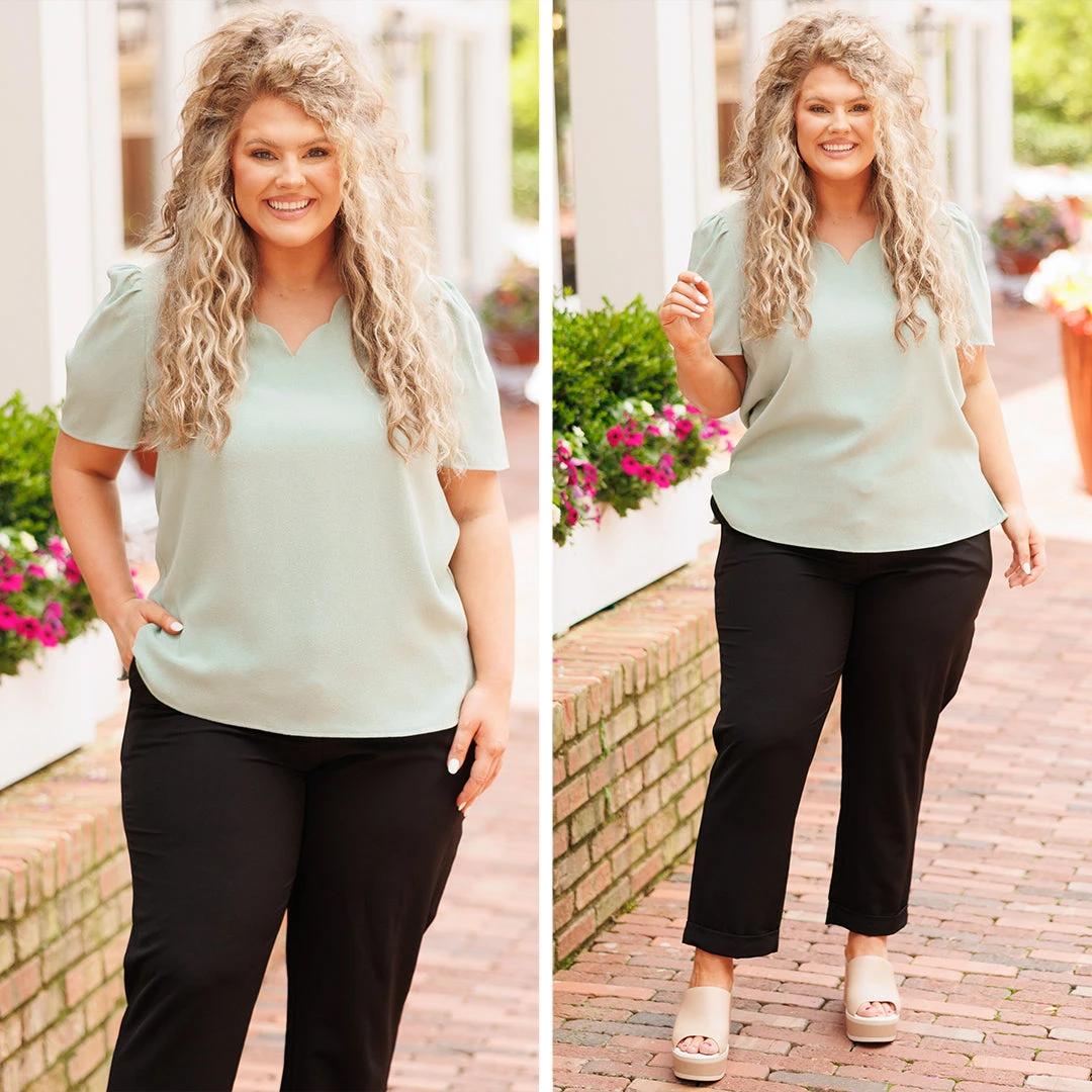 This lovely top is a great addition to your wardrobe! Its timeless scallop neckline and lovely sage color makes it perfect for a day at the office! With ultimate comfort, it’s sure to become a wardrobe staple!