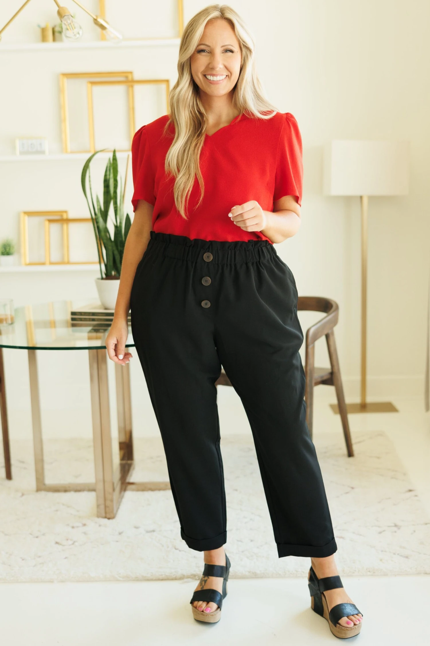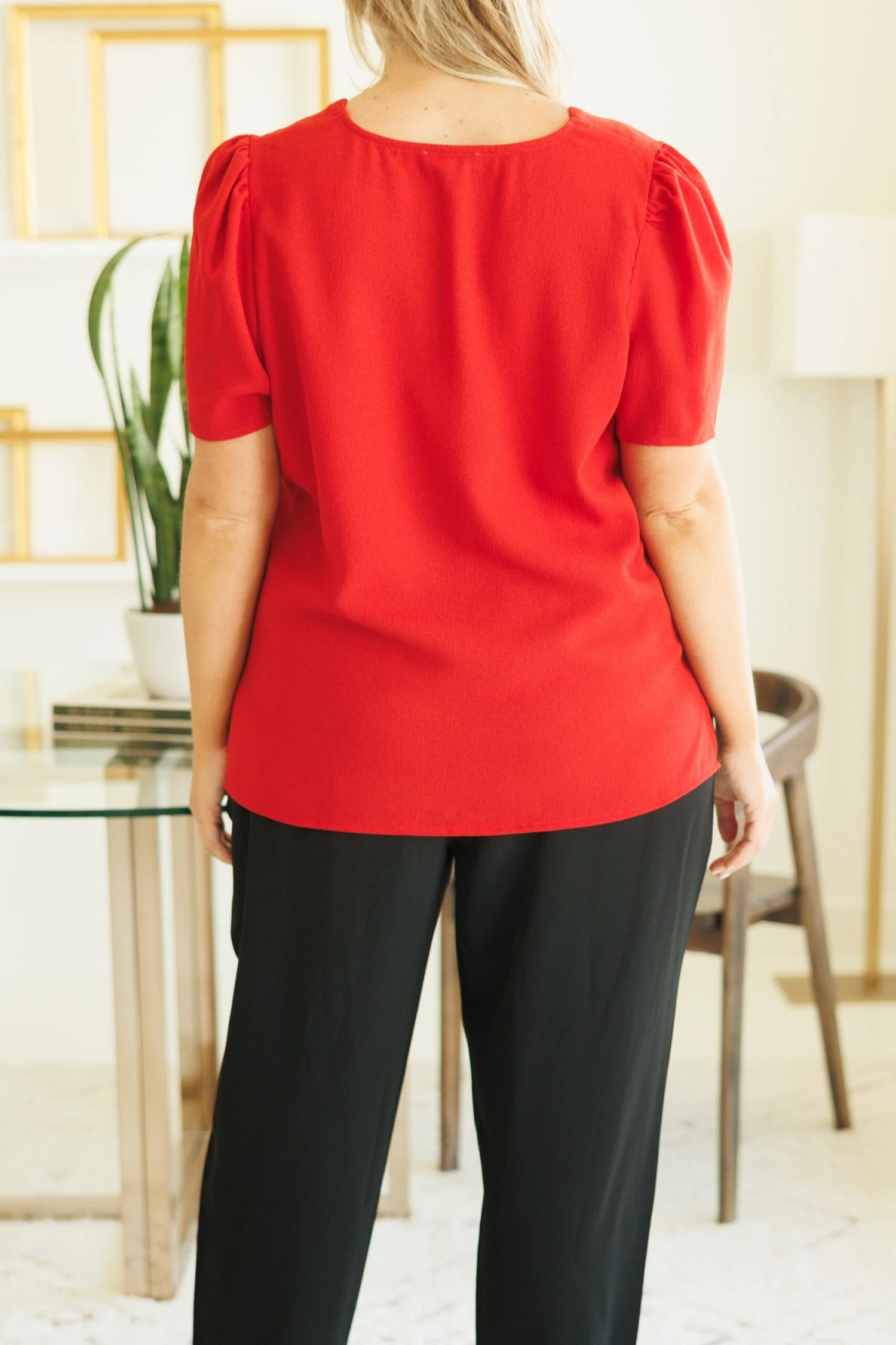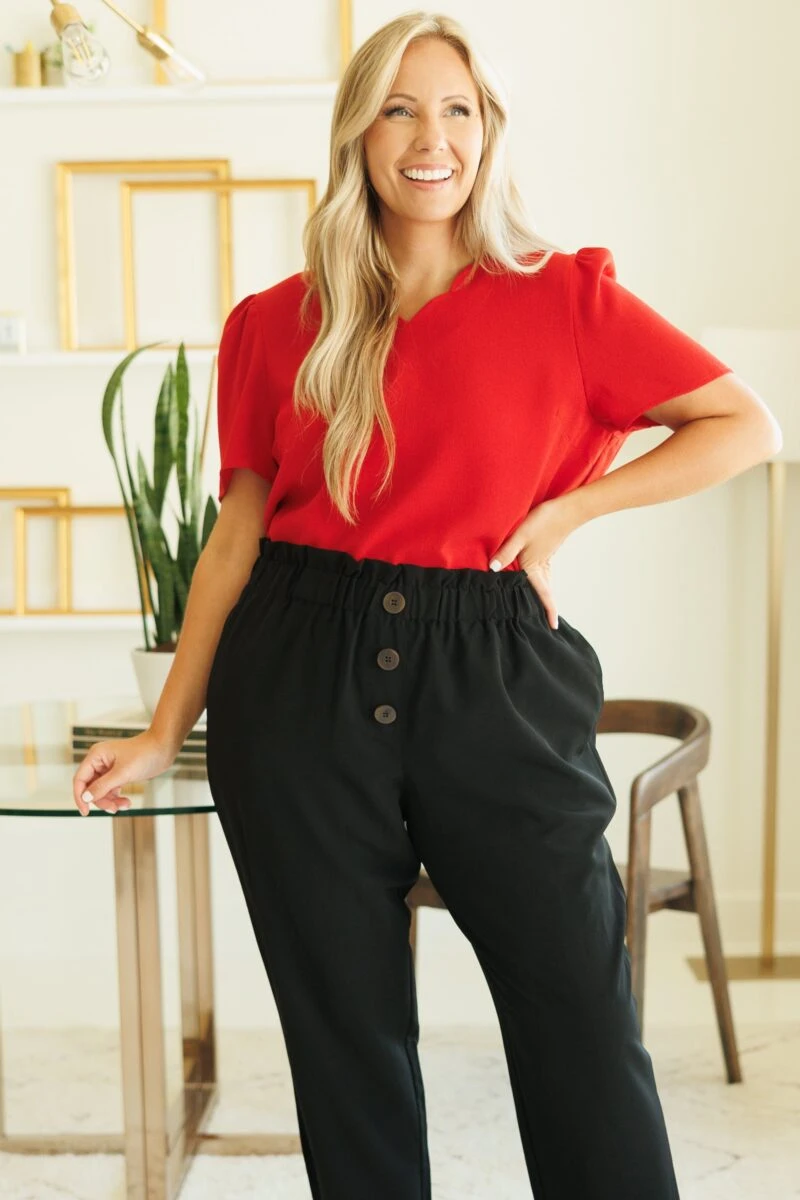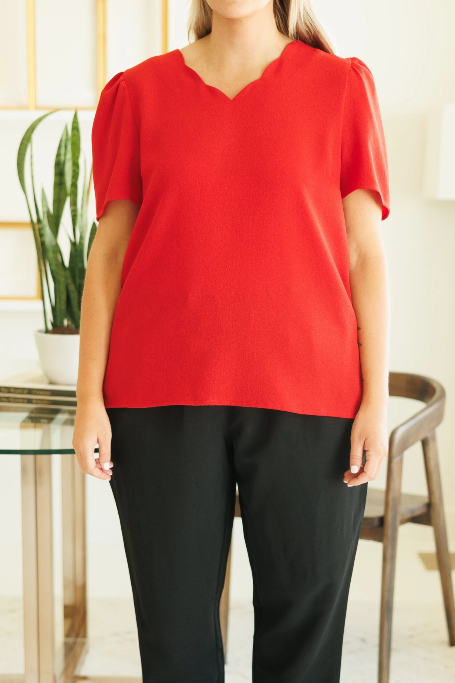This lovely top is a great addition to your wardrobe! Its timeless scallop neckline and vibrant red color makes it perfect for a day at the office! With ultimate comfort, it’s sure to become a wardrobe staple!