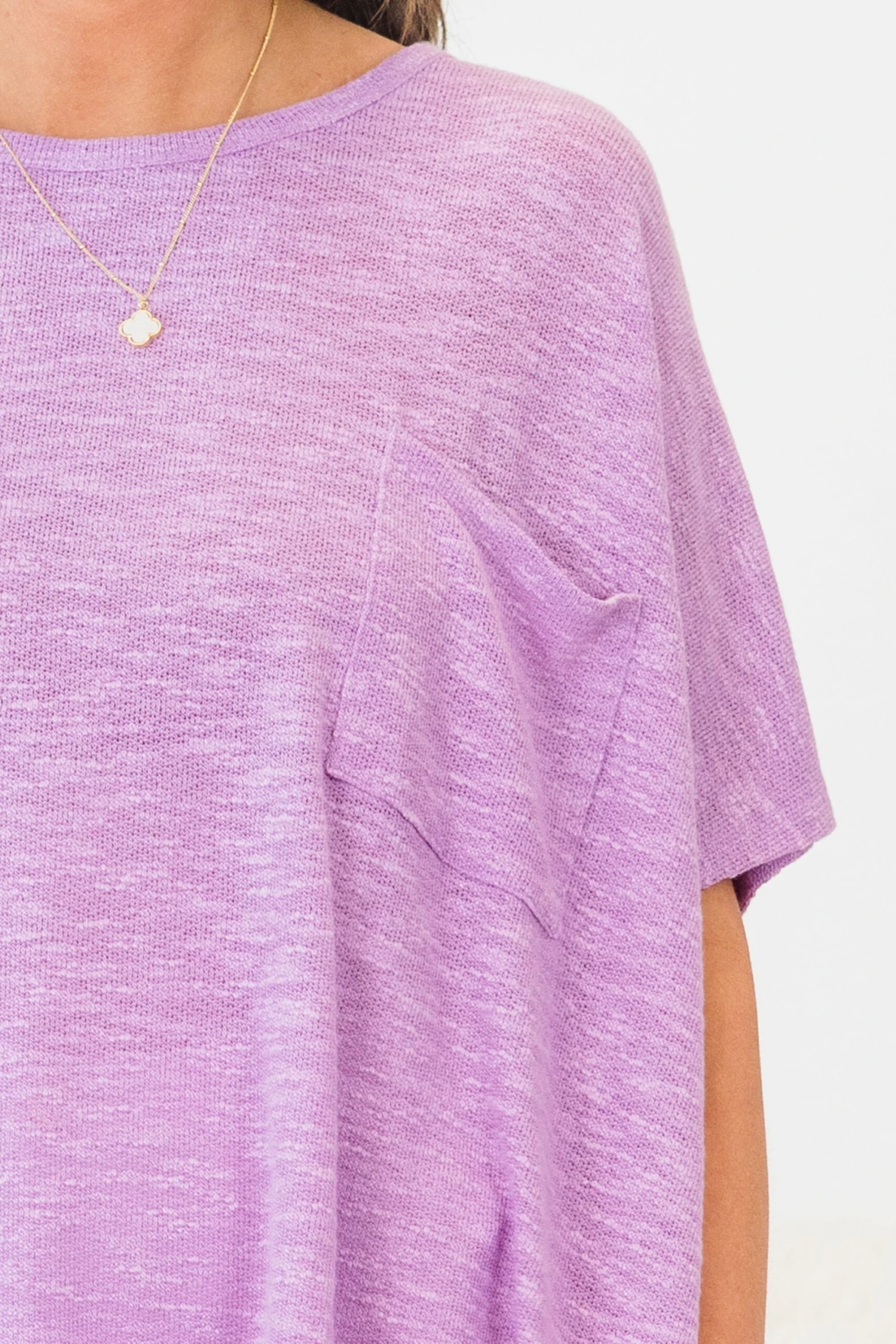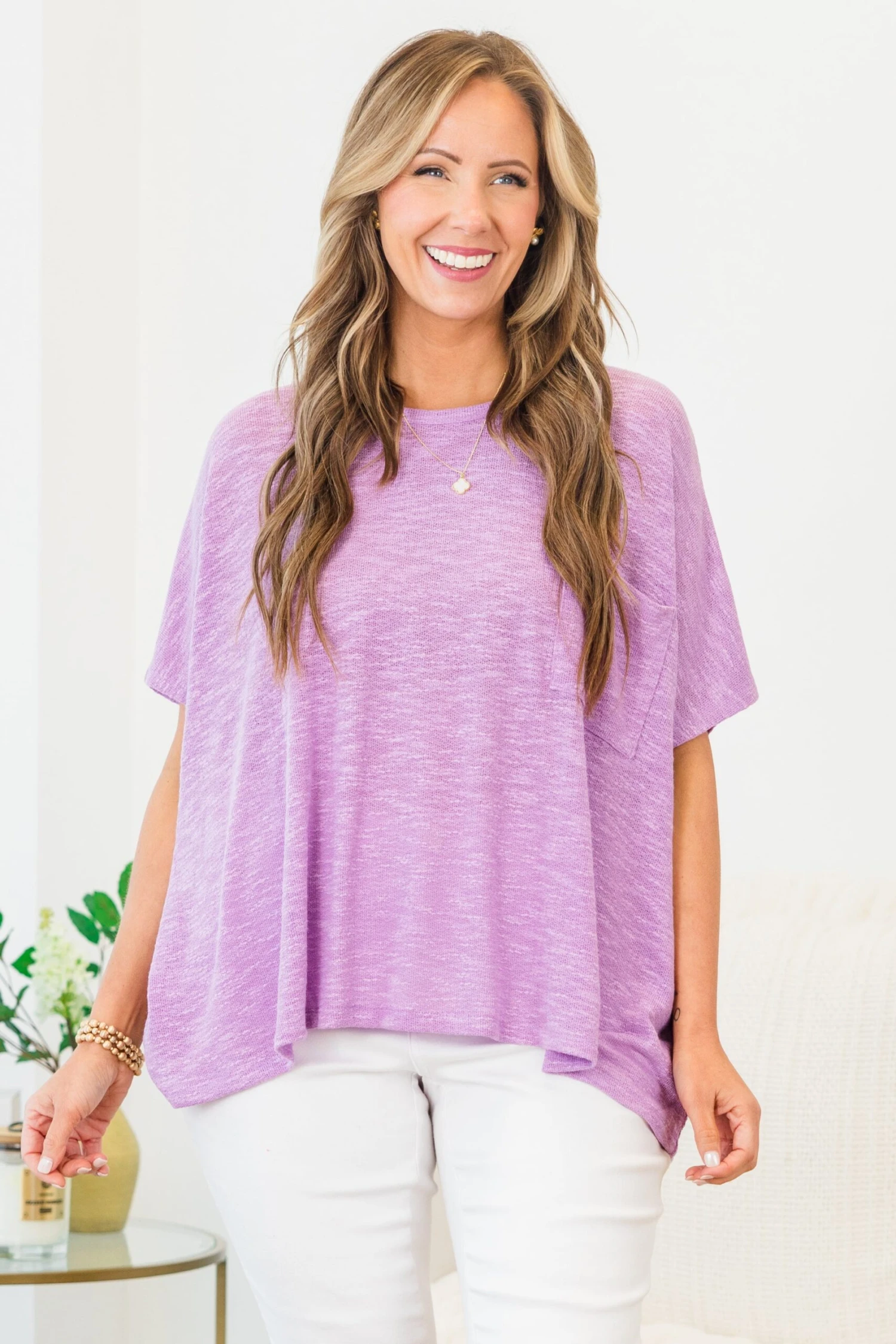 Add a touch of chic simplicity to your wardrobe with this top! This bright lavender knit top features a convenient chest pocket and a classic round neck, making it a versatile and stylish addition to any outfit! Stay comfortable and fashionable with this must-have piece!
