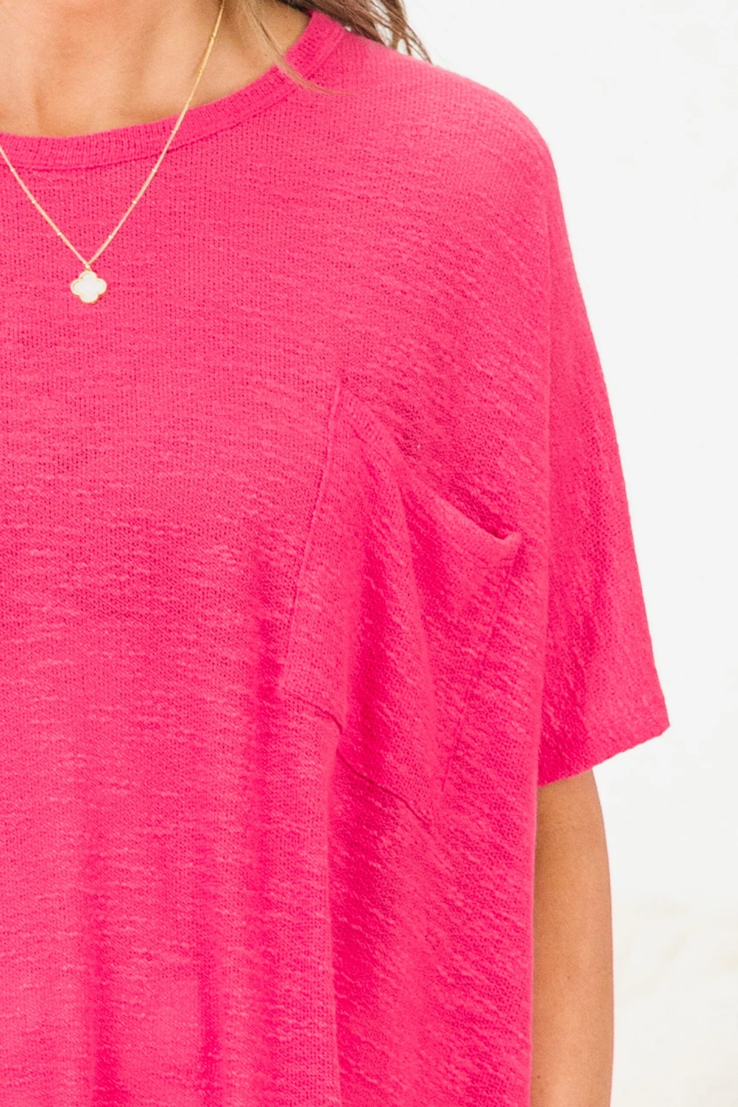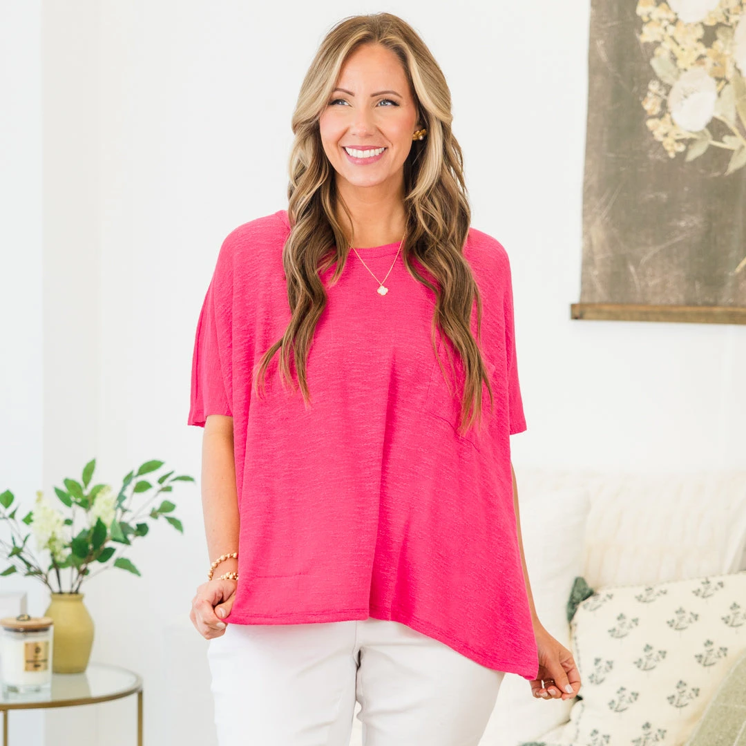 Add a touch of chic simplicity to your wardrobe with this top! This hot pink knit top features a convenient chest pocket and a classic round neck, making it a versatile and stylish addition to any outfit! Stay comfortable and fashionable with this must-have piece!