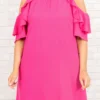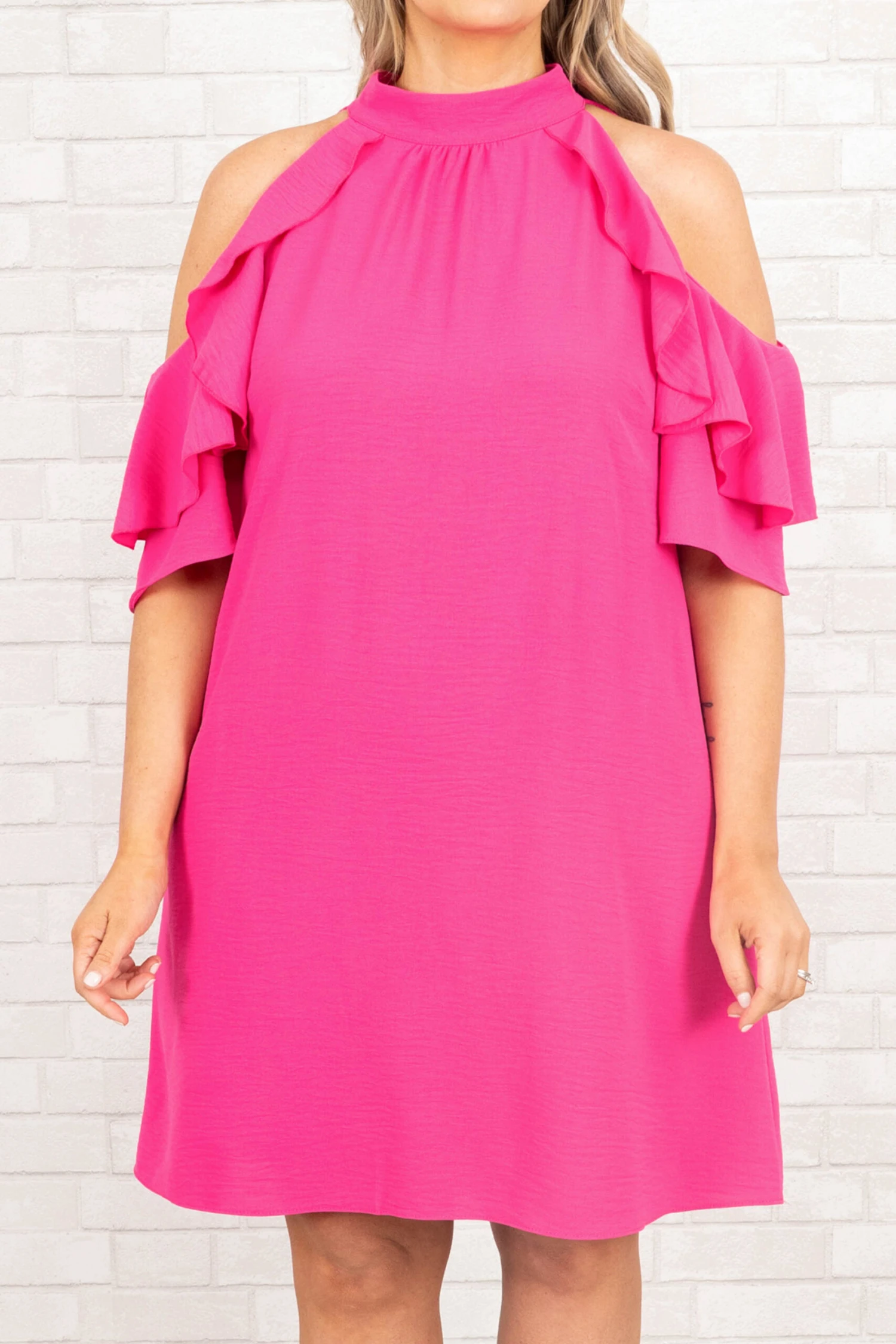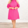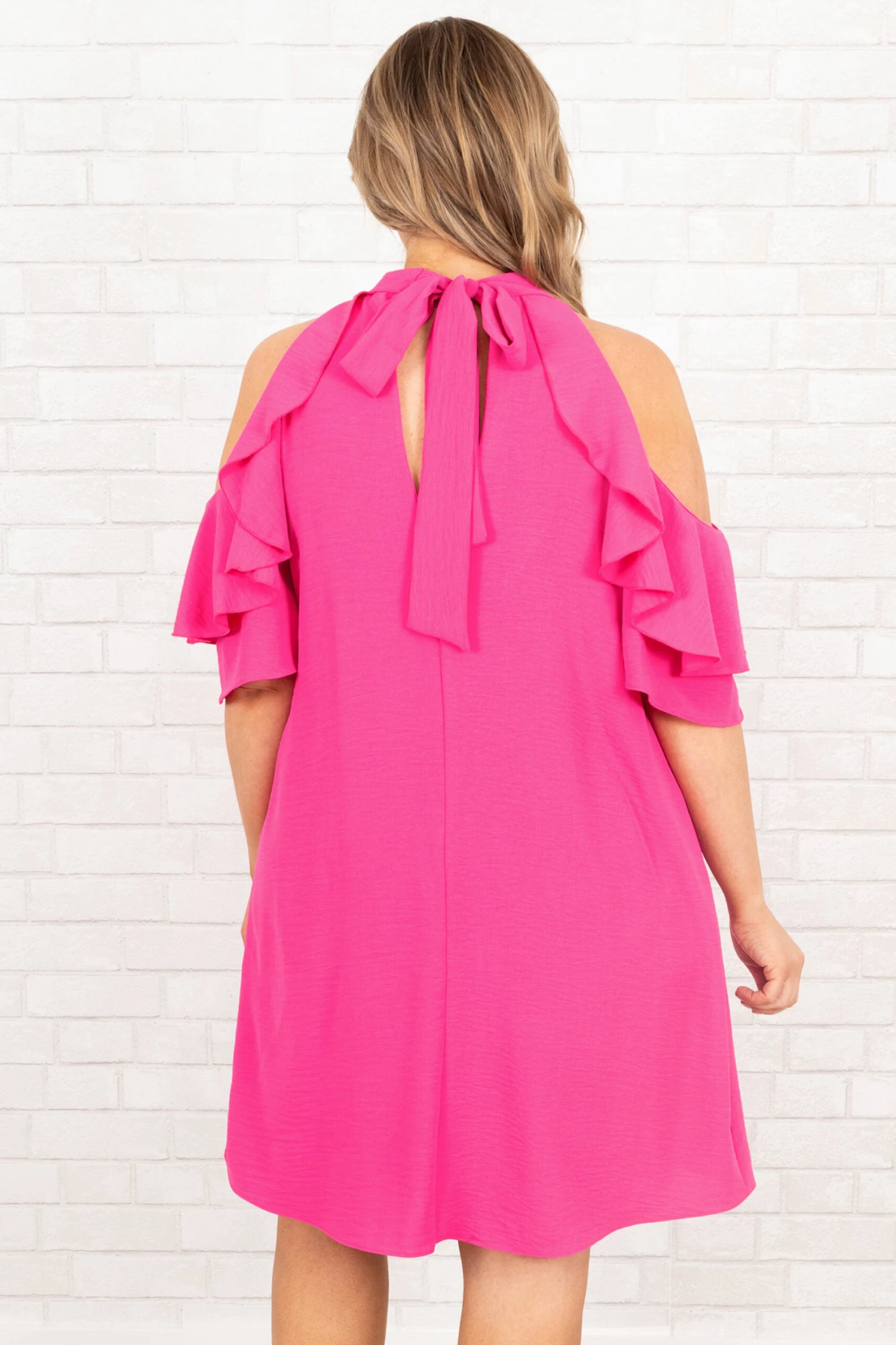 What would you do for this dress?! We are absolutely in LOVE with this dress! It has a bold hot pink color you can dress up or down with a trendy design that will flatter your figure in all the right ways! The cold-shoulder design is too cute, and have you seen those ruffles?! Wear this dress with heels or wedges for your next event!Â